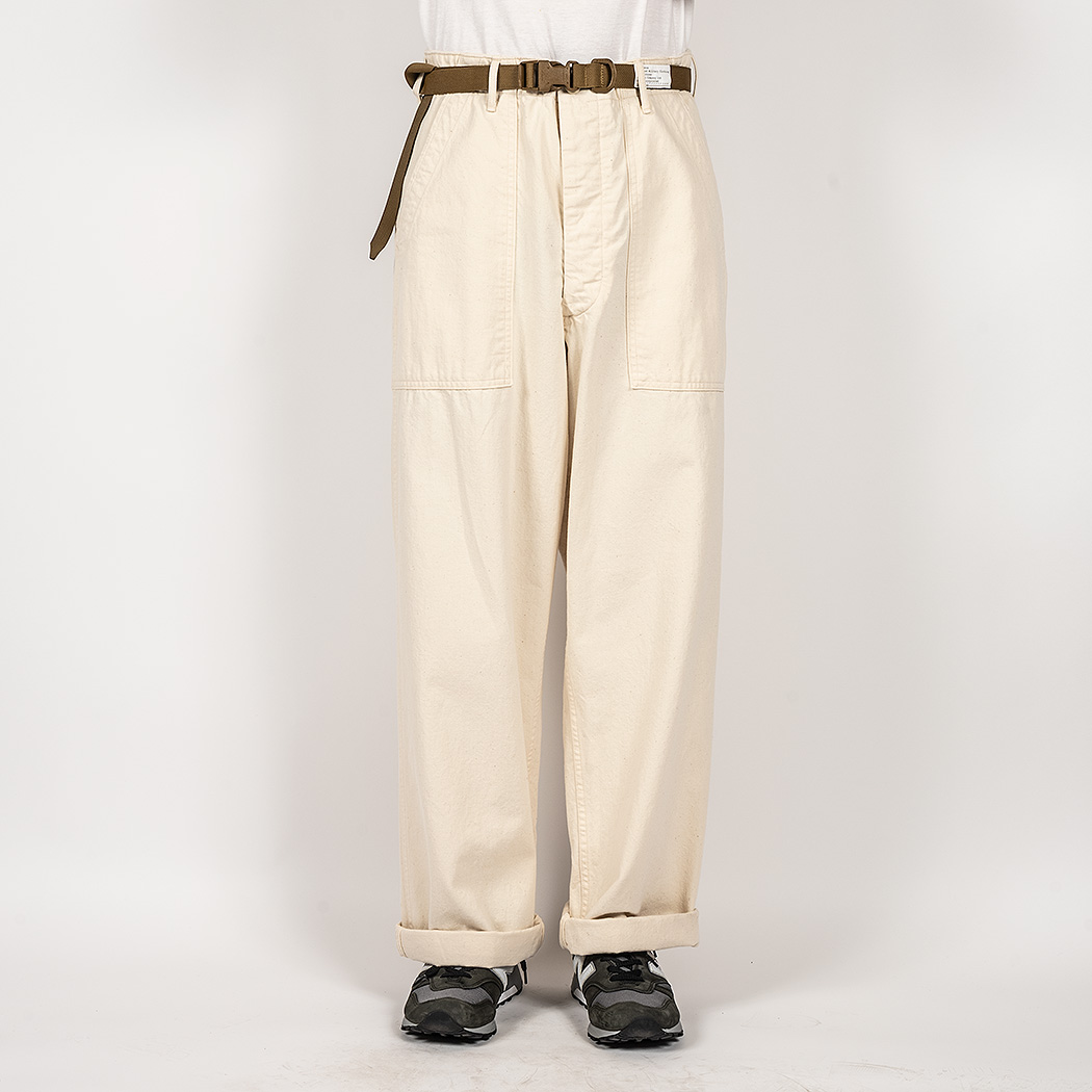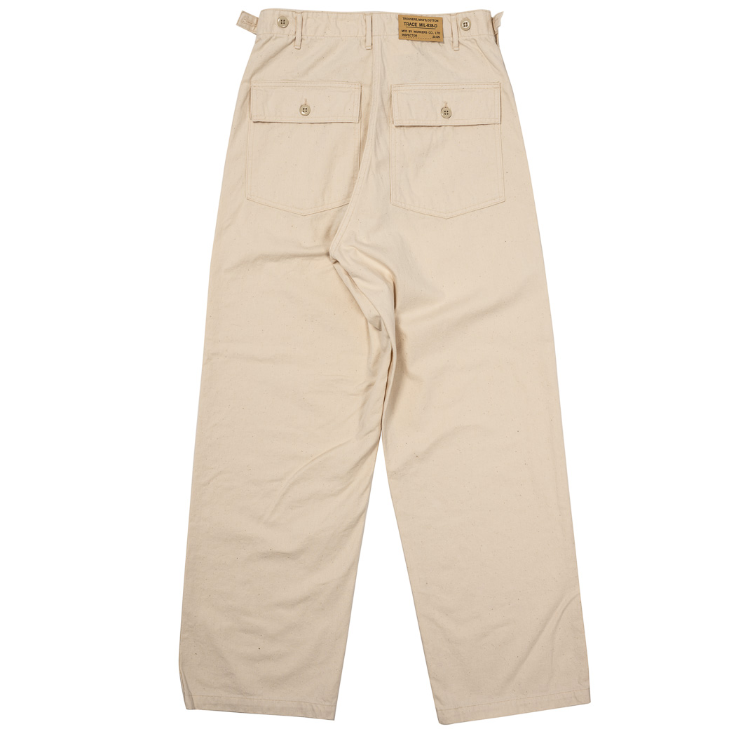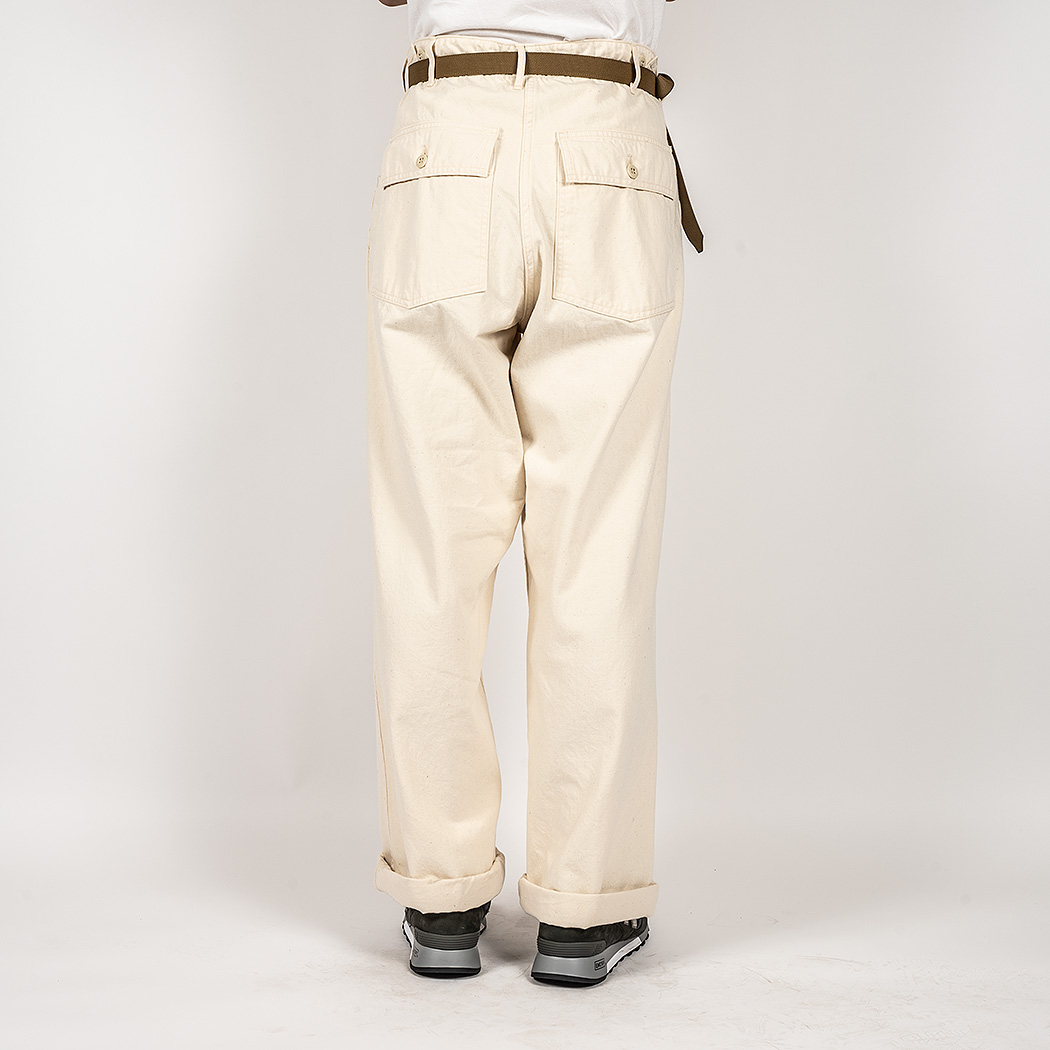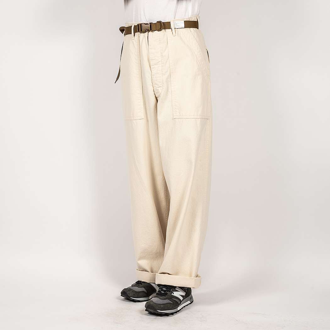 具体的には、解体したデッドストック、MIL-T-838Dからトレース。太い裾、広いワタリ、深めのまた上。いわゆる「軍パン」のシルエット。