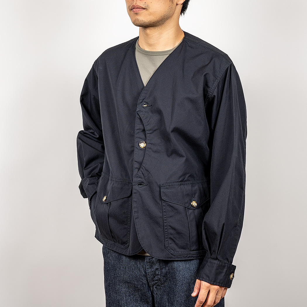 前丈を伸ばし、ポケットをギリギリまで下げる。襟回りはベストと同じカラーレス仕様に変更。袖口も広すぎず、狭すぎないよう微調整して出来上がったのが最終サンプルです。