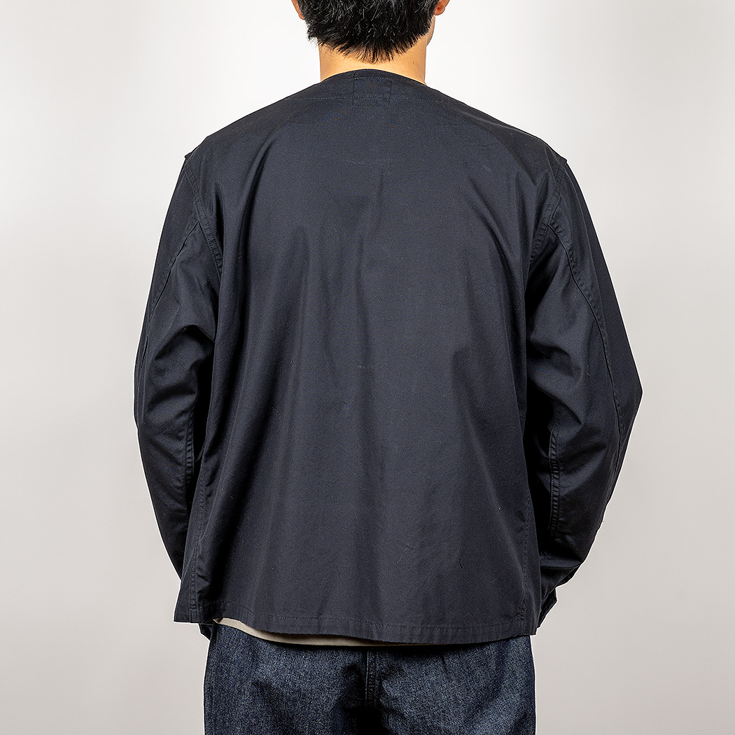 素材、40番双糸、高密度平織りのポプリン。クラシックなアウトドアウェアをモチーフにしたW&Gなどで良く使われるような素材。6.2オンスと軽めですが、フロントは二重なのでブルゾンに適したしっかりした厚み・重みになっています。シャツの上はもちろん、Tシャツの上に羽織りものとしても。 |
