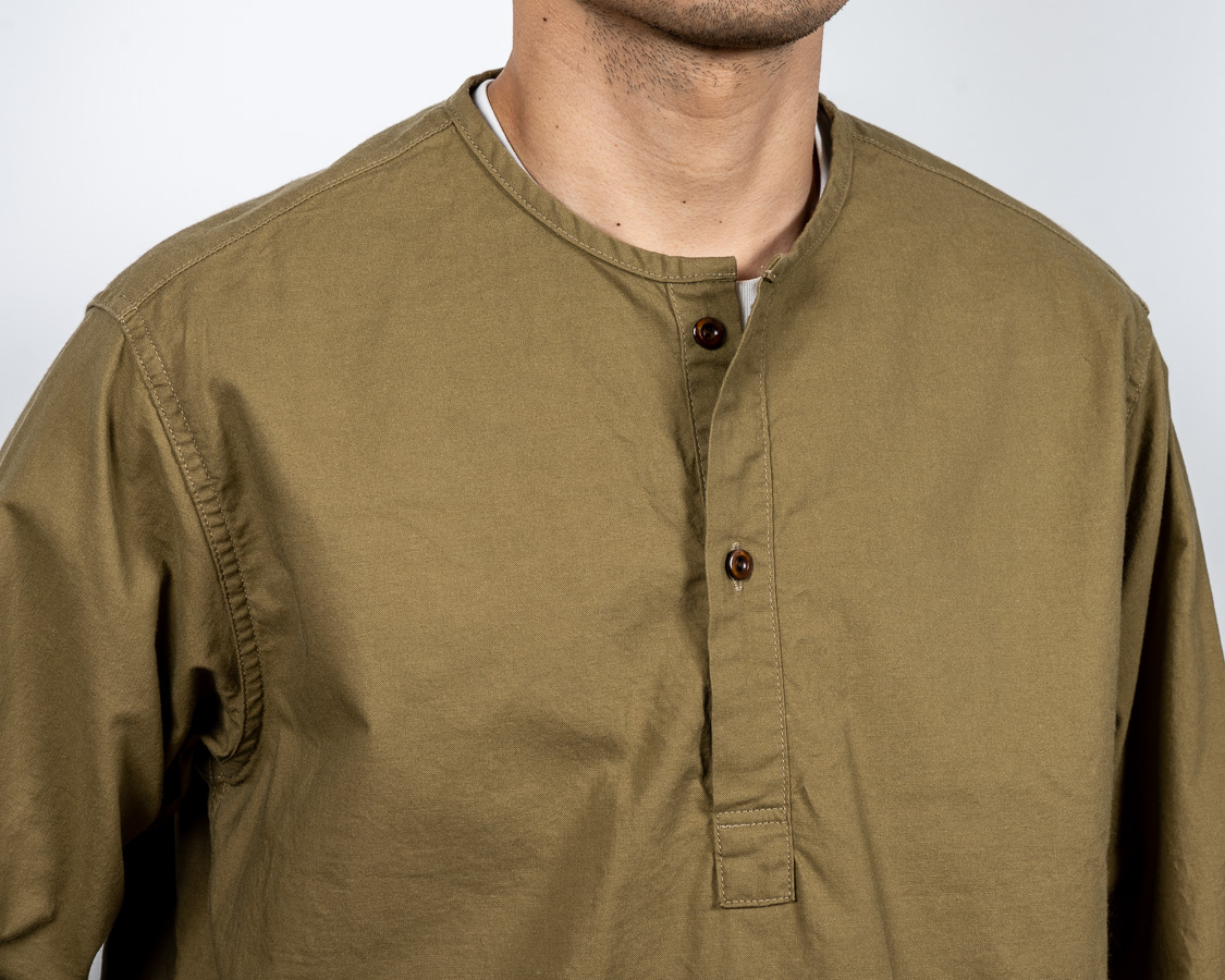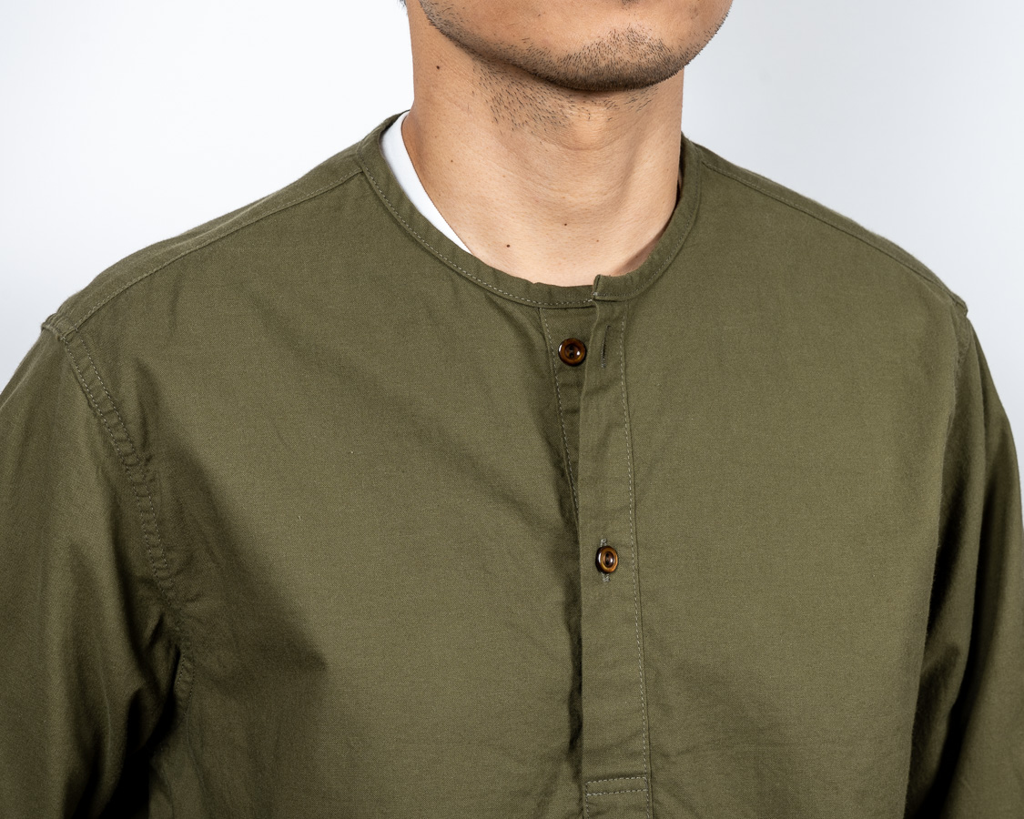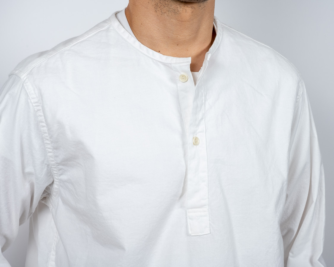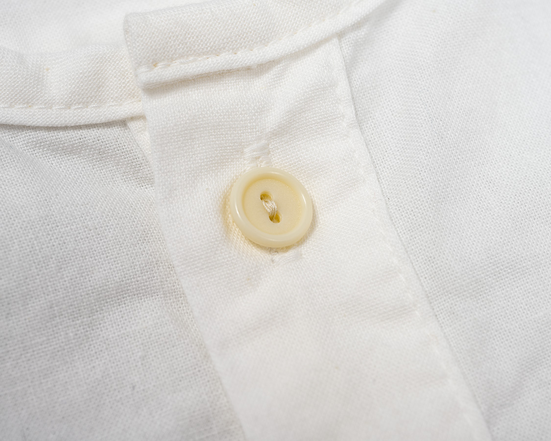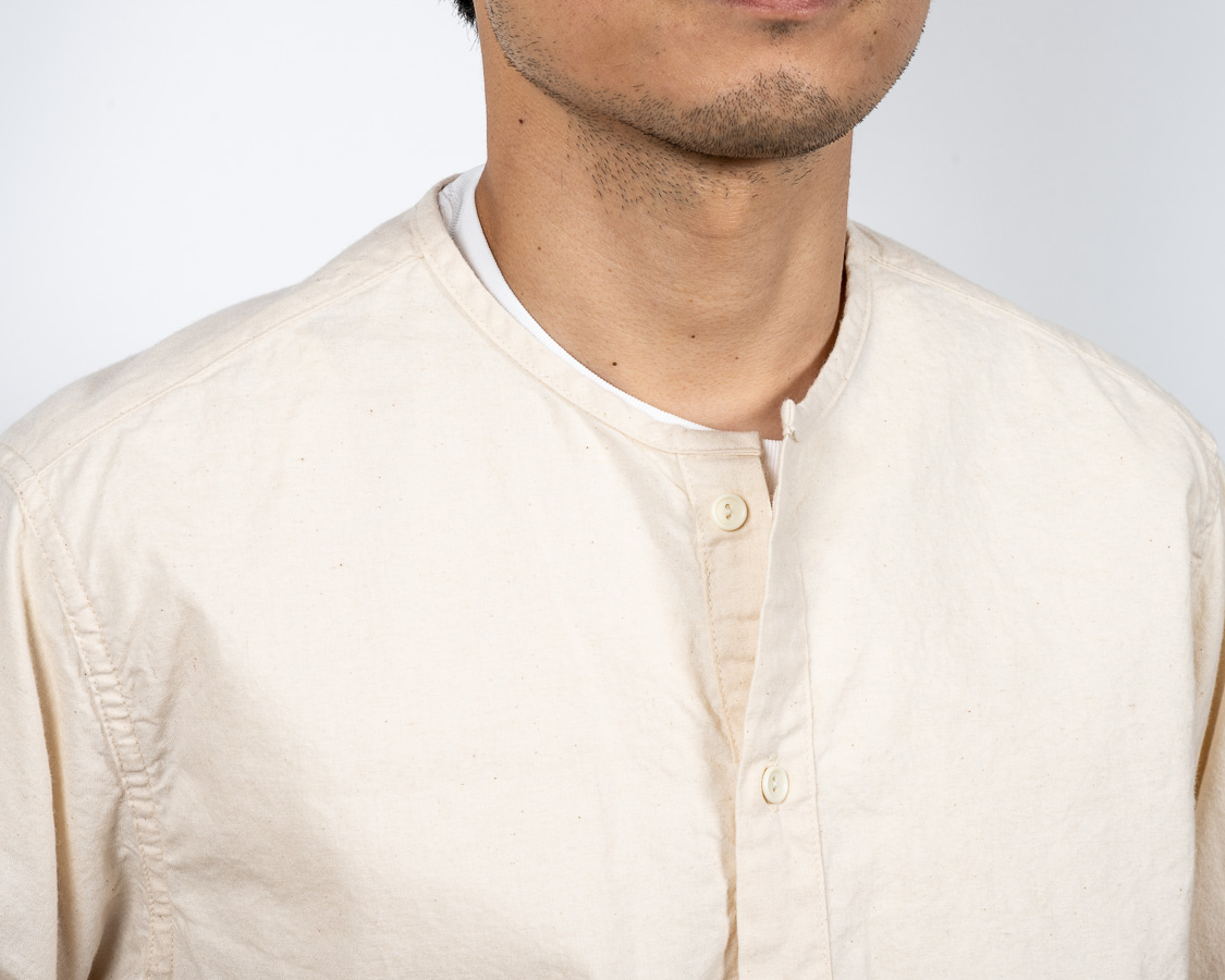 首回りはパイピング始末。スタンドカラーと違い、身頃を完全にパイピング状にくるむ。襟が立たないというか。だから、身頃の襟回りは通常のシャツよりわずかに首側に出しています。それをパイピングすると、最初の写真たちのような「Tシャツが見えるか見えないか」のちょうどよい寸法になります。