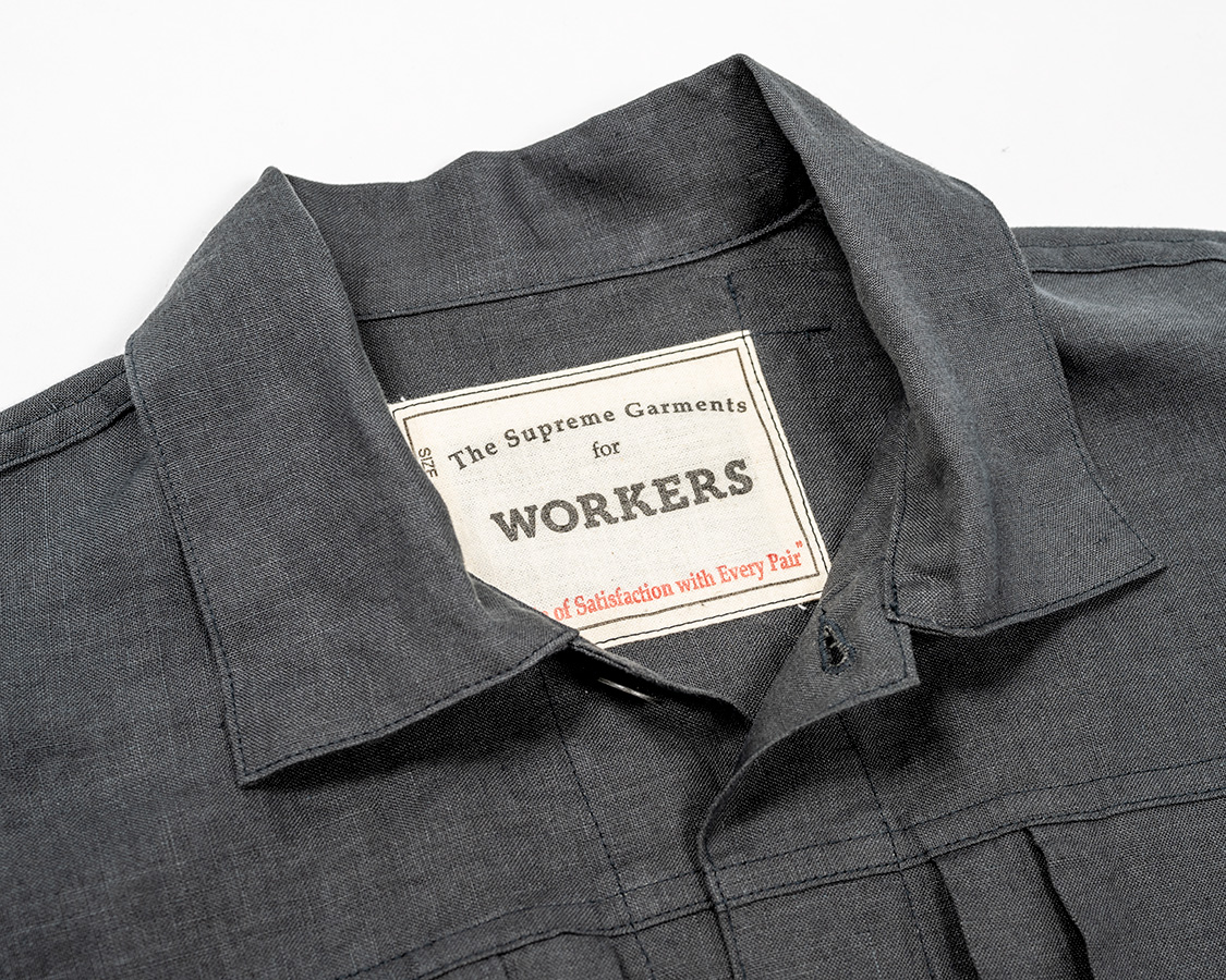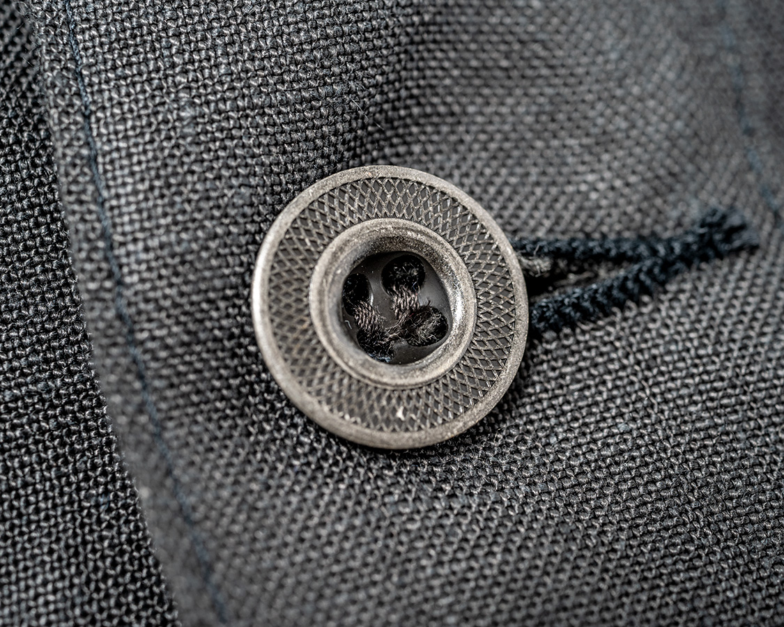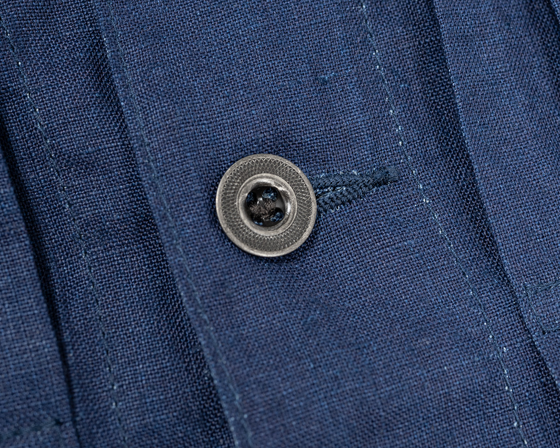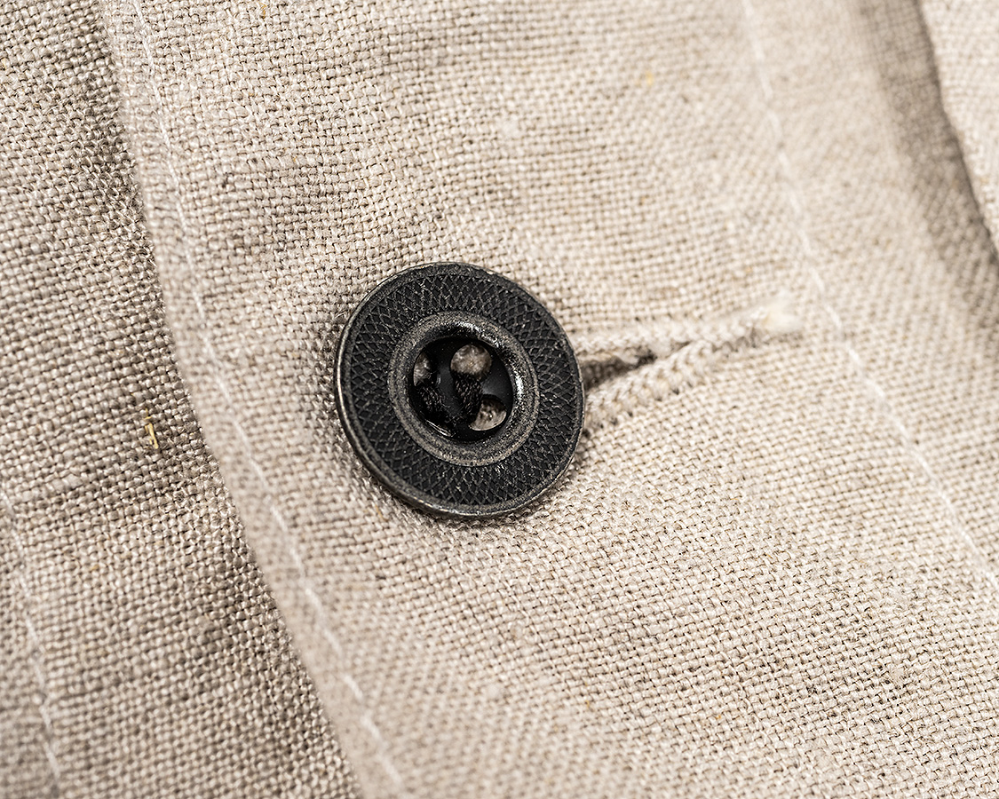 ボタンは金属。椰子などの天然素材も考えましたが、クラシックなワークウェア=金属ボタン というイメージで採用しました。刻印、塗装の雰囲気も製品の力強いデザイン、でもリネンの素材感に合っていると思います。また、糸付けのボタンで比較的軽いのもポイント。ここにタックボタンを打ち込んでしまうと重さに生地が耐えられず垂れ下がってしまうのです。