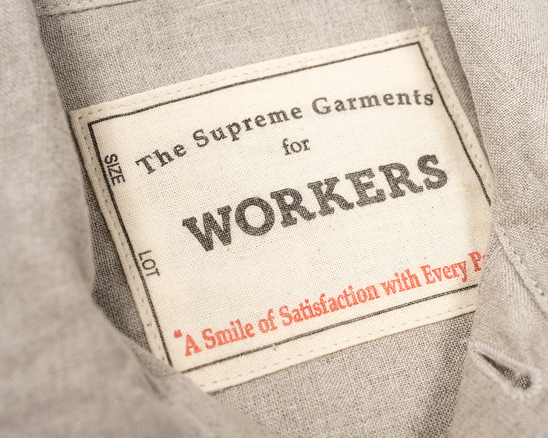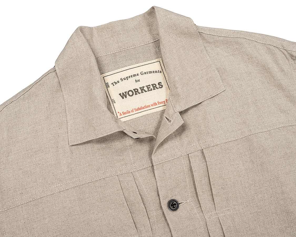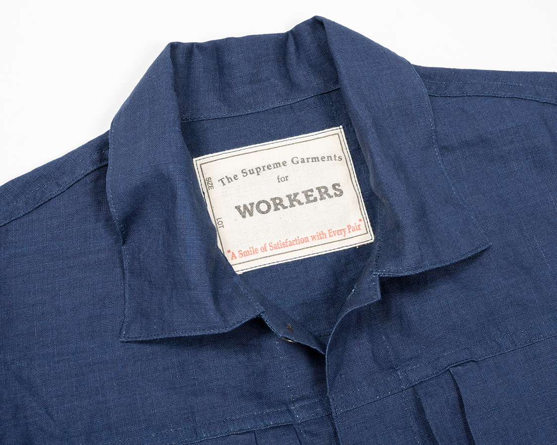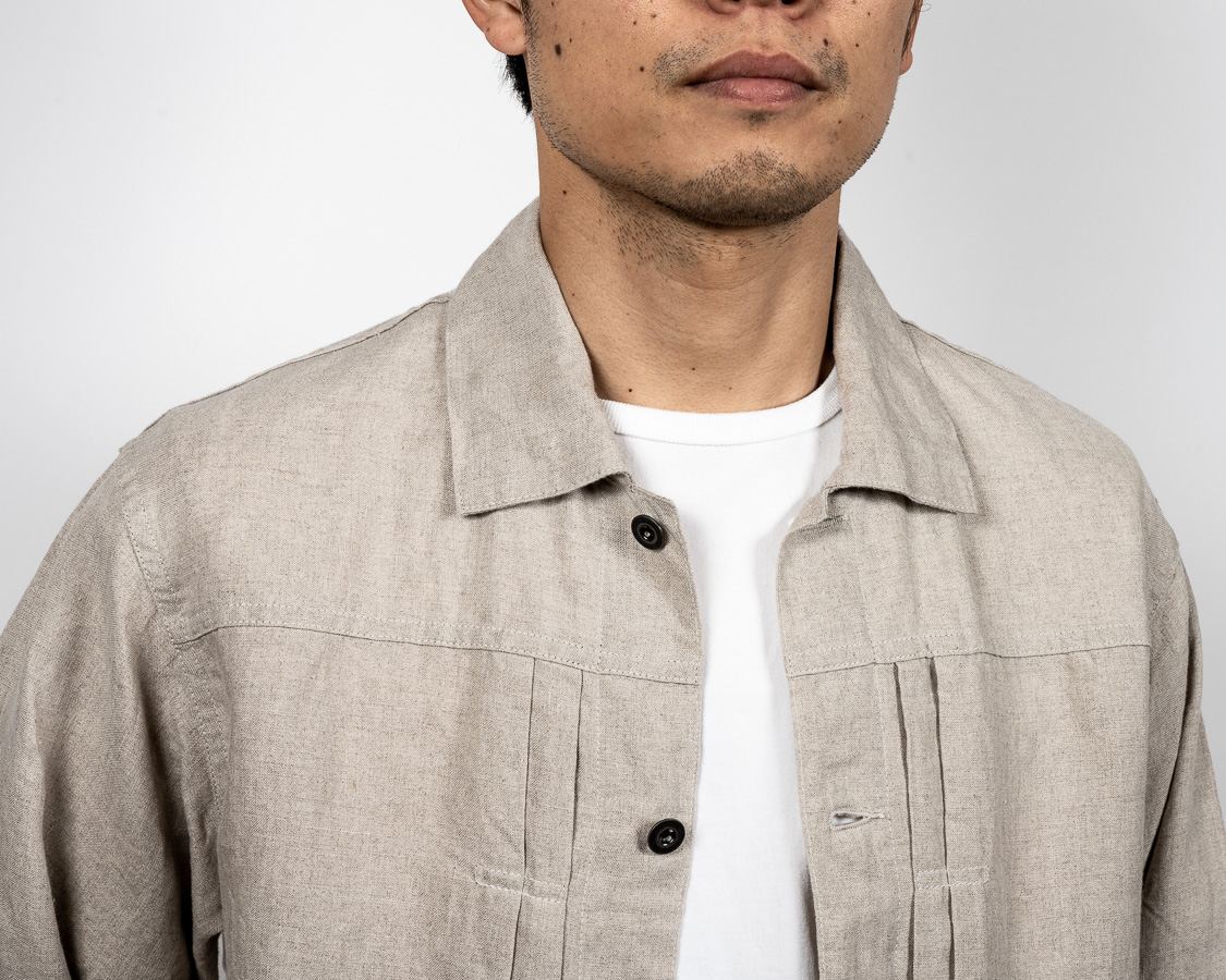 ボタンは金属。椰子などの天然素材も考えましたが、クラシックなワークウェア=金属ボタン というイメージで採用しました。刻印、塗装の雰囲気も製品の力強いデザイン、でもリネンの素材感に合っていると思います。また、糸付けのボタンで比較的軽いのもポイント。ここにタックボタンを打ち込んでしまうと重さに生地が耐えられず垂れ下がってしまうのです。