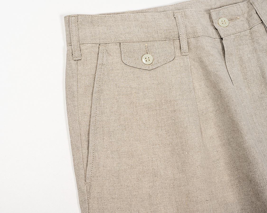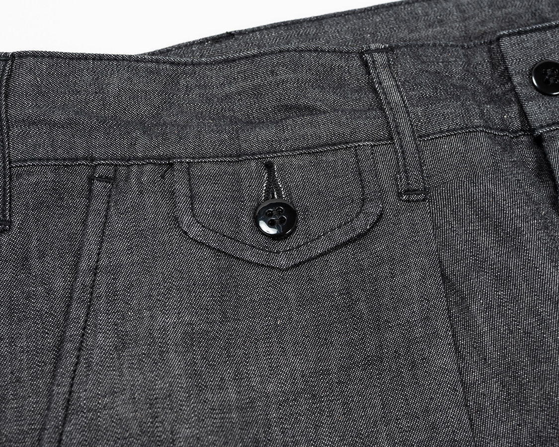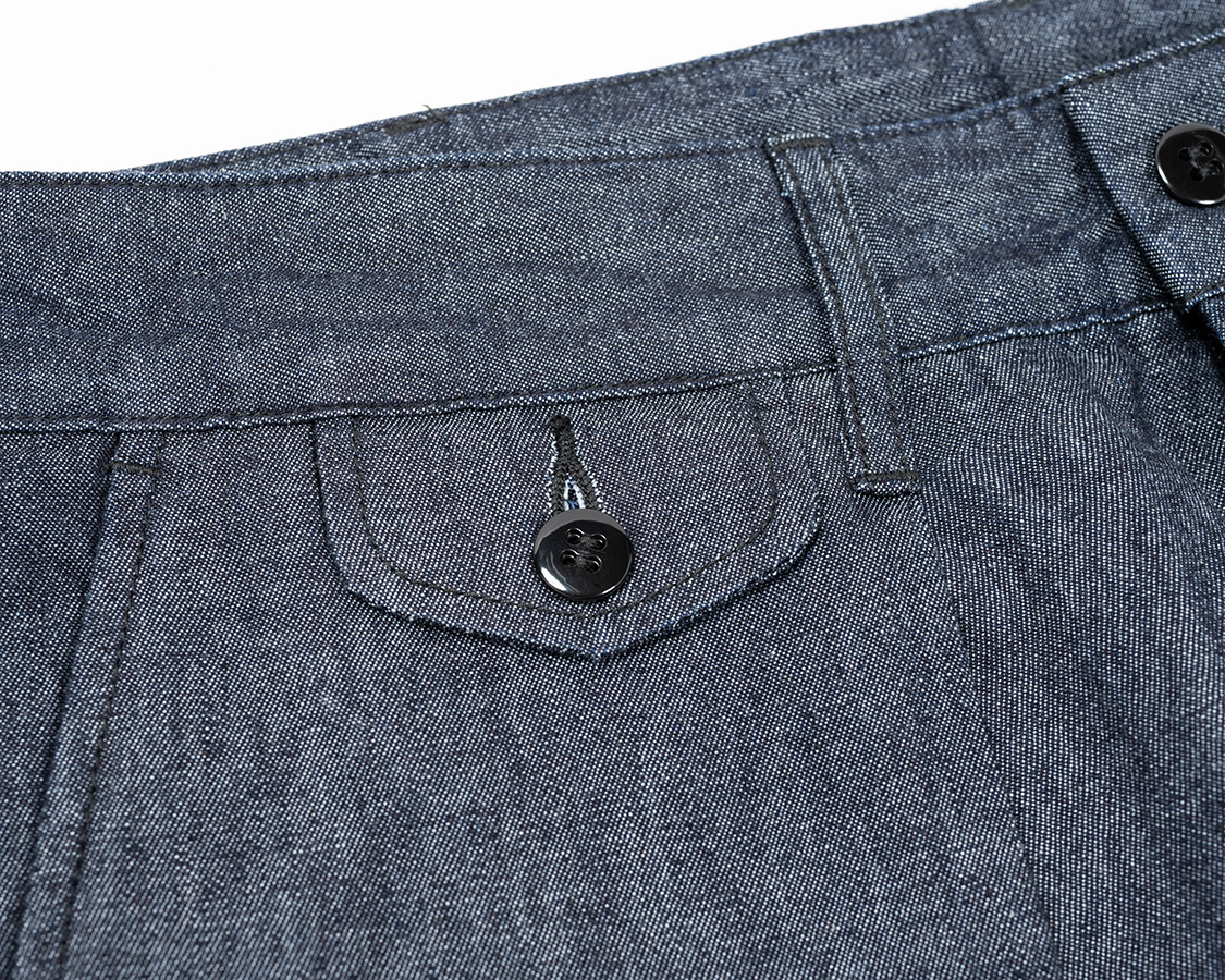 右身頃、腰に付けたコインポケット。正直、機能性はほとんどありません。非常に物は出し入れしづらいです。それでも、こういう「余計な物」を「出なければならない」と楽しんだのが昔のジャパニーズ的解釈の「トラッド」です。そういった雰囲気を取り入れたくて採用した仕様。