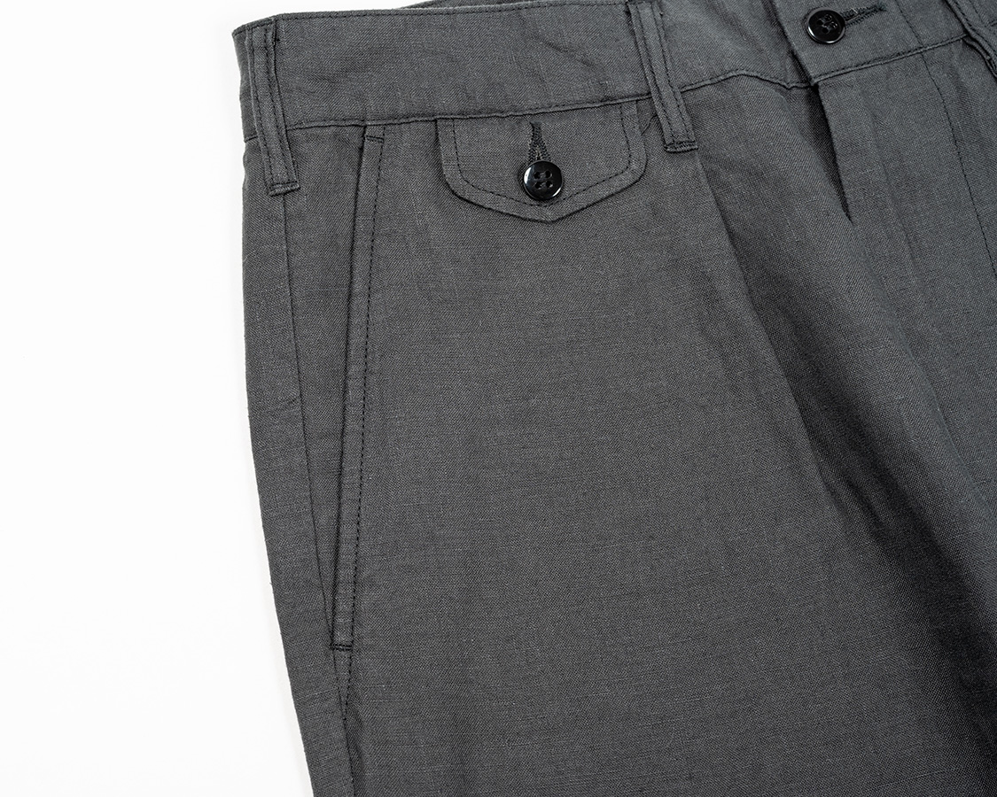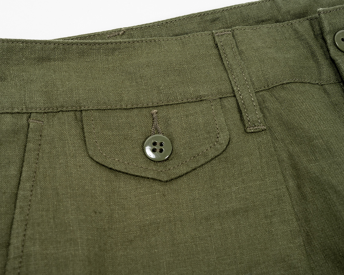腰のネームはそっけないもの。なぜなら、このSummer Trousersは旧FWP、Fatigue Trousers without cargo Pockets、ファティーグパンツから脇ポケットを取り去ったのが始まり。そのため、ネームだけはいまだにこのそっけないミリタリー風です。