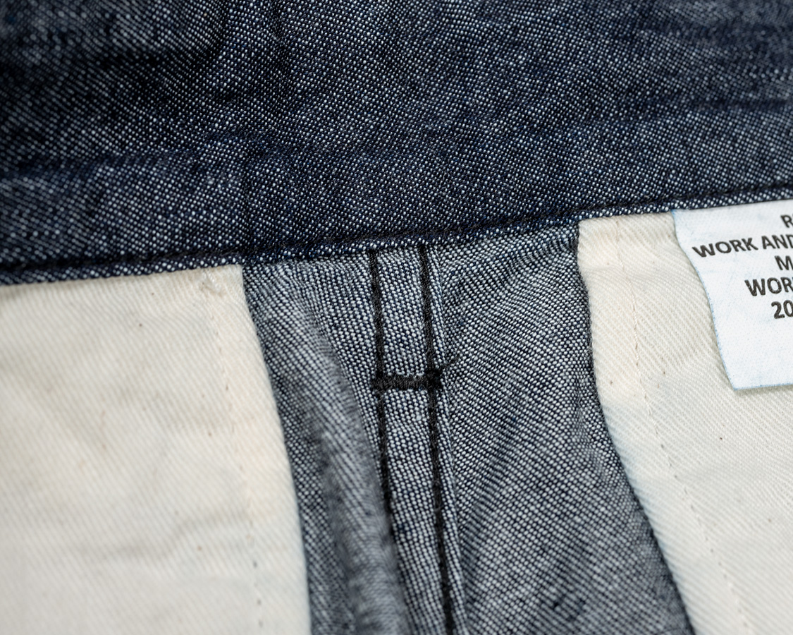 後ろ中心は巻縫い。6オンスクラスの薄手で巻くと、厚みも出ないので摩擦ですれる事もそうはないでしょう。縫い目より先に身生地がダメになります。