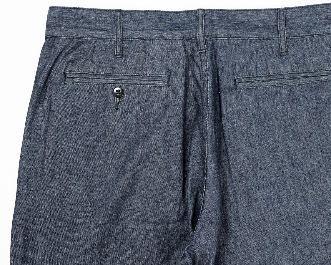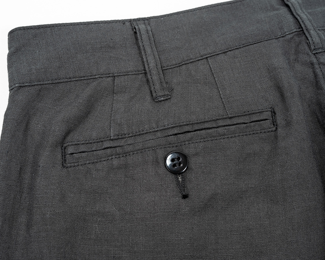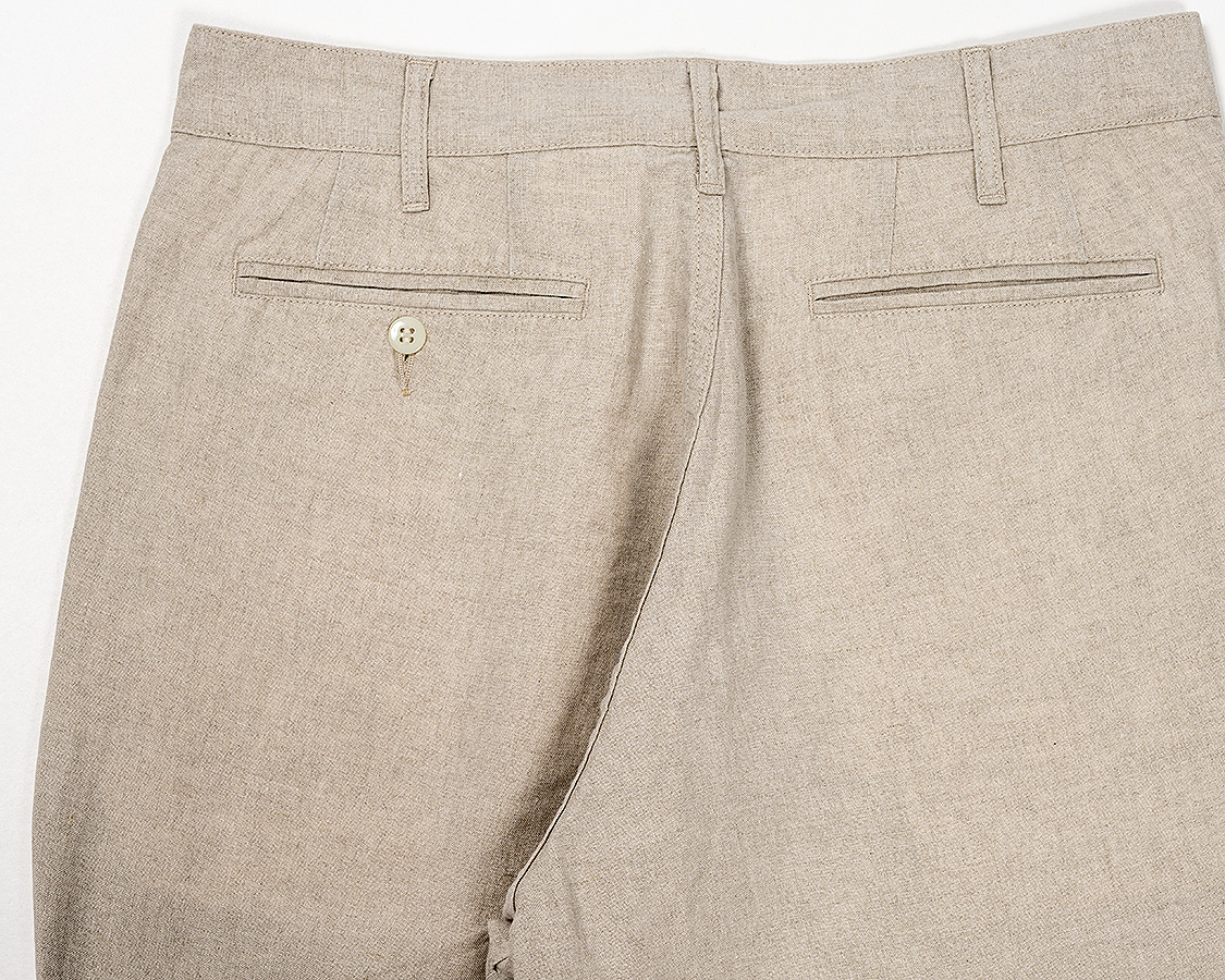 背面、左身頃側だけボタン付きポケット。ダーツは半身2本。こうすると、ヒップの丸みをよりなだらかに取る事が出来ます。手間は手間なのですが。