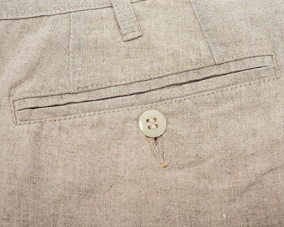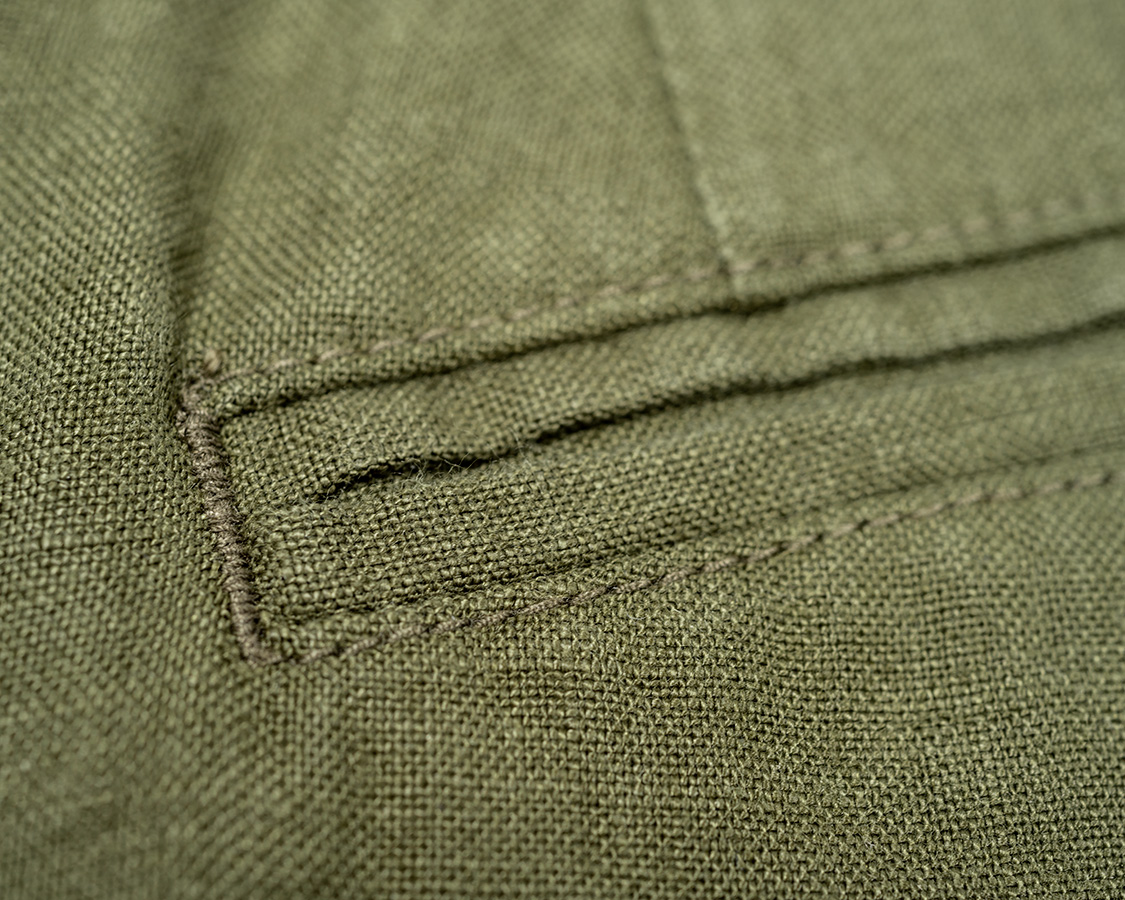 両玉縁ポケット。あえて極細にはしていません。極細にするとその分、玉縁を作る時の切り込み〜地縫いまでの距離が狭くなる。今回の粗目な生地だとそれに耐えられそうにないので、ある程度太さをきちっと取り、縫い代を十分確保しています。