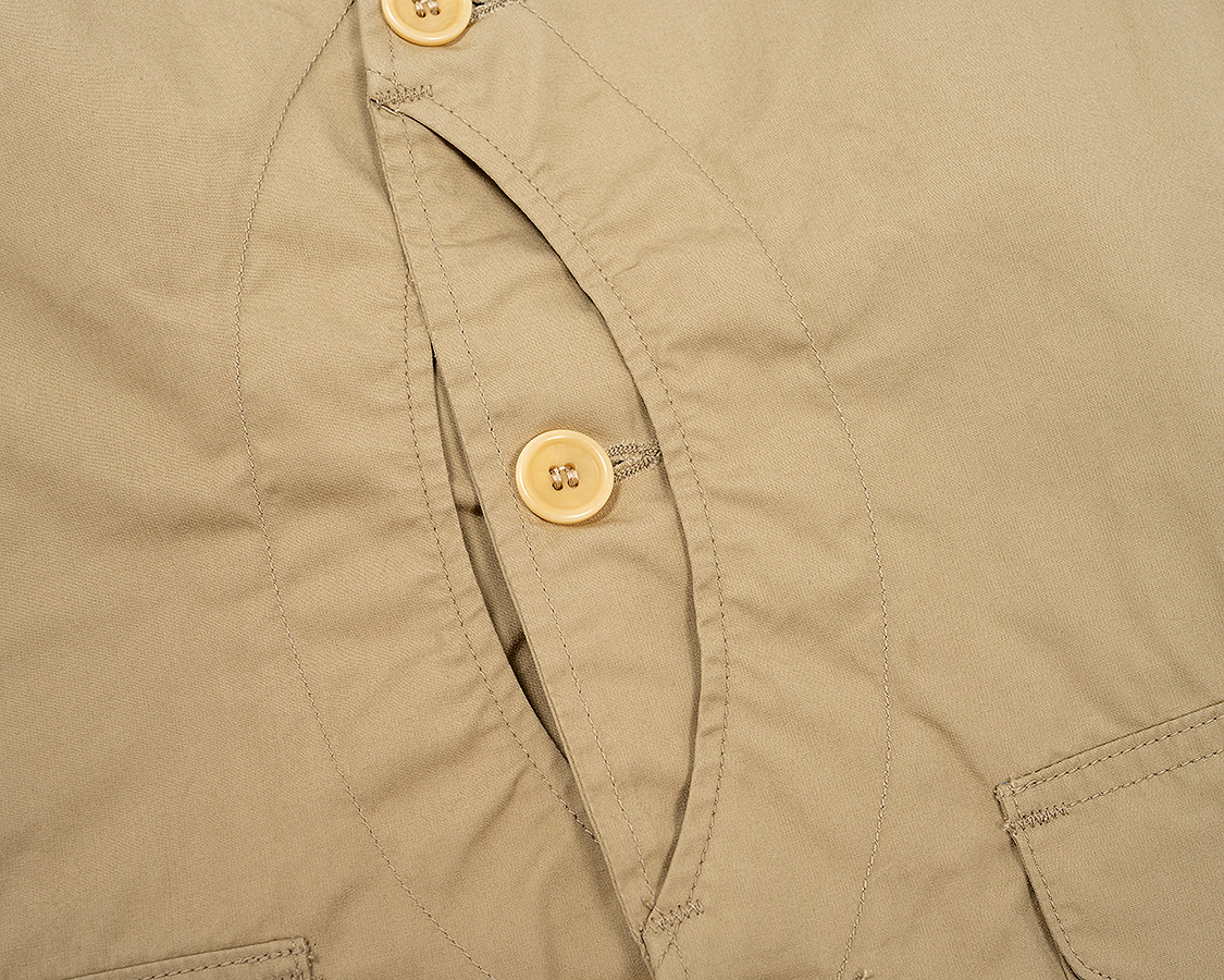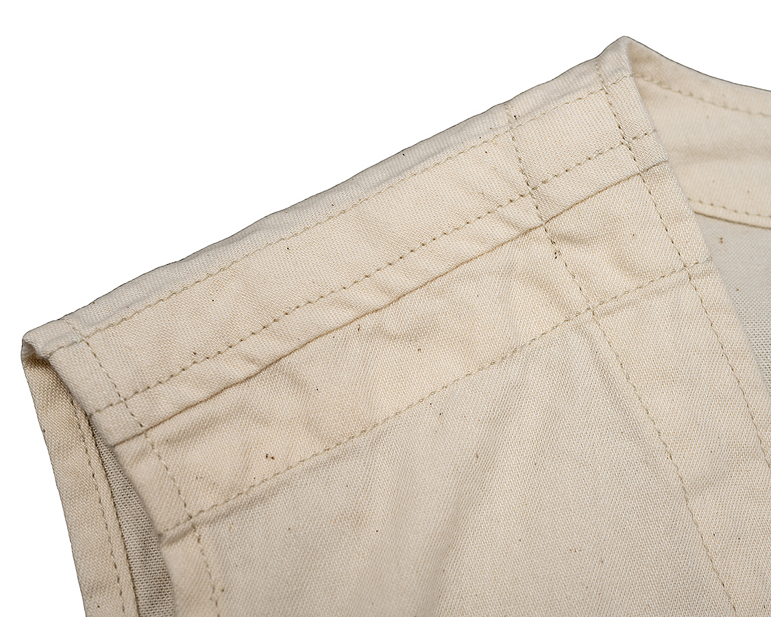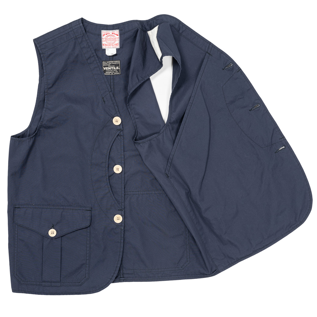 WORKERS定番の「Cruiser Vest」との違いは内部構造。フロントの裏地が途中までしかない、後ろ身頃は裏地が無い。これにより、夏場、暑くるしくないのにフロントポケットの機能性はキープ。
