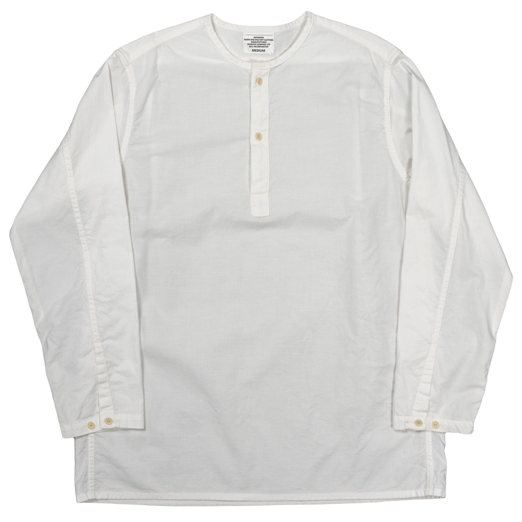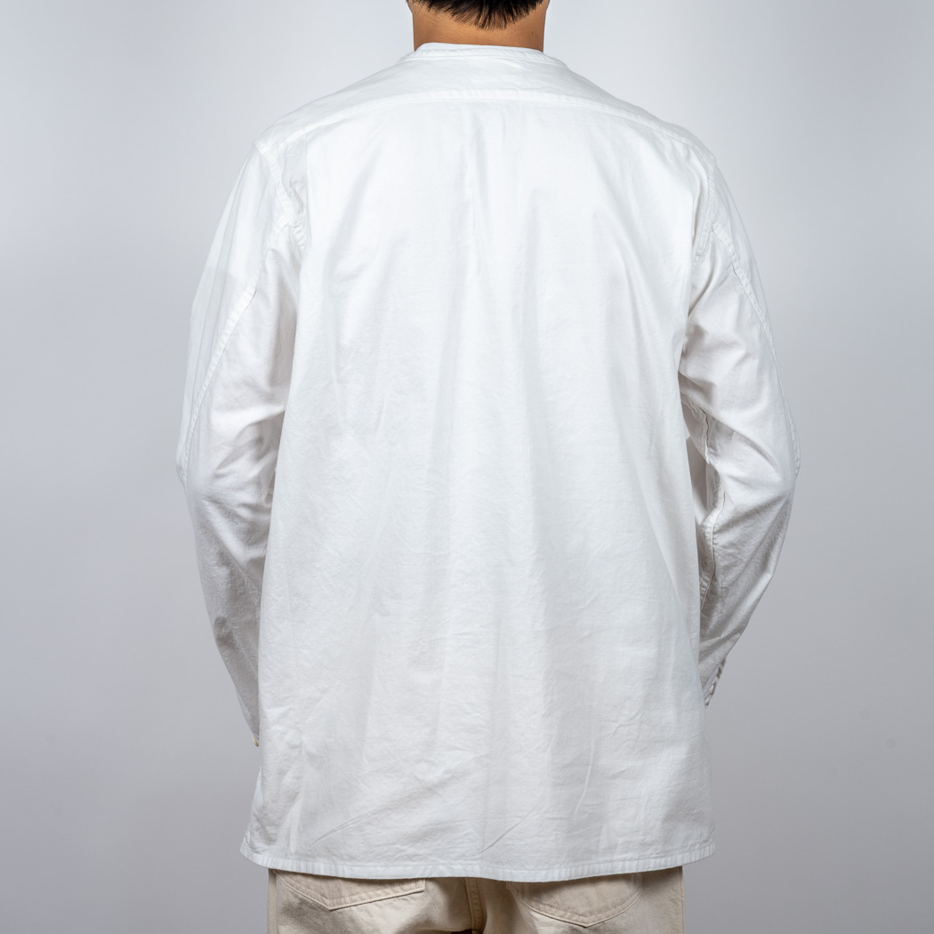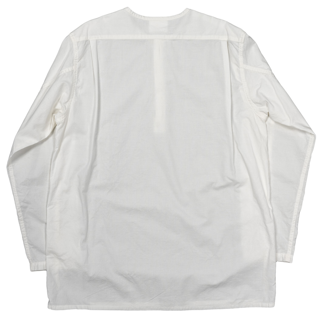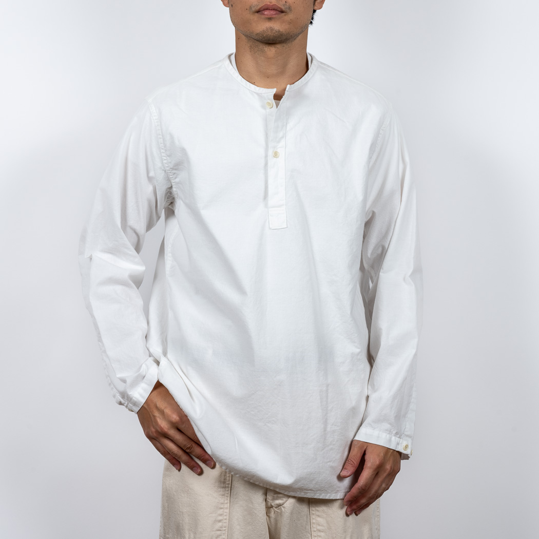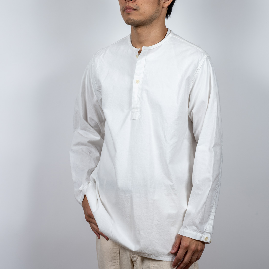 WORKERSバージョンのSleeping Shirt、袖丈は通常のシャツの袖丈。オリジナルの半端袖丈の雰囲気より、シャツとしての機能性を優先しました。袖口に、細い見返しをつけた開き。これで、ある程度袖がまくれます。やはり、袖口は開きがあってまくれた方がシャツとしての機能が高い。背面はヨークをつけ、身頃にはタックを。これで、肩幅は落ちすぎない、でも身頃にはゆったりと横方向にゆとりを出して、プルオーバー独特の着づらさをなくしています。 |