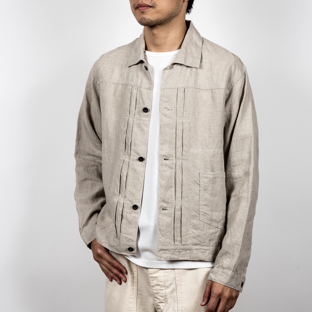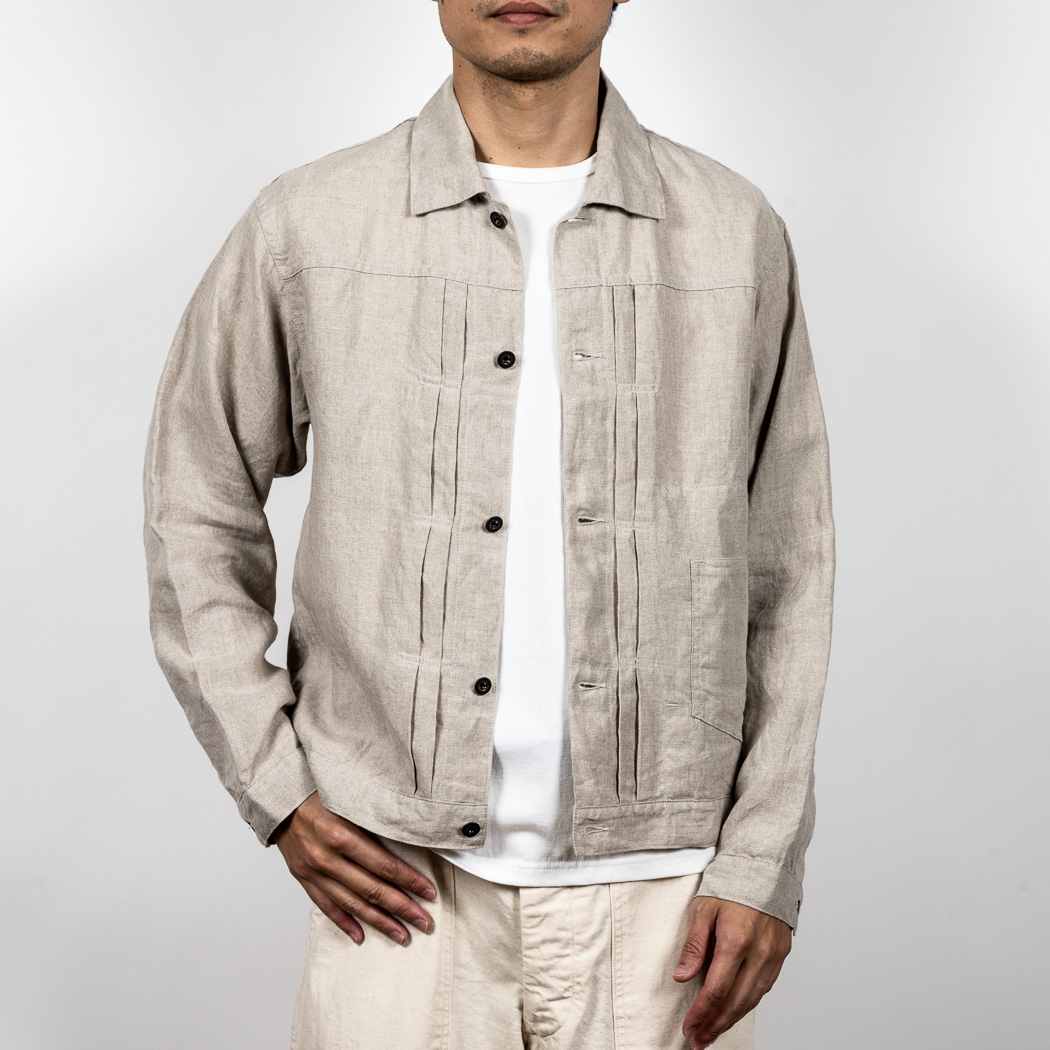 リネン、夏の定番素材。5オンス程でほぼチクチク無し。このなめらかな手触りは織った後の洗いや染めにあります。滋賀にある生地の加工屋さん、徹底的に何回も揉んで、洗って。自然な柔らかな風合いになるよう乾燥もベルトコンベアに生地を乗せてものすごく大きな乾燥機で「ふわっと」乾かす。揉んだり・洗ったり・乾かしたりも一度で求める風合いにならなければ、何回も工程を繰り返したり。その工程も「なんとなく」ではなく、きちっとデータ・仕様になってそれぞれの生地・色ごとに管理。だから、この風合いが安定して生み出せているわけです。