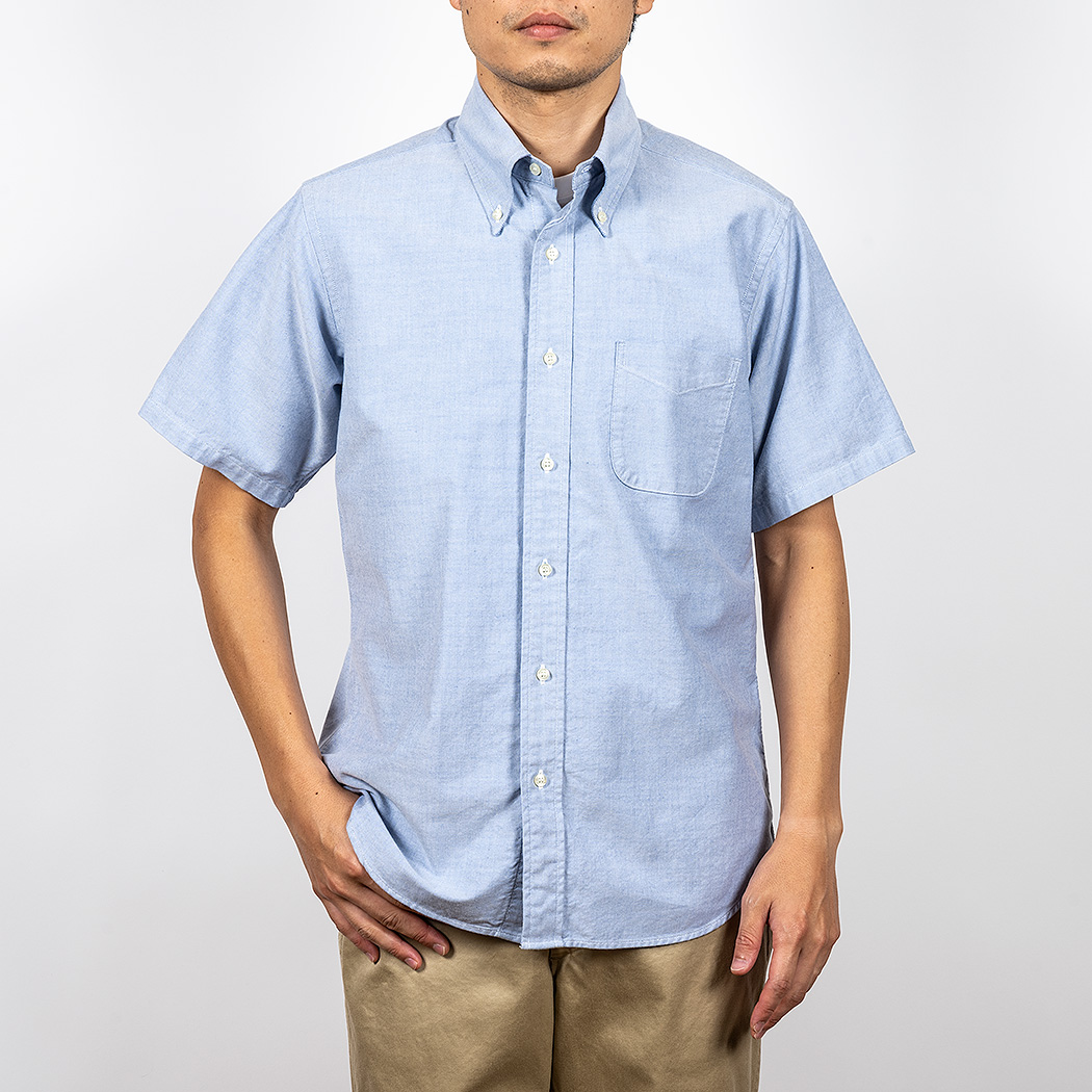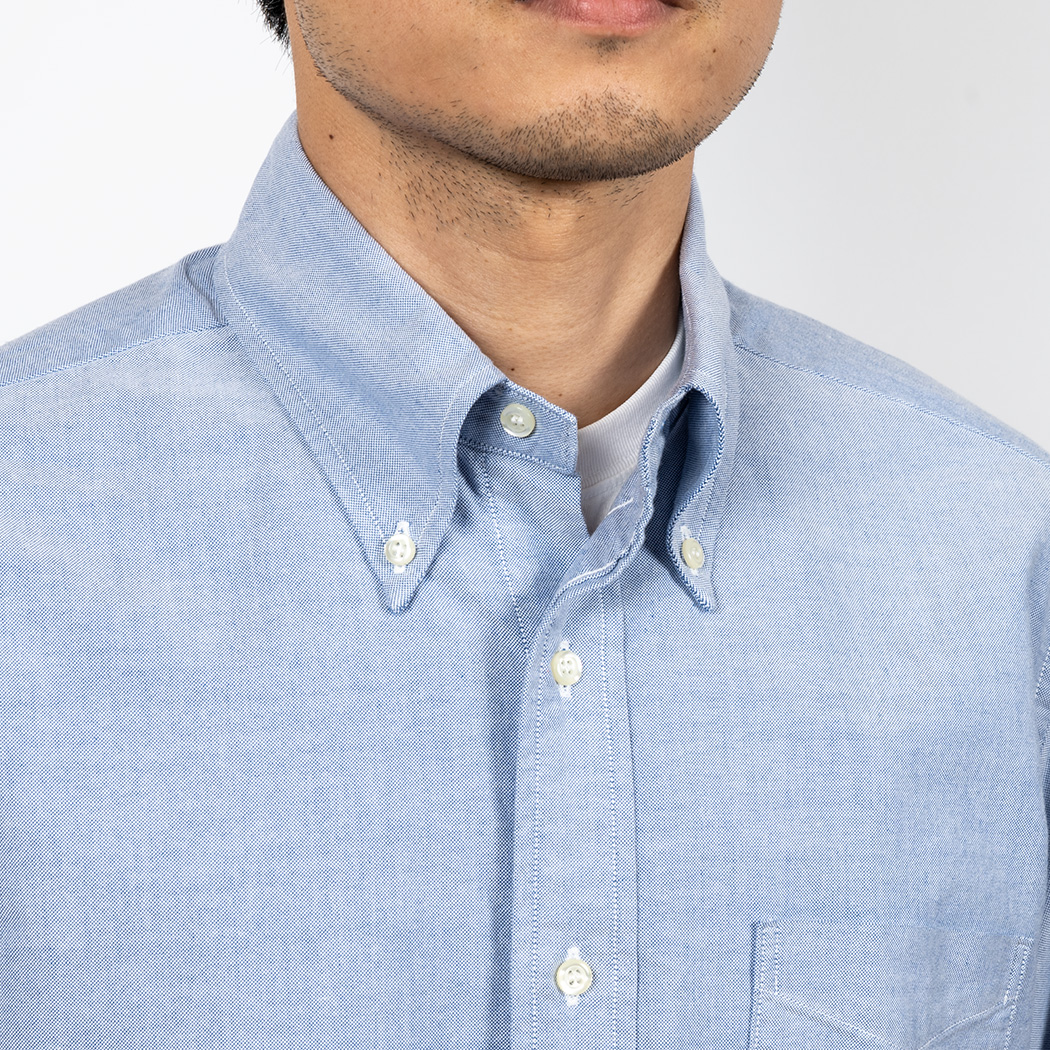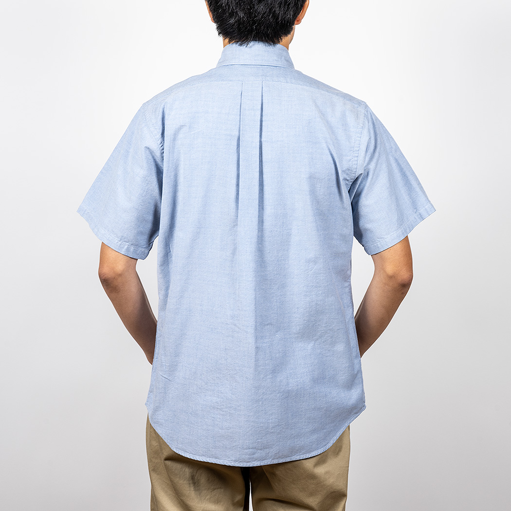 一見「なんでもない、半そでのボタンダウン」ですが、ぜひ裏返してご覧ください。袖ぐりはチェーンステッチを使った 折伏せ縫い。脇は極細の折伏せ。裾の三巻の美しさ。フロントももちろん、チェーンステッチ、専用ミシン・金具を使っ て。それがすべて、極細の綿糸で細かいピッチで縫われています。「どこにでもある服」のように見えてやっぱり違います。BDはノンウォッシュ納品。洗うと若干、1-2センチ程度縮みます。