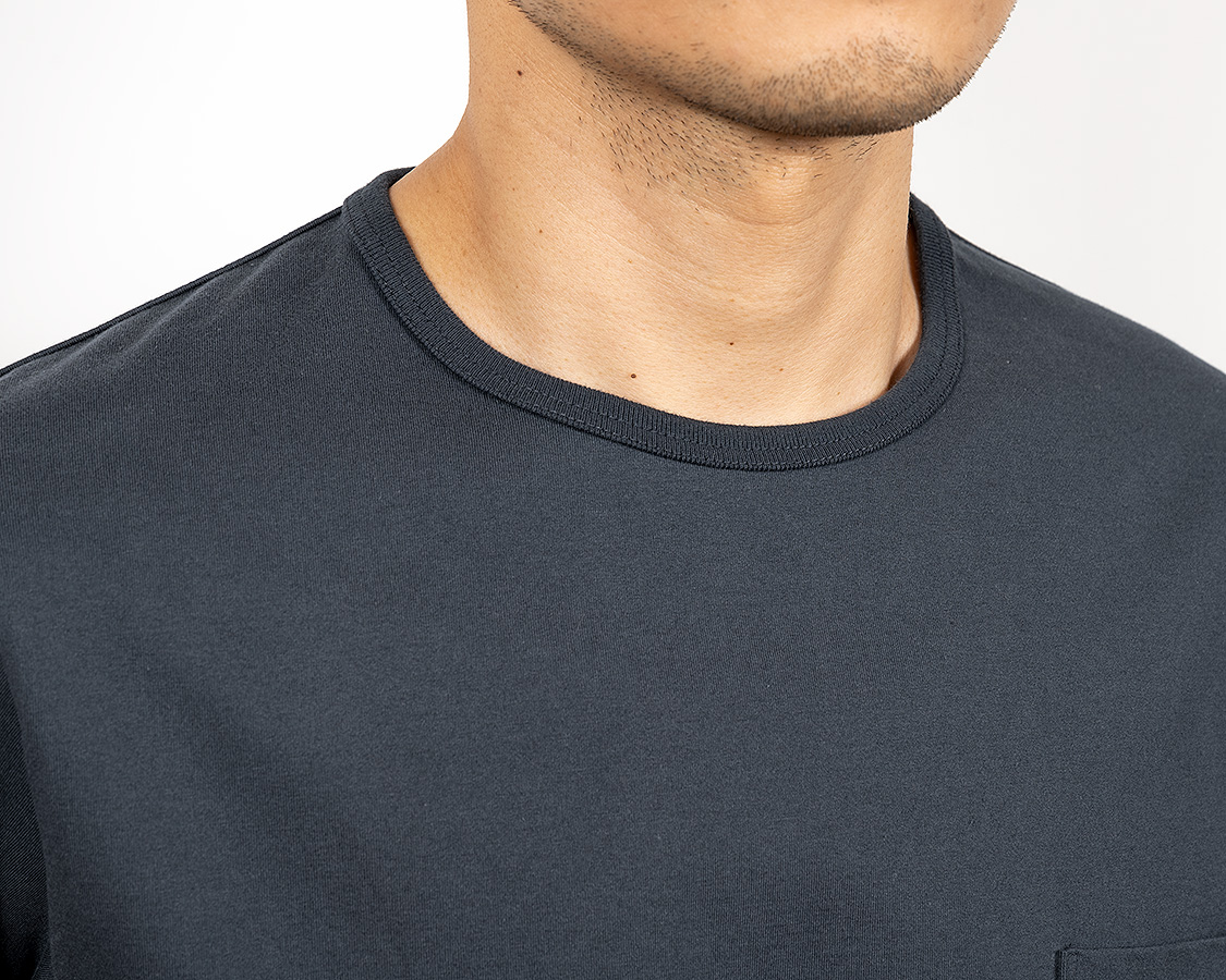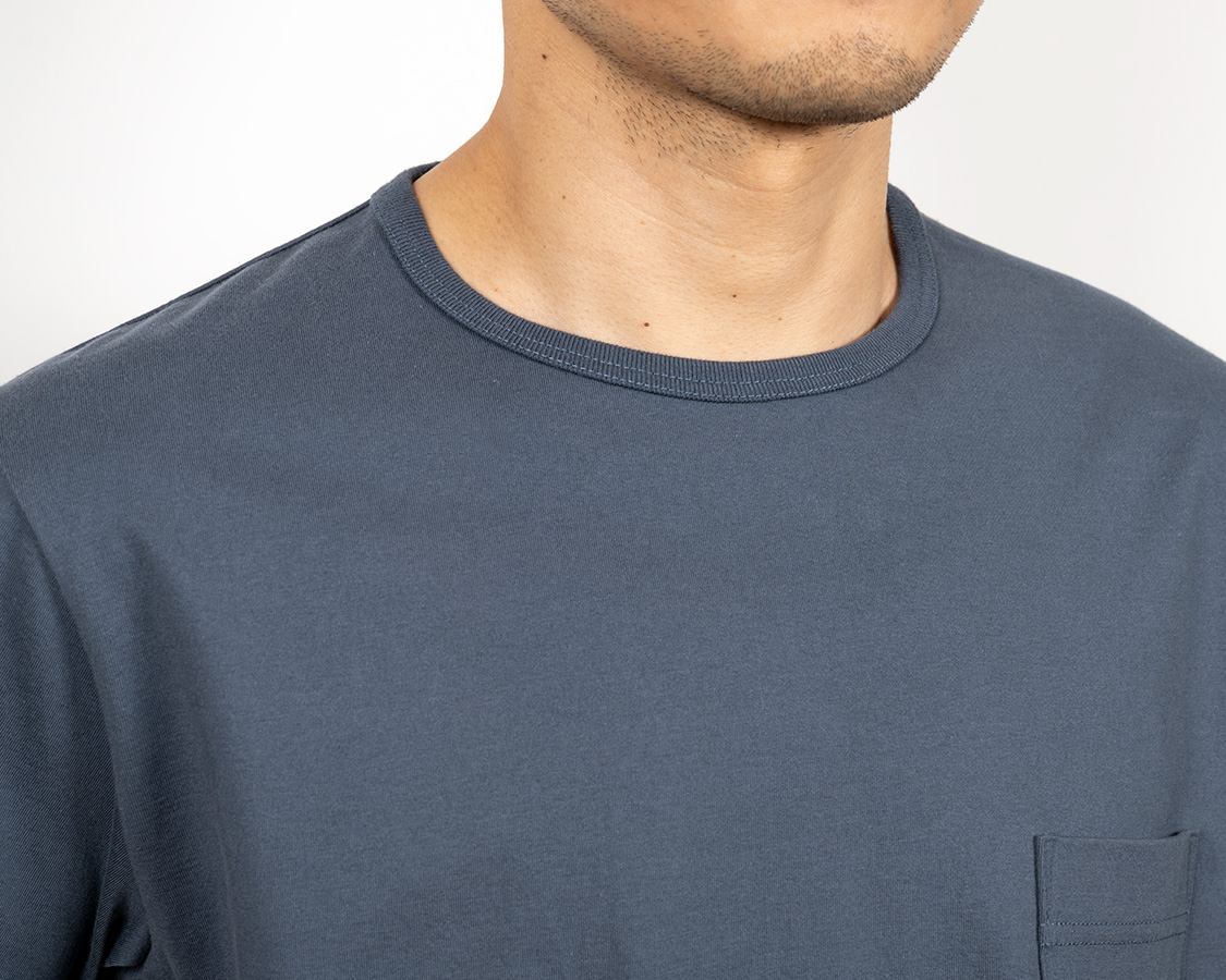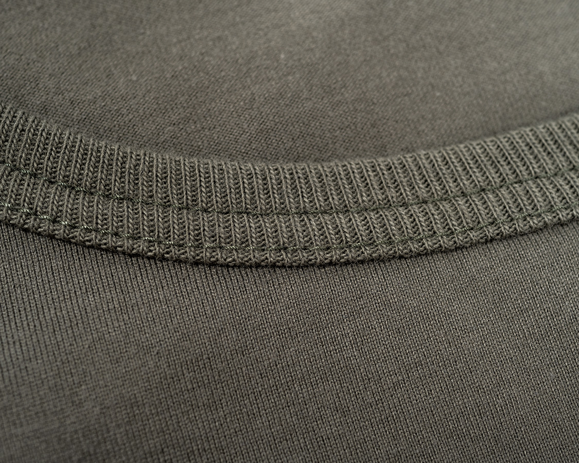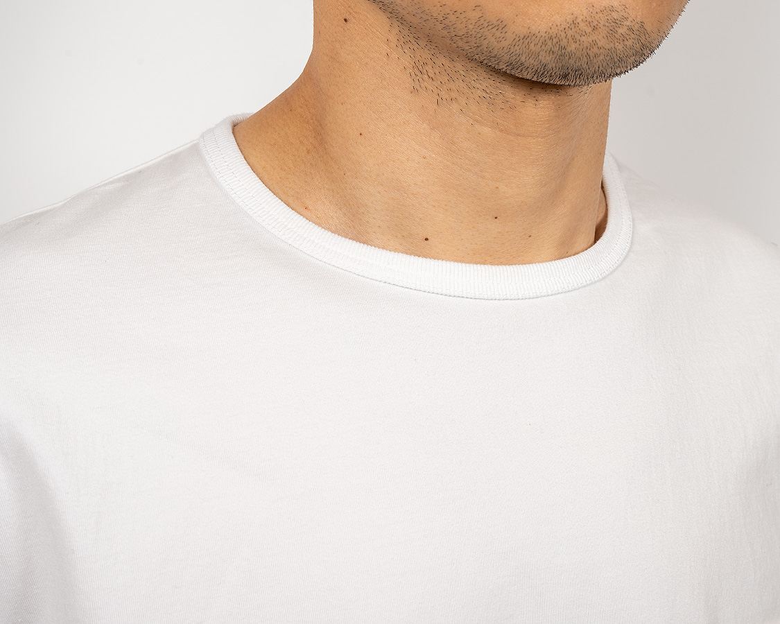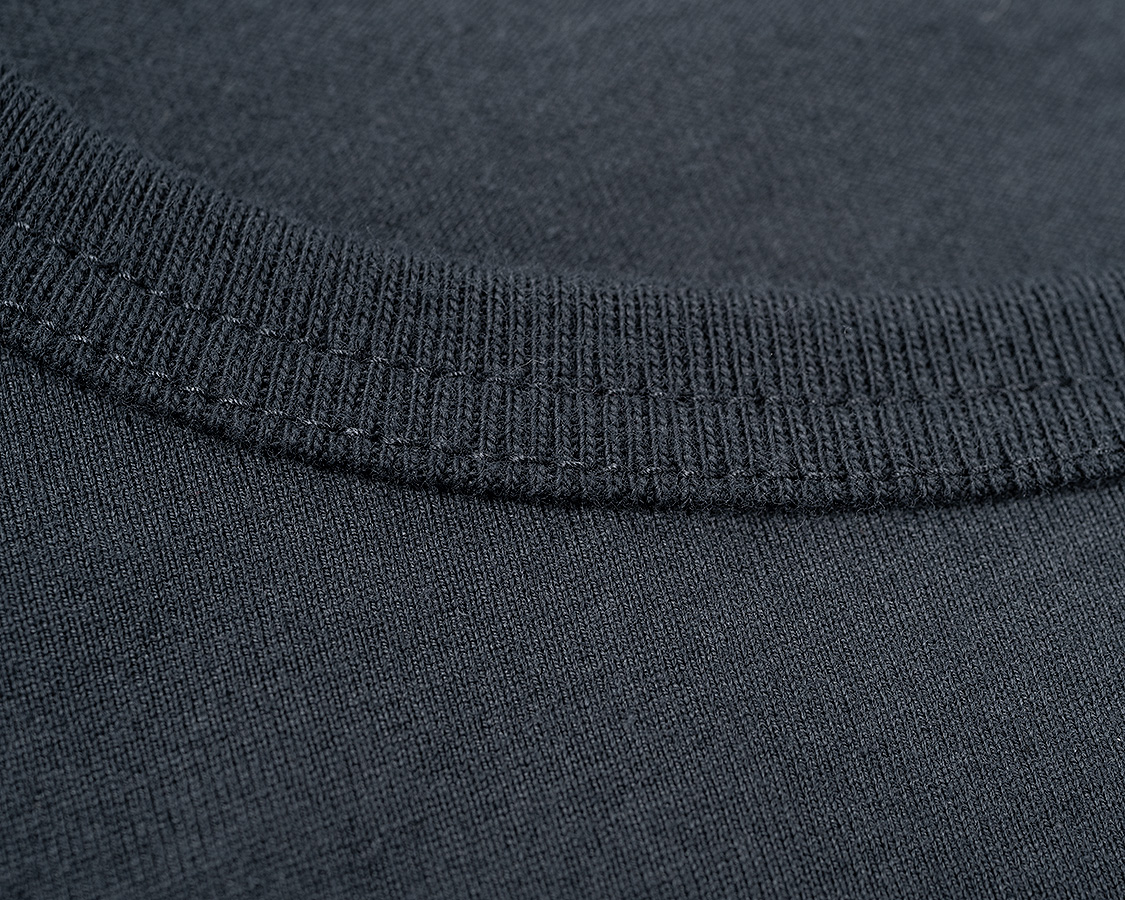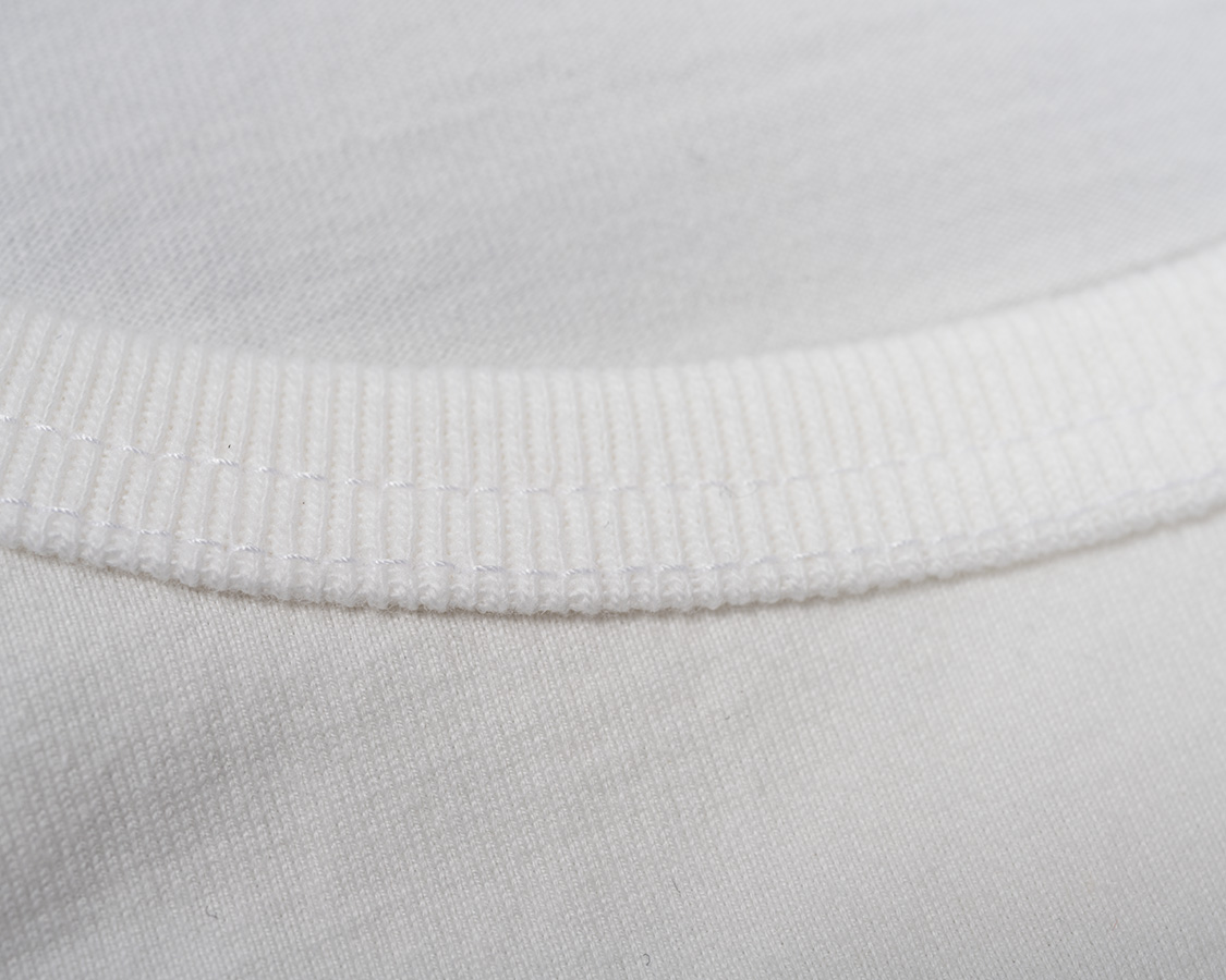 アップにしてみると、生地の目が綺麗にそろっているのが良くわかります。これが、3本の糸を、それぞれの撚りと逆方向により合わせたことで、撚る力が打ち消しあっているため、ここまで目が綺麗にそろうのです。 首回りのフライスも細めの仕上がりにするには分厚いフライスではダメ。Regular Fit、Roomy Fitのフライスより少しだけ薄い物を使っています。