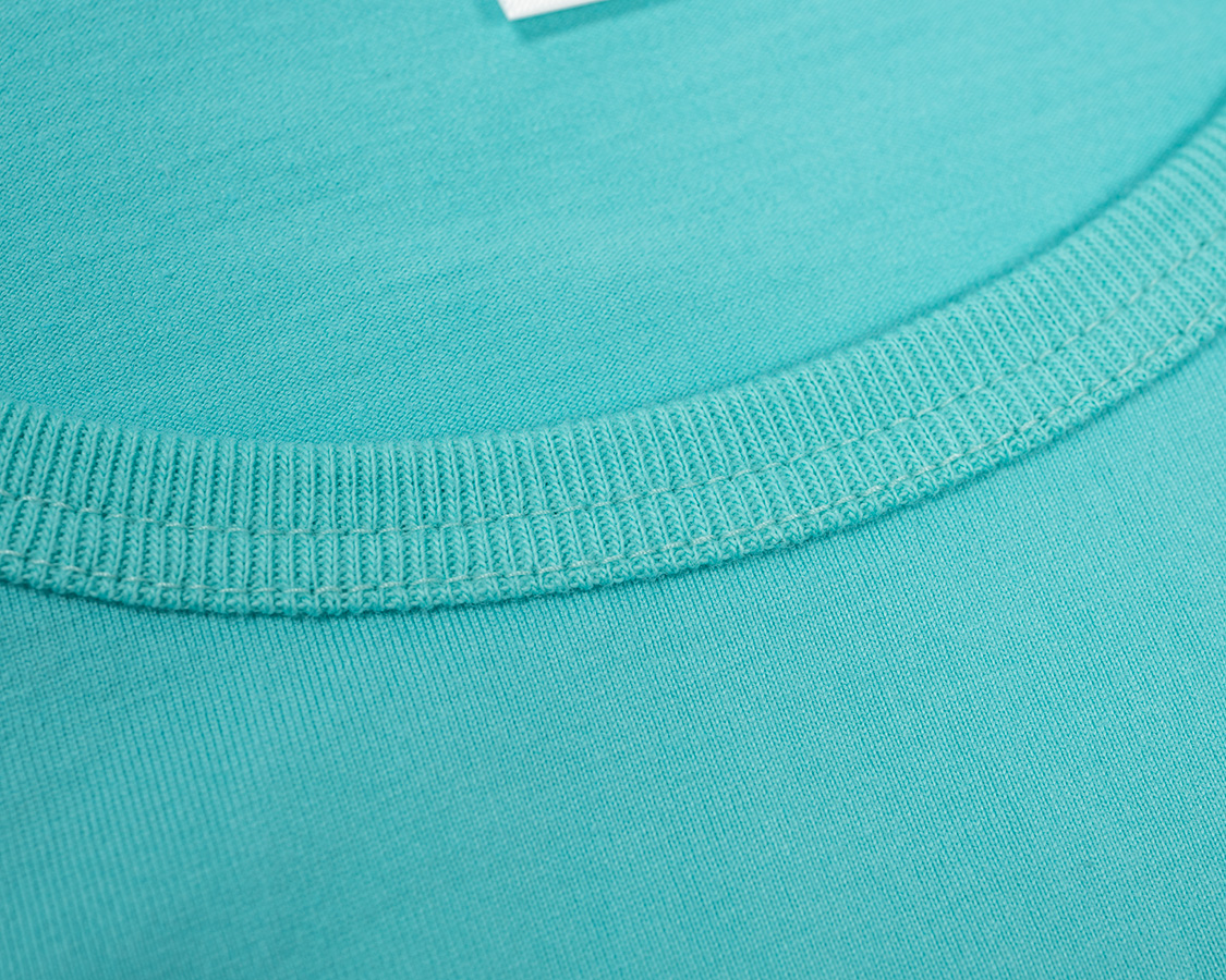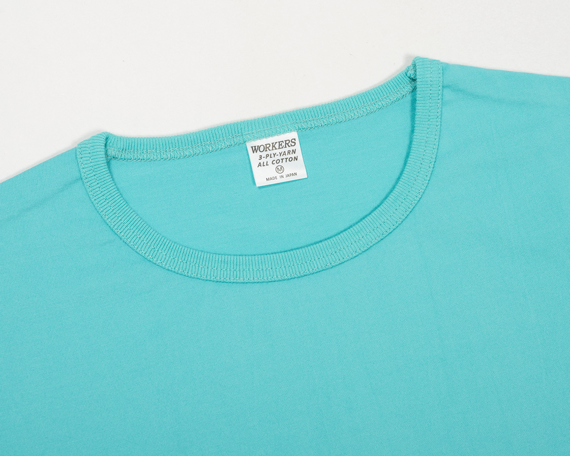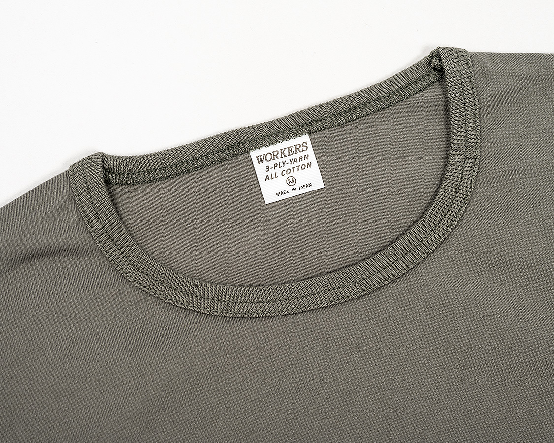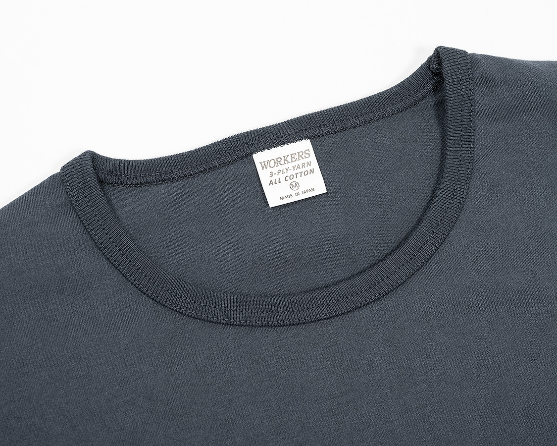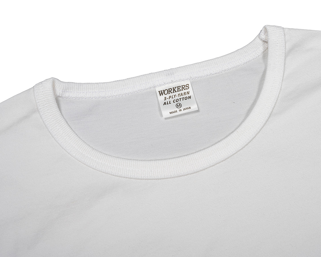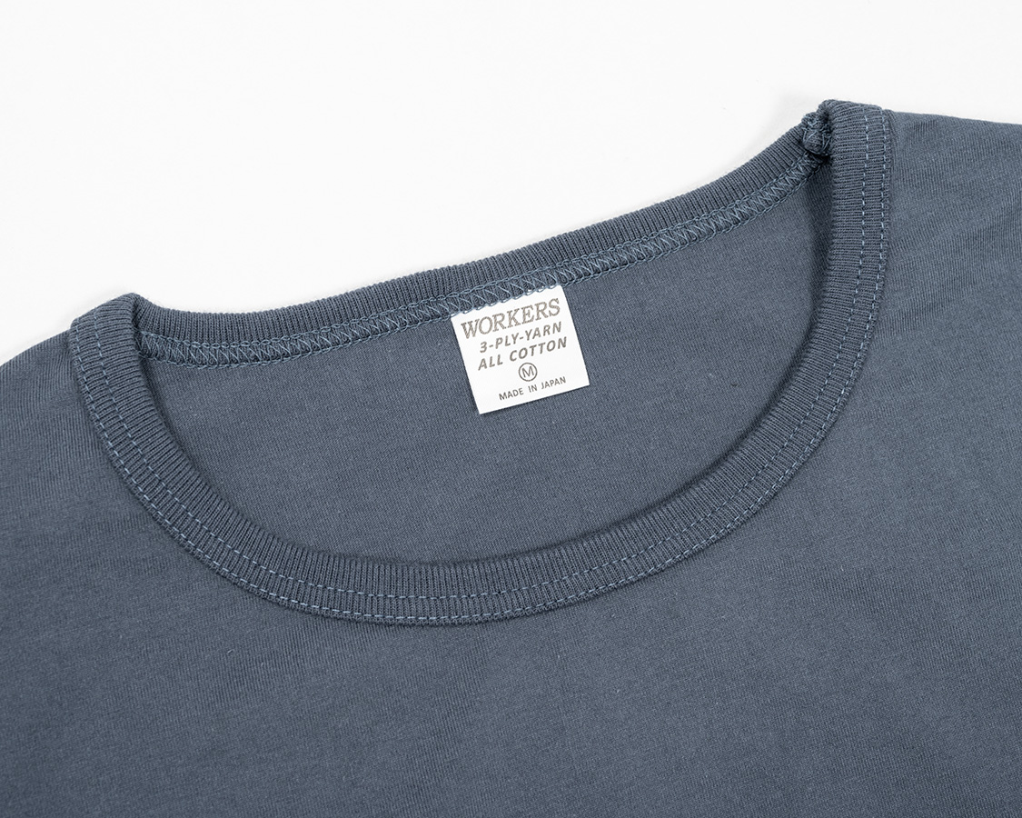 アップにしてみると、生地の目が綺麗にそろっているのが良くわかります。これが、3本の糸を、それぞれの撚りと逆方向により合わせたことで、撚る力が打ち消しあっているため、ここまで目が綺麗にそろうのです。 首回りのフライスも細めの仕上がりにするには分厚いフライスではダメ。Regular Fit、Roomy Fitのフライスより少しだけ薄い物を使っています。