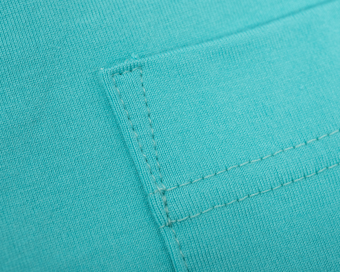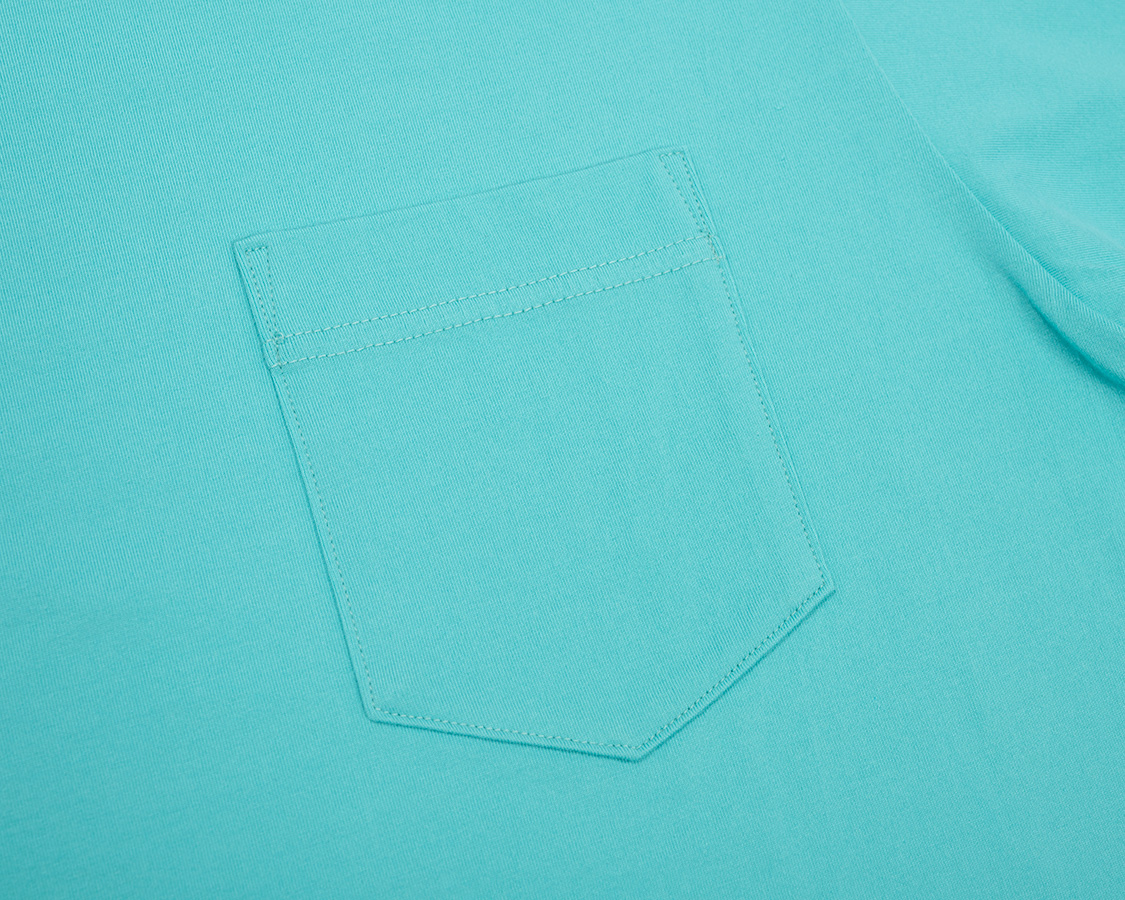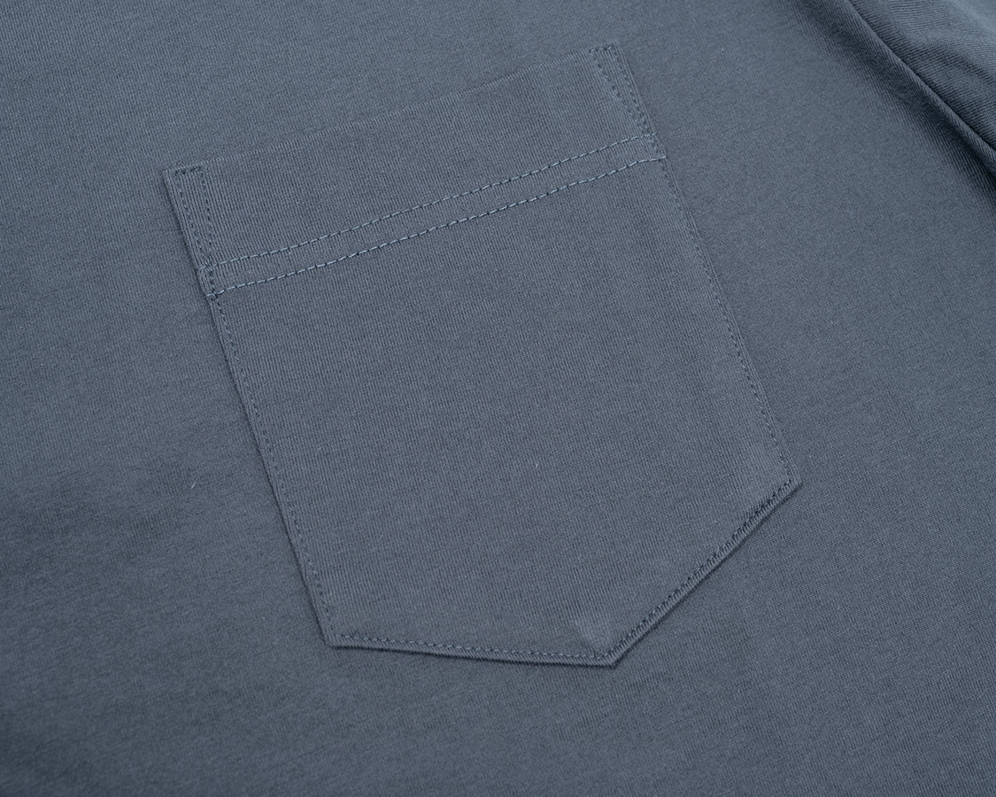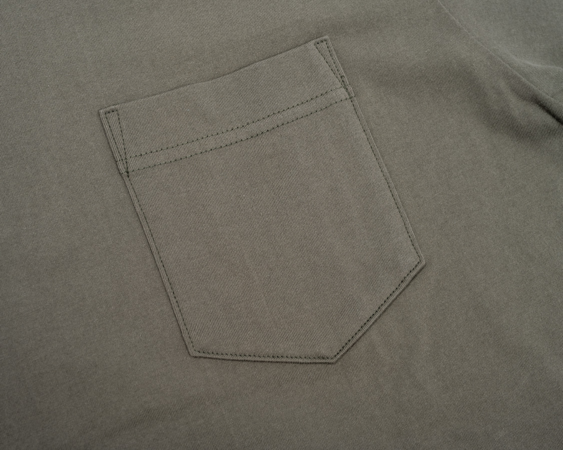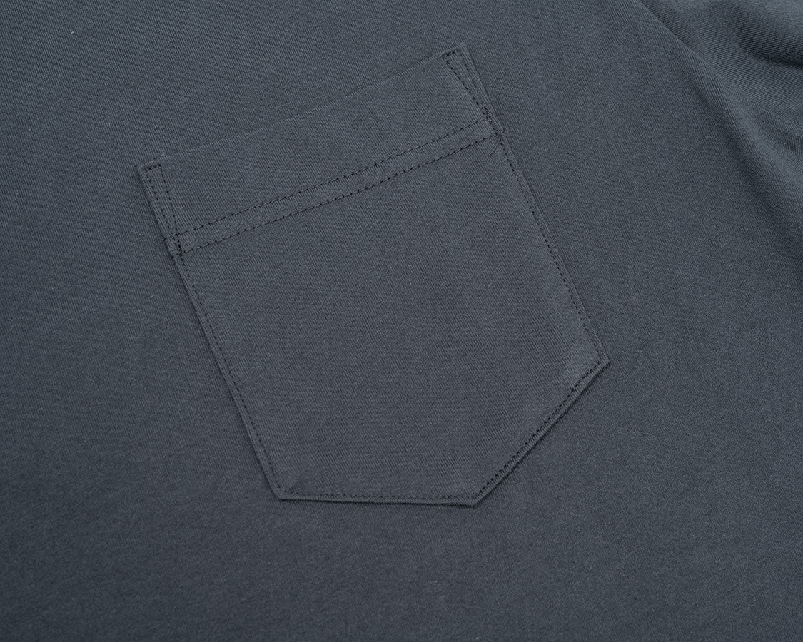 胸ポケットの角、三角に縫って身頃に面でつける。力がかかった時に、線ではなく面にかかるので力が分散される。