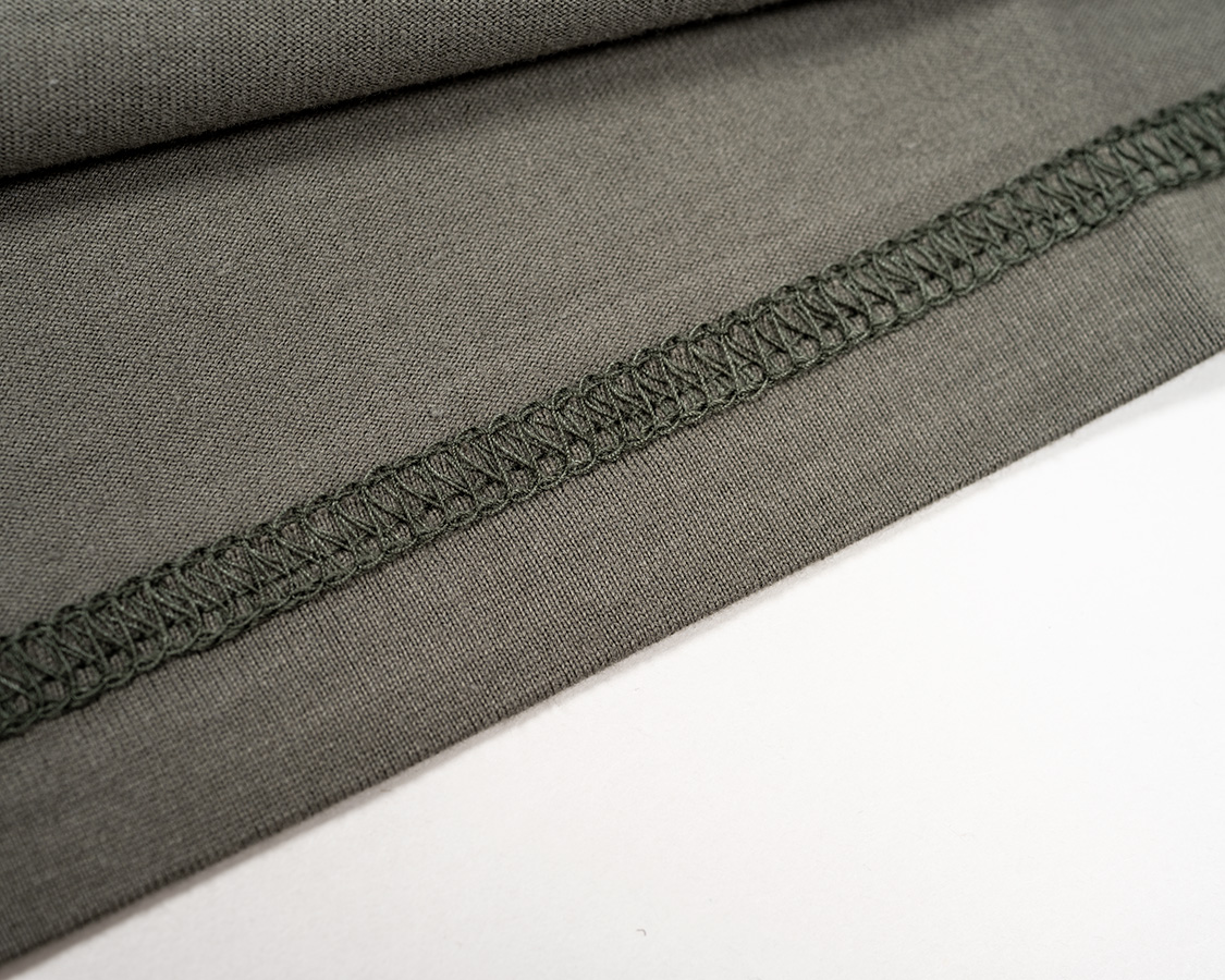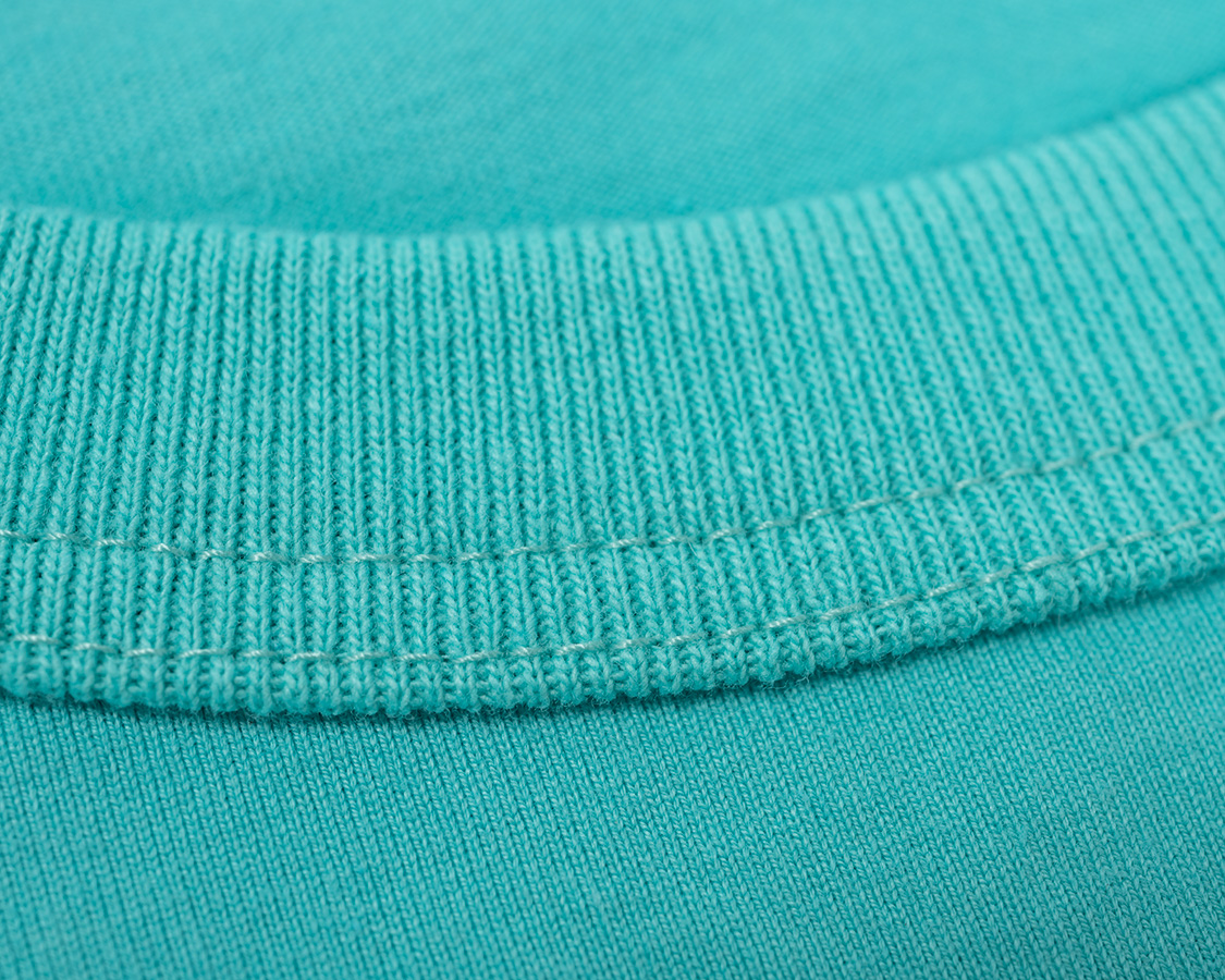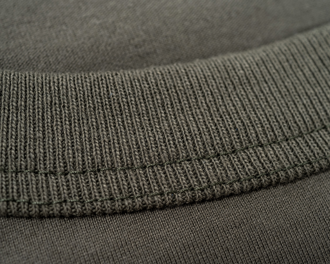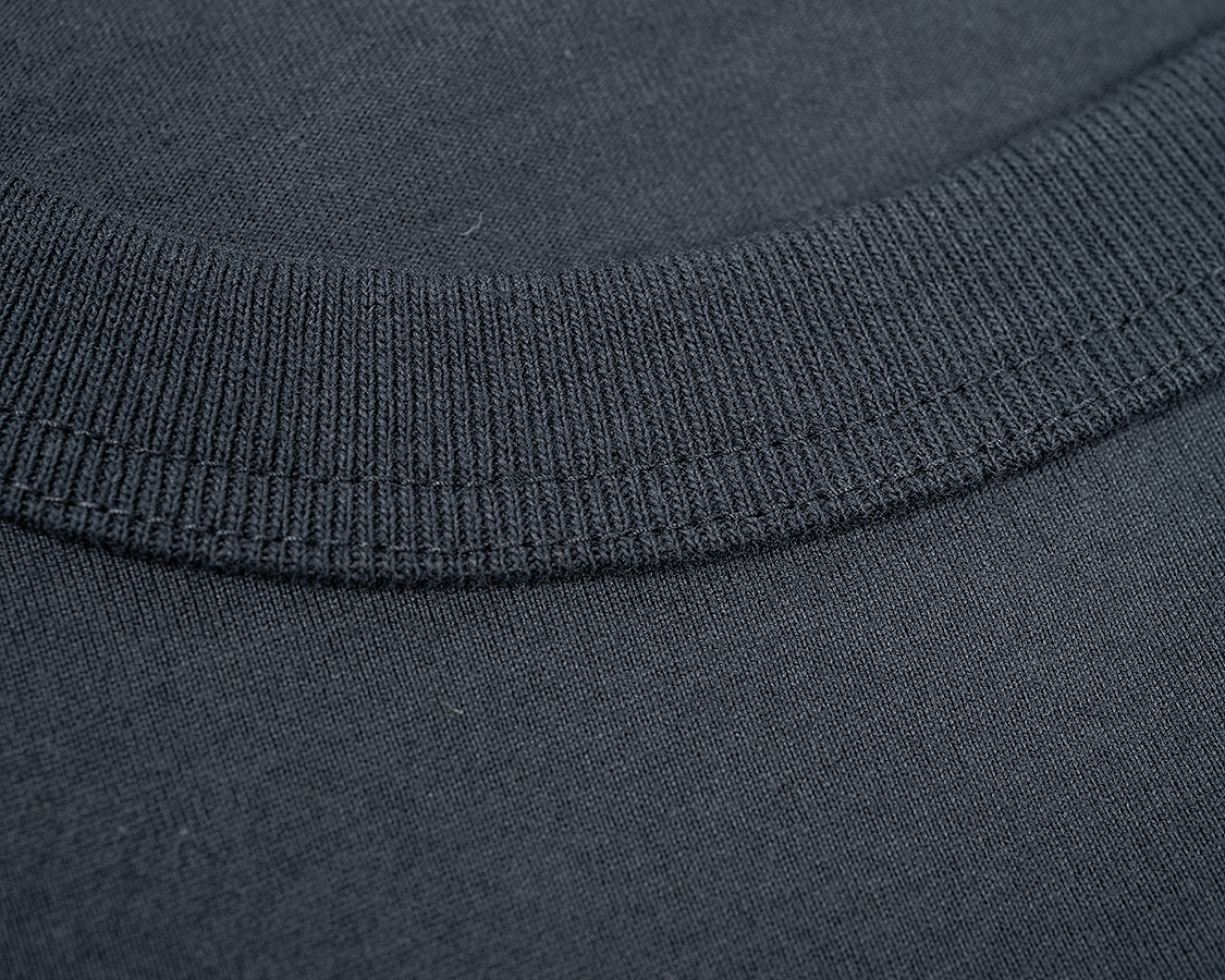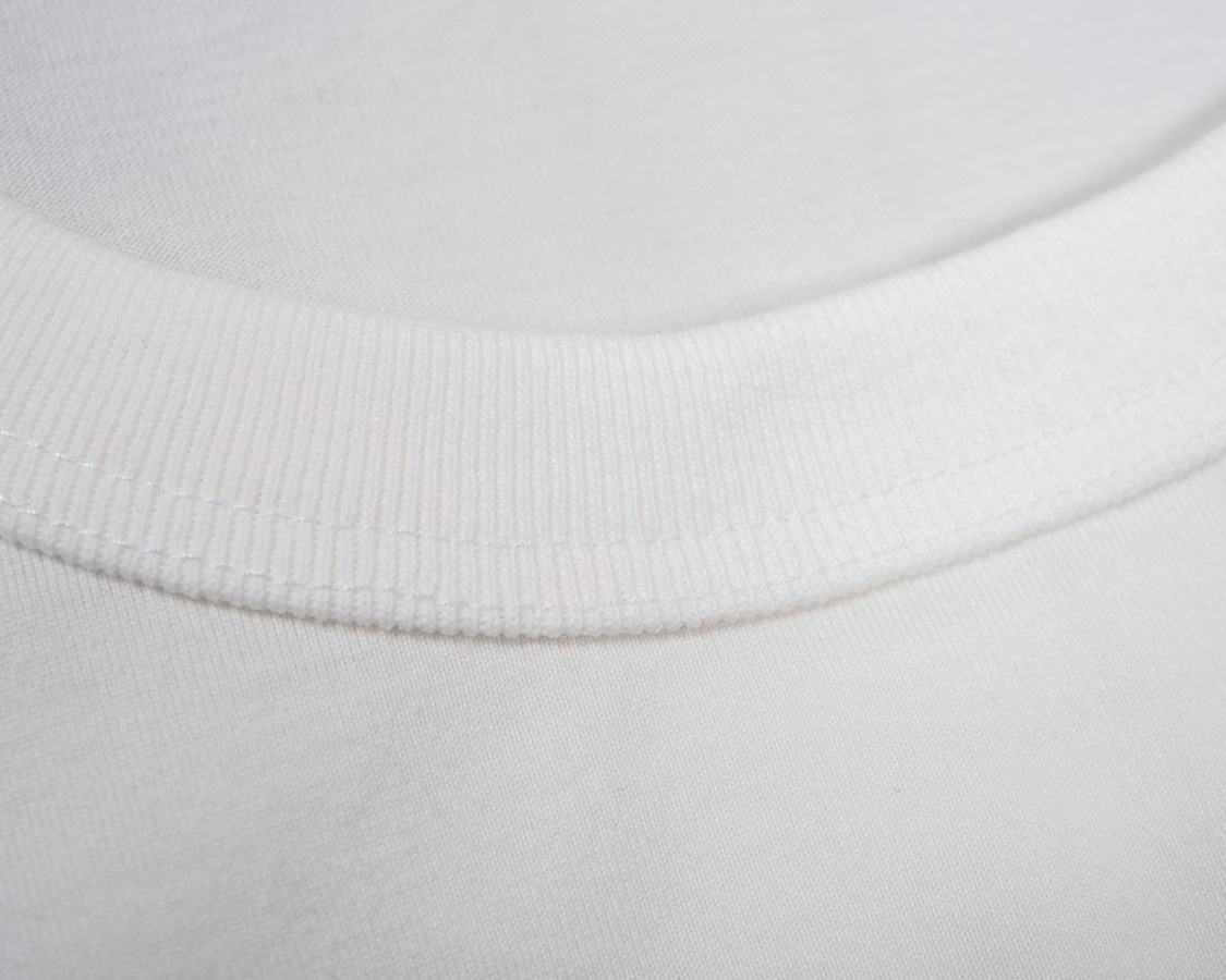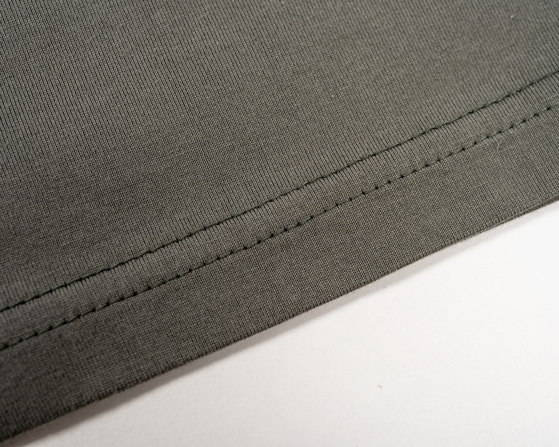 アップにしてみると、生地の目が綺麗にそろっているのが良くわかります。これが、3本の糸を、それぞれの撚りと逆方向により合わせたことで、撚る力が打ち消しあっているため、ここまで目が綺麗にそろうのです。 Slimが細目に対し、Regular/Roomyは太目のバインダー。カジュアルな見た目に合わせて、フライス自体も少し厚手の物を使用。