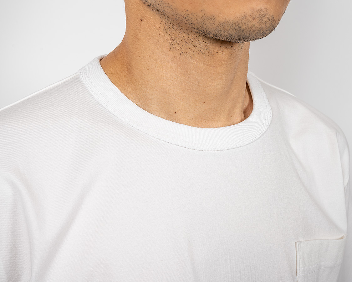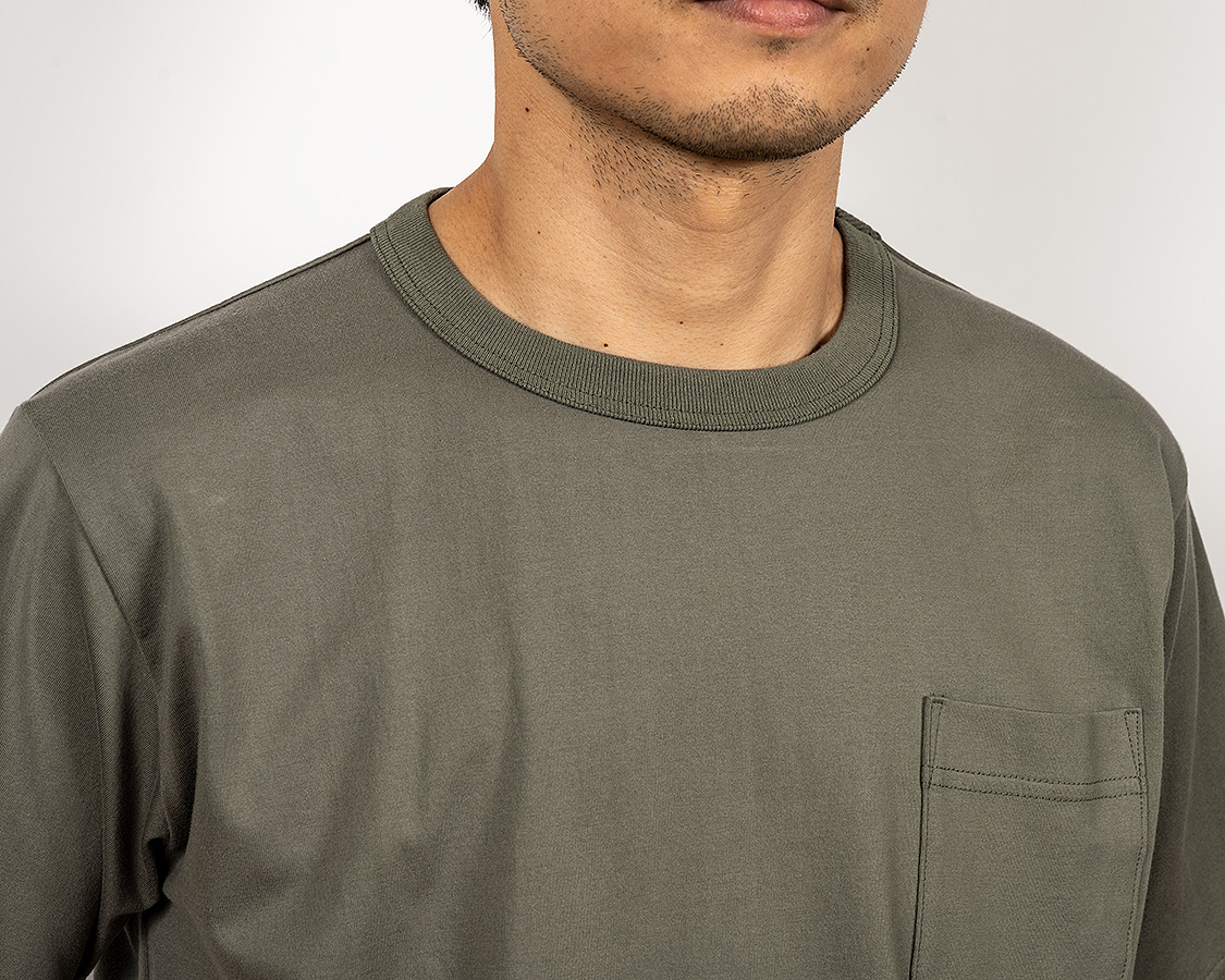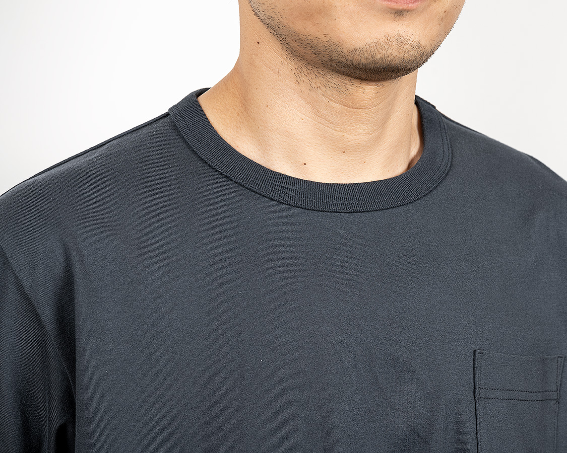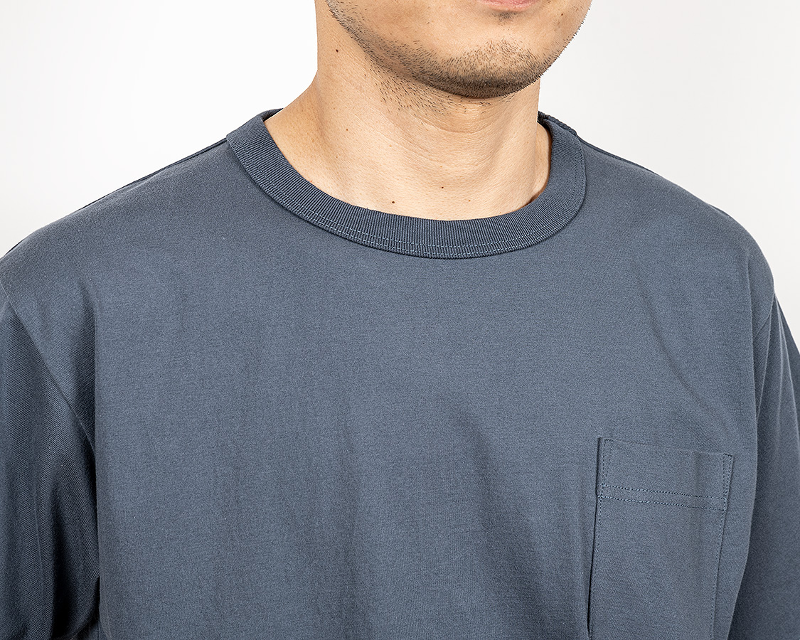Foliageだとよくわかります。首回り、2022SSまでのRegular Fitは「つけ襟」と呼ぶ、身頃にリブを地縫いするタイプ。それに対し、2023SSは「バインダー」というリブで身頃をくるむタイプ。そのバインダーもSlimが細いバインダーに対し、Regular Fit/ Roomy Fitは太めのバインダー。身頃のゆったりした雰囲気に合わせてバインダーの幅を変えました。