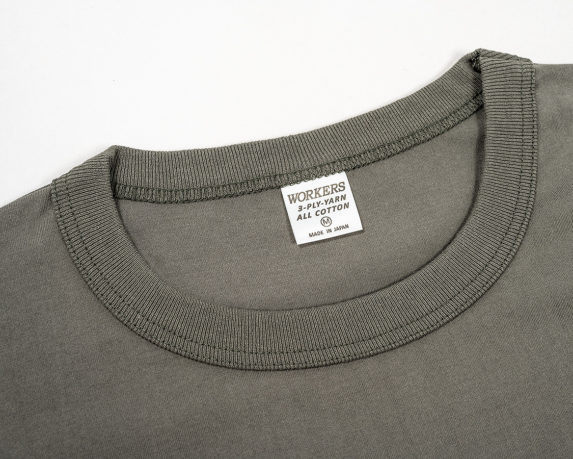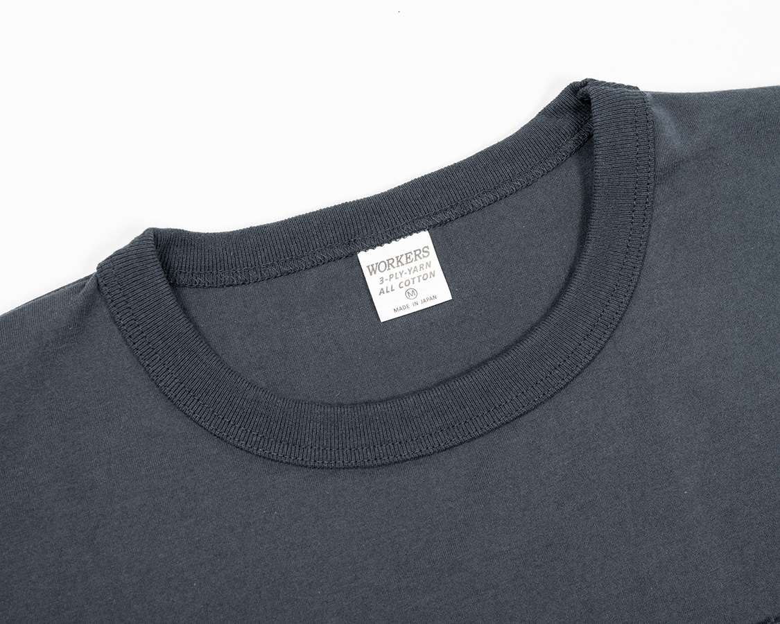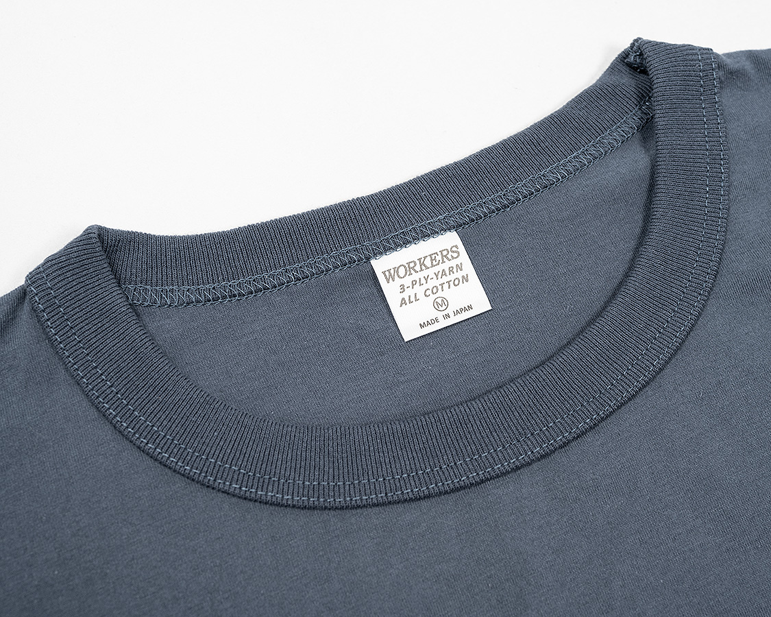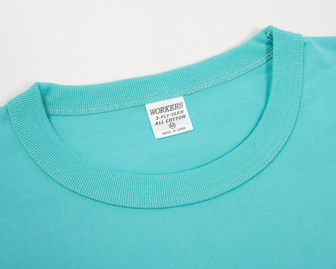 Regularは少し太目のバインダーに変更。去年までは「つけ襟」と呼ばれる、リブを二つ折りして身頃とつなぐ方法でした。「つけ襟」にも良さがあり、身頃より短い「つけ襟」を伸ばしながら取り付けると首に沿いやすいのです。
