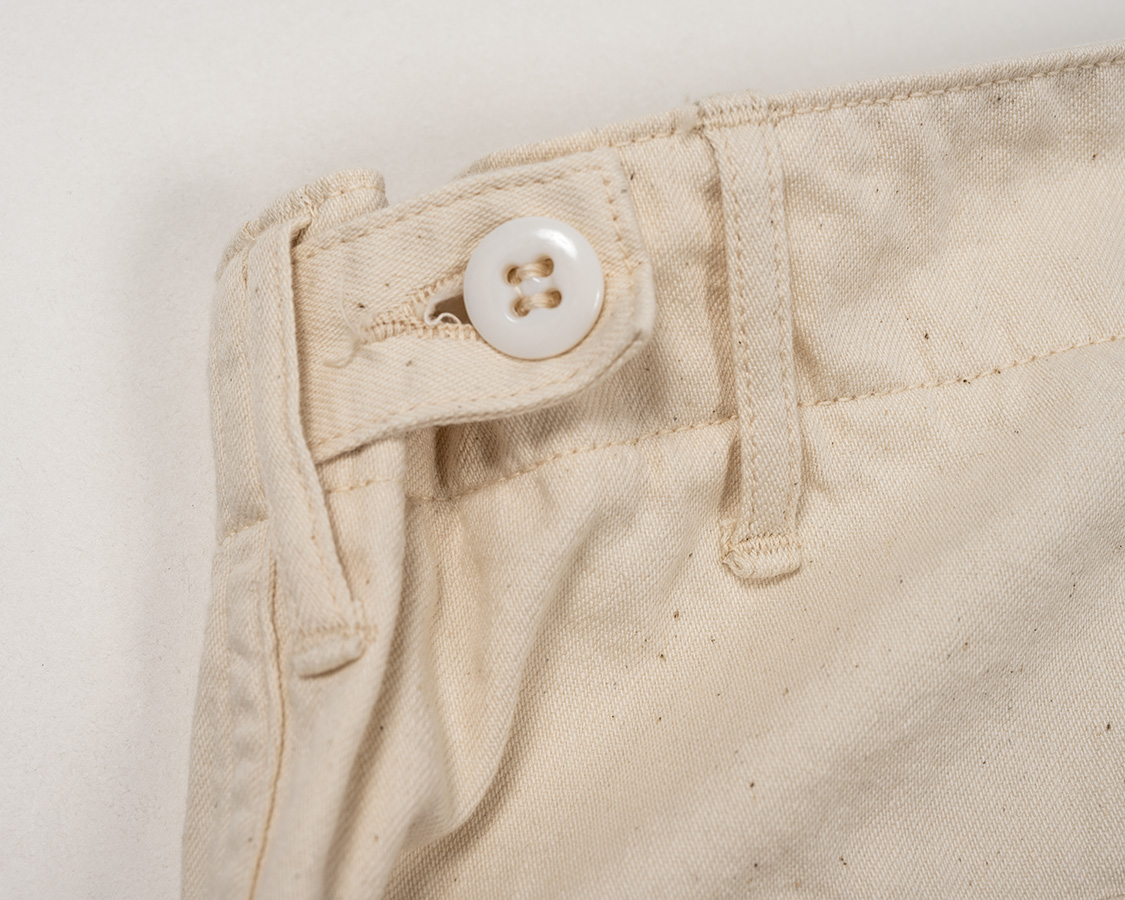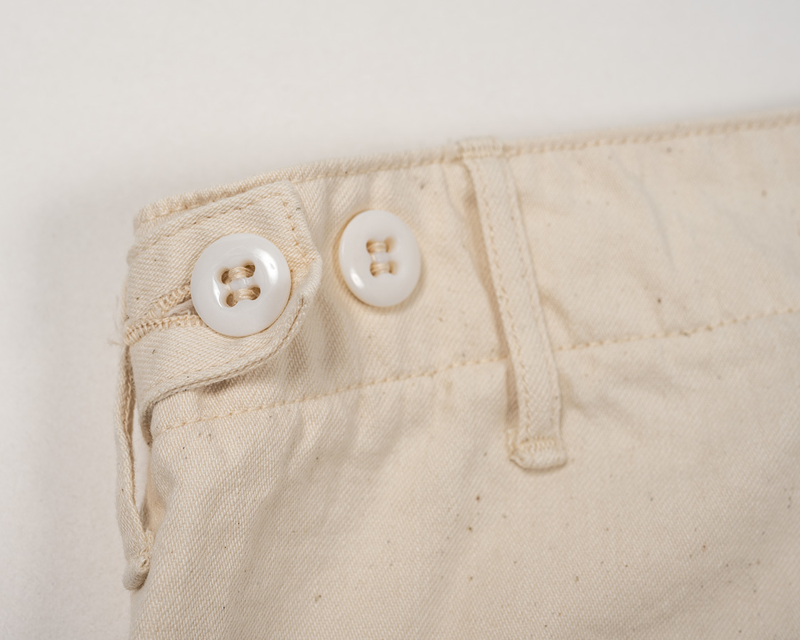 ボタンで閉じてちょうどよいサイズ感ではくと、ヒップにゆとりが出ます。つまり、ボタンを外側にとめている状態ではちょっと緩いかな?ぐらいのサイズを選んでいただくとベストです。