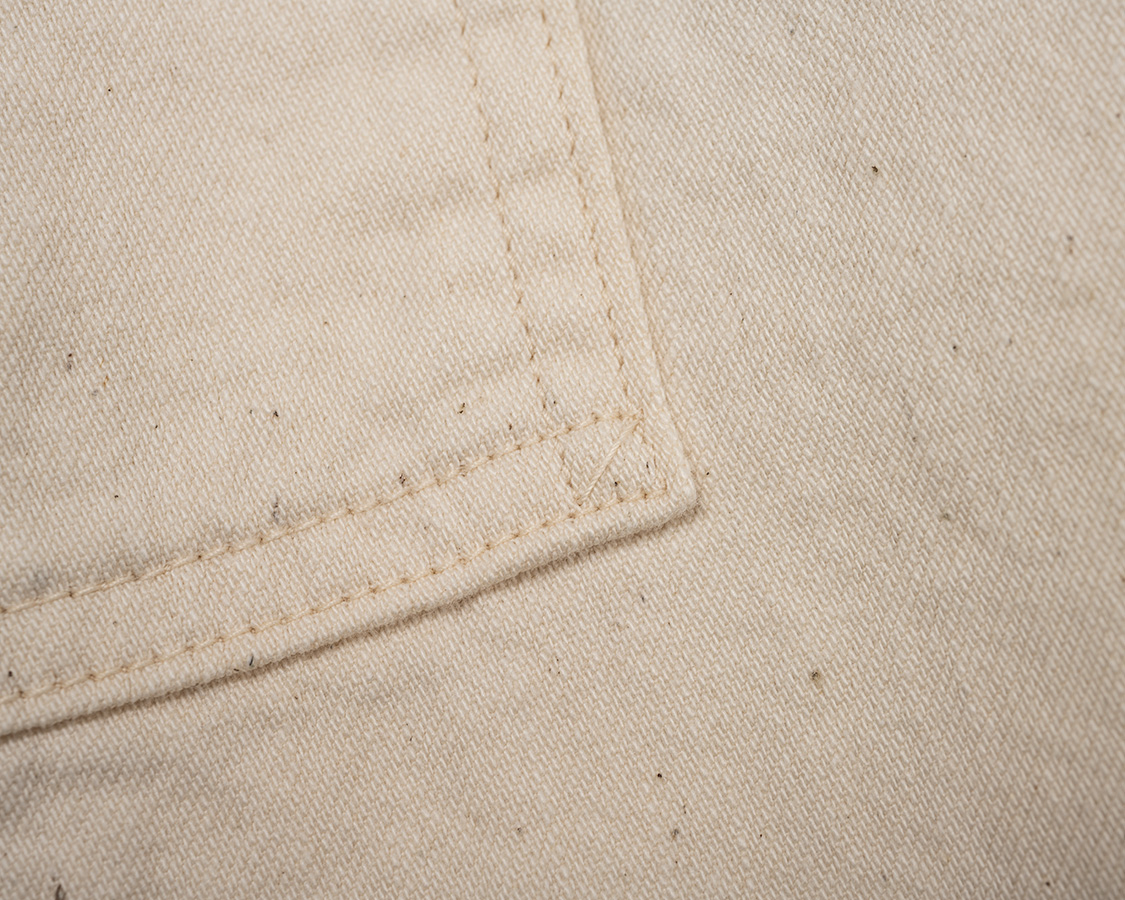 二本針で縫う部分、角々に通称「チョウチョ」と呼ばれる糸渡し。現代の二本針ミシンは針位置停止という、片方の針を止める機構があるのでチョウチョを出さない縫い方もできるのですが、そこはあえて出してもらってます。