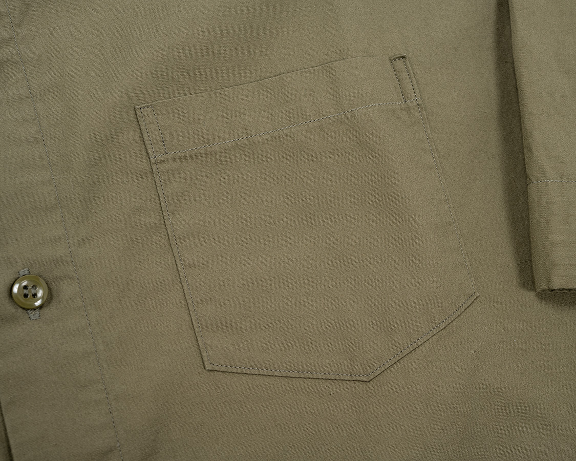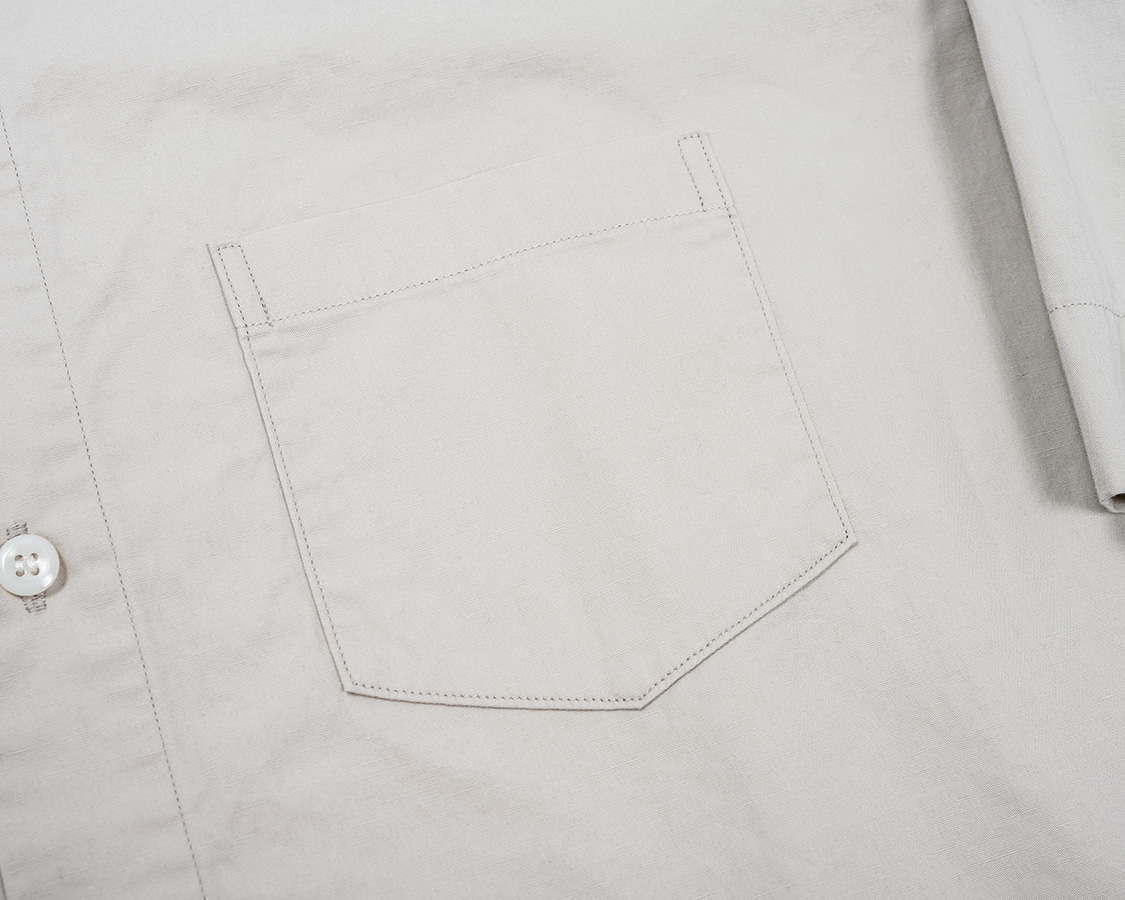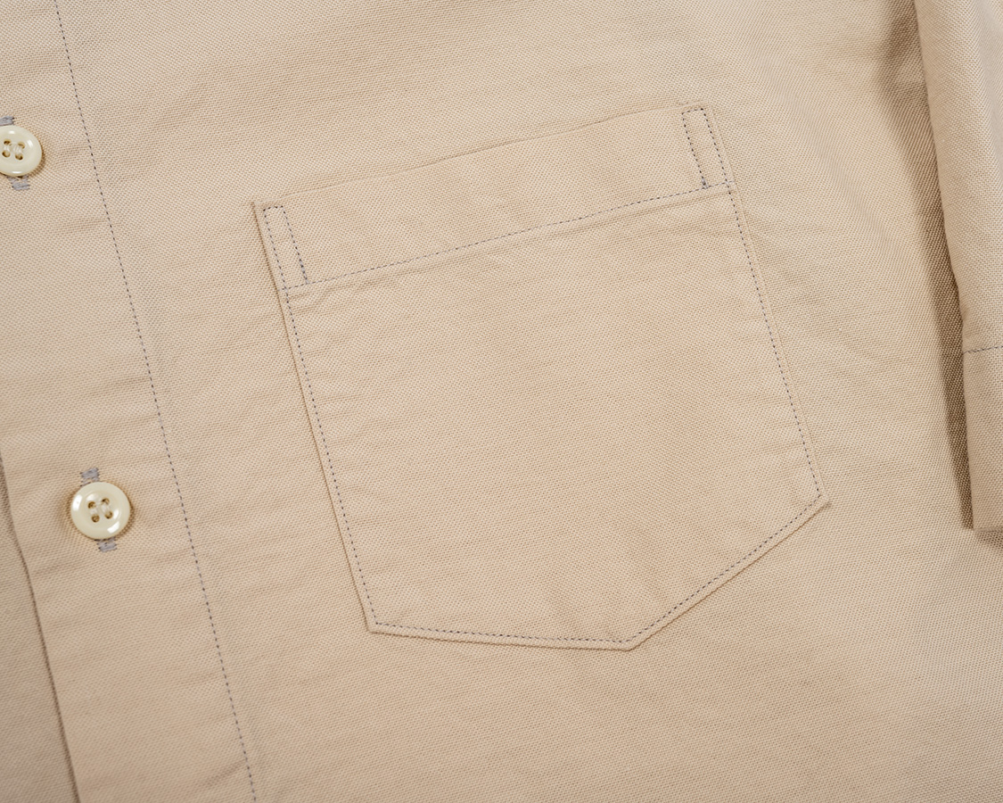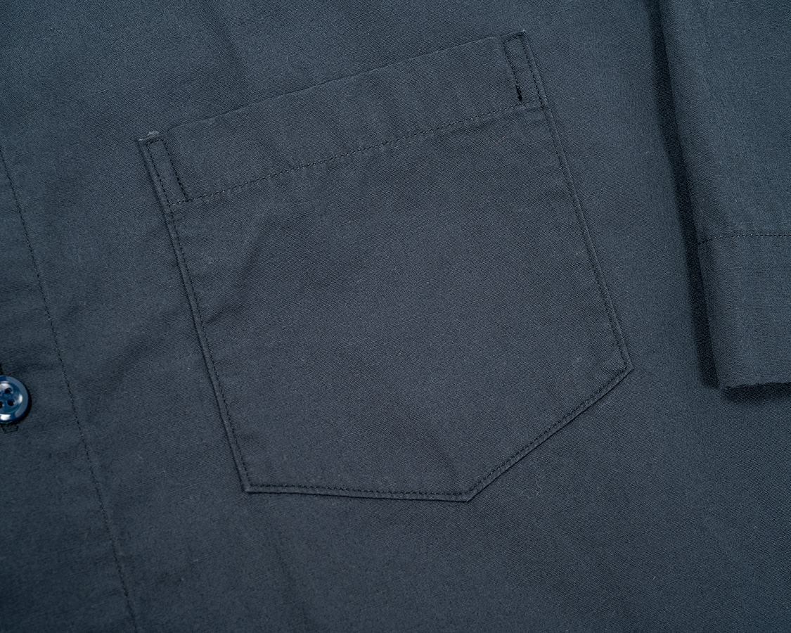 シャツとしての機能性を考えポケットは残す。やっぱりあれば、ちょっとカギを入れたり使います。角は四角に縫い、面で補強。ステッチの点・線でなく面に力がかかることでテンションを分散さえようという仕様。