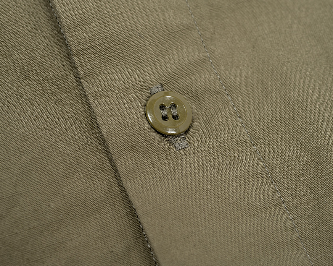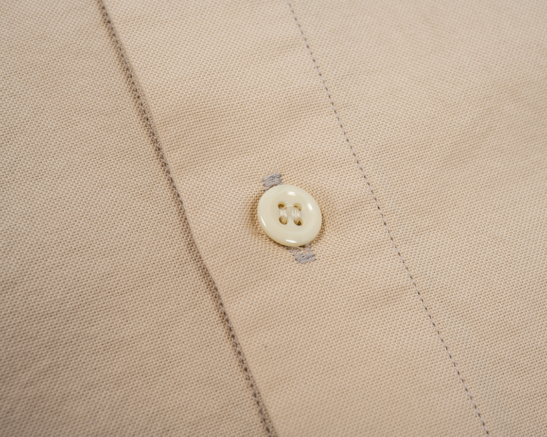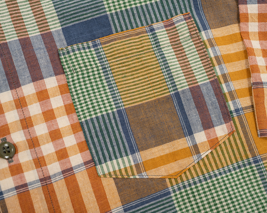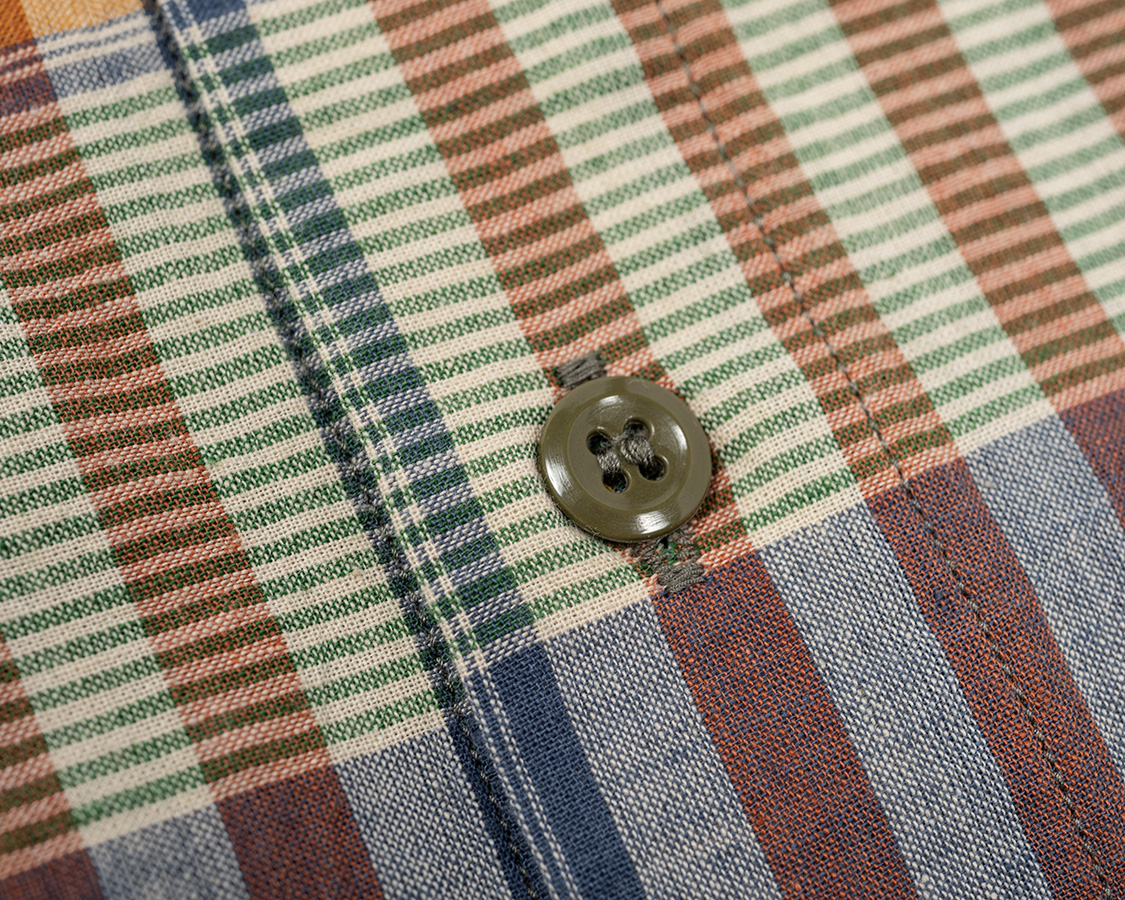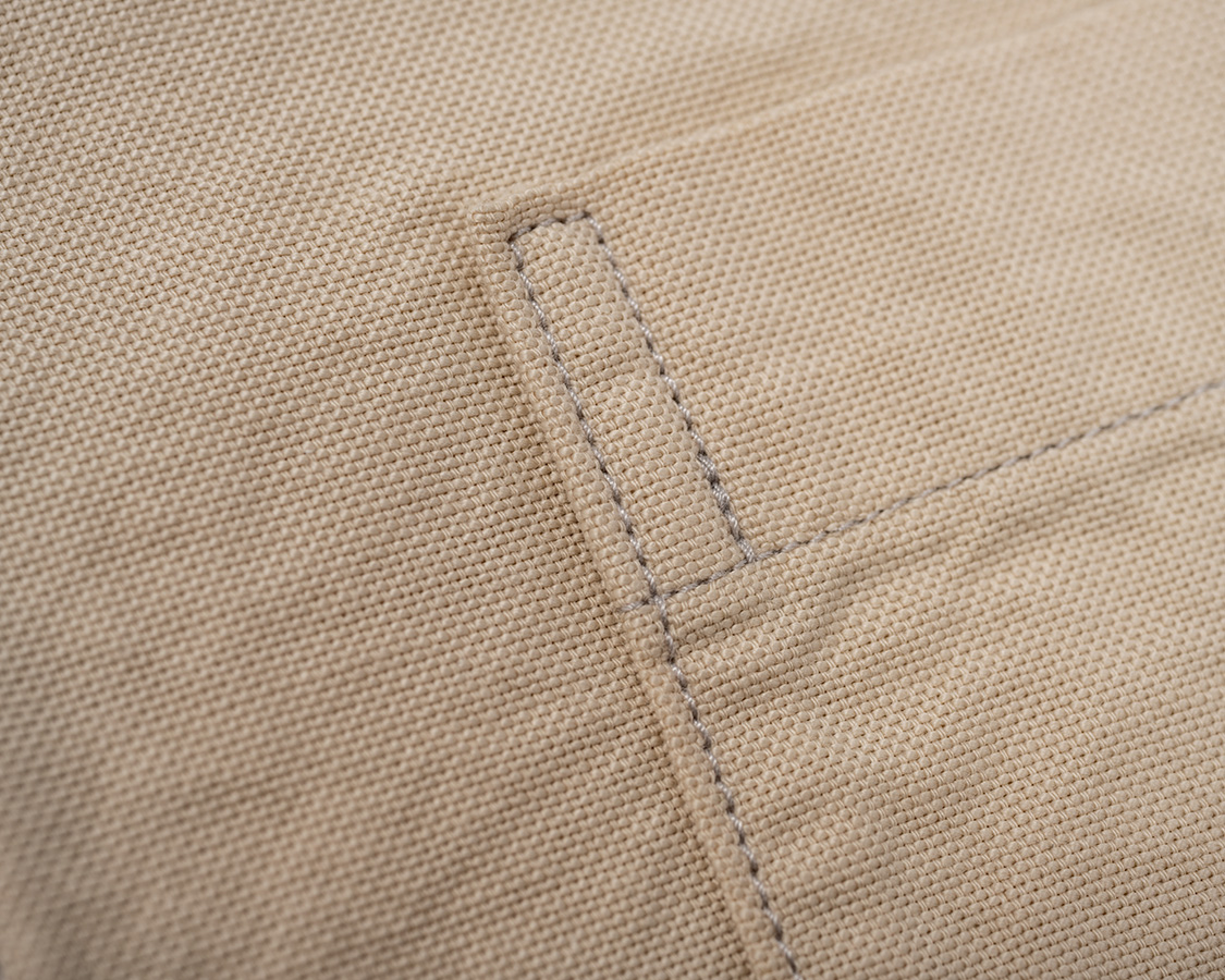 シャツとしての機能性を考えポケットは残す。やっぱりあれば、ちょっとカギを入れたり使います。角は四角に縫い、面で補強。ステッチの点・線でなく面に力がかかることでテンションを分散さえようという仕様。