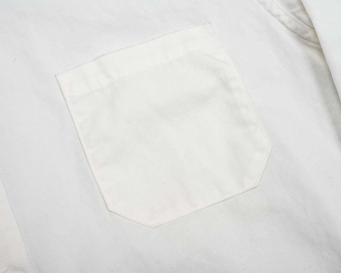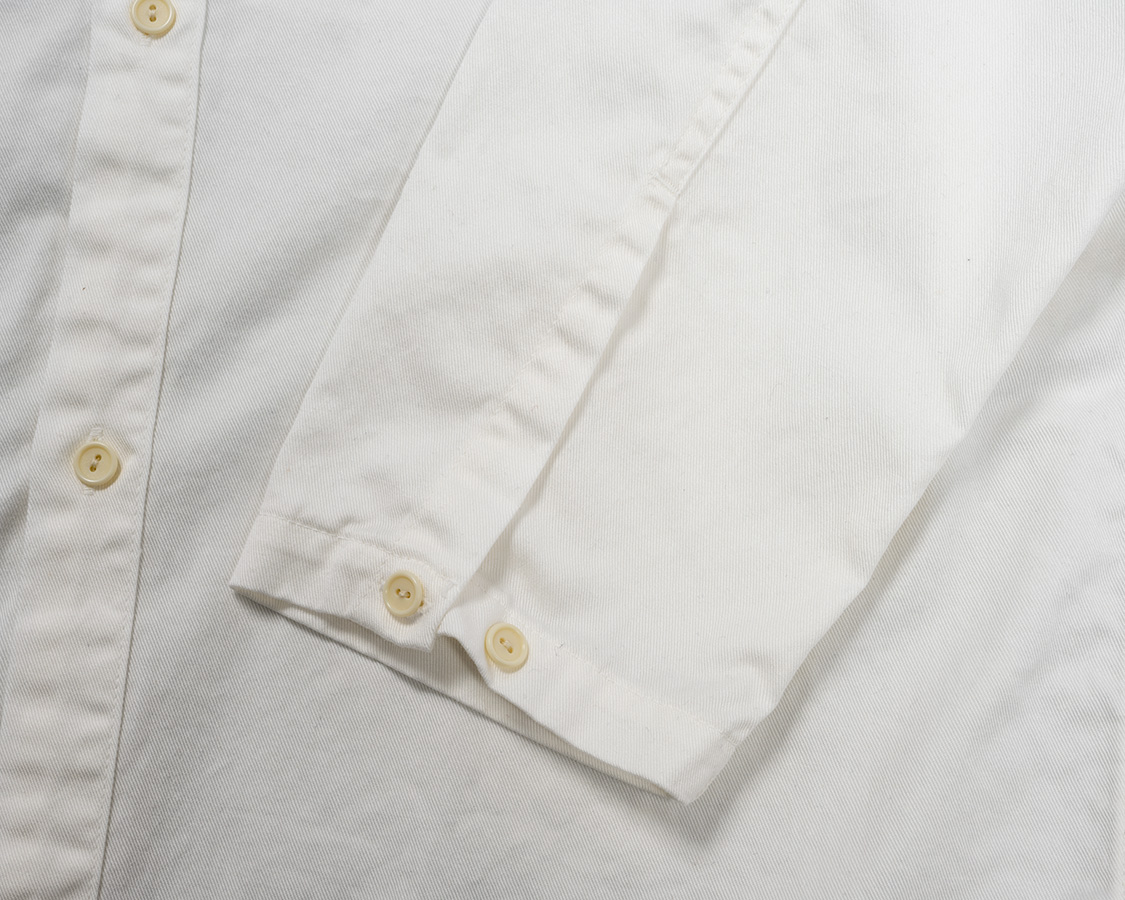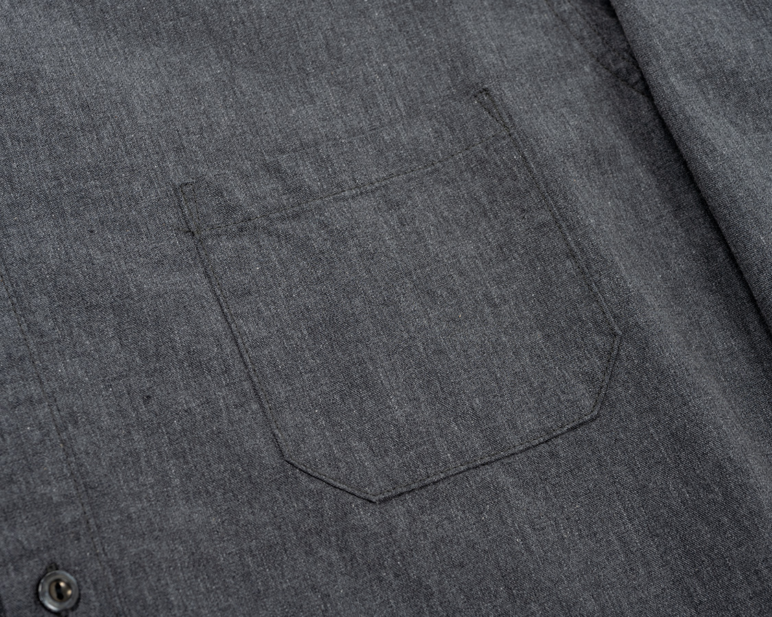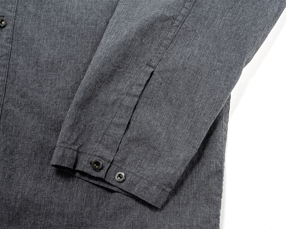 本来なら、見返し始末する部分を続き裁ちにして折って始末したらどうかな?と考えました。これもシンプルというか、プリミティブというか、独特な雰囲気でこのシャツに良く合ってます。