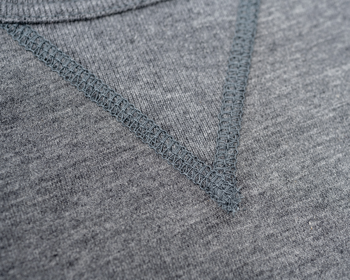 前Vアップ。身頃の天竺とは組織が違う、フライス(リブ)が三角にたたきつけられているのがよくわかります。