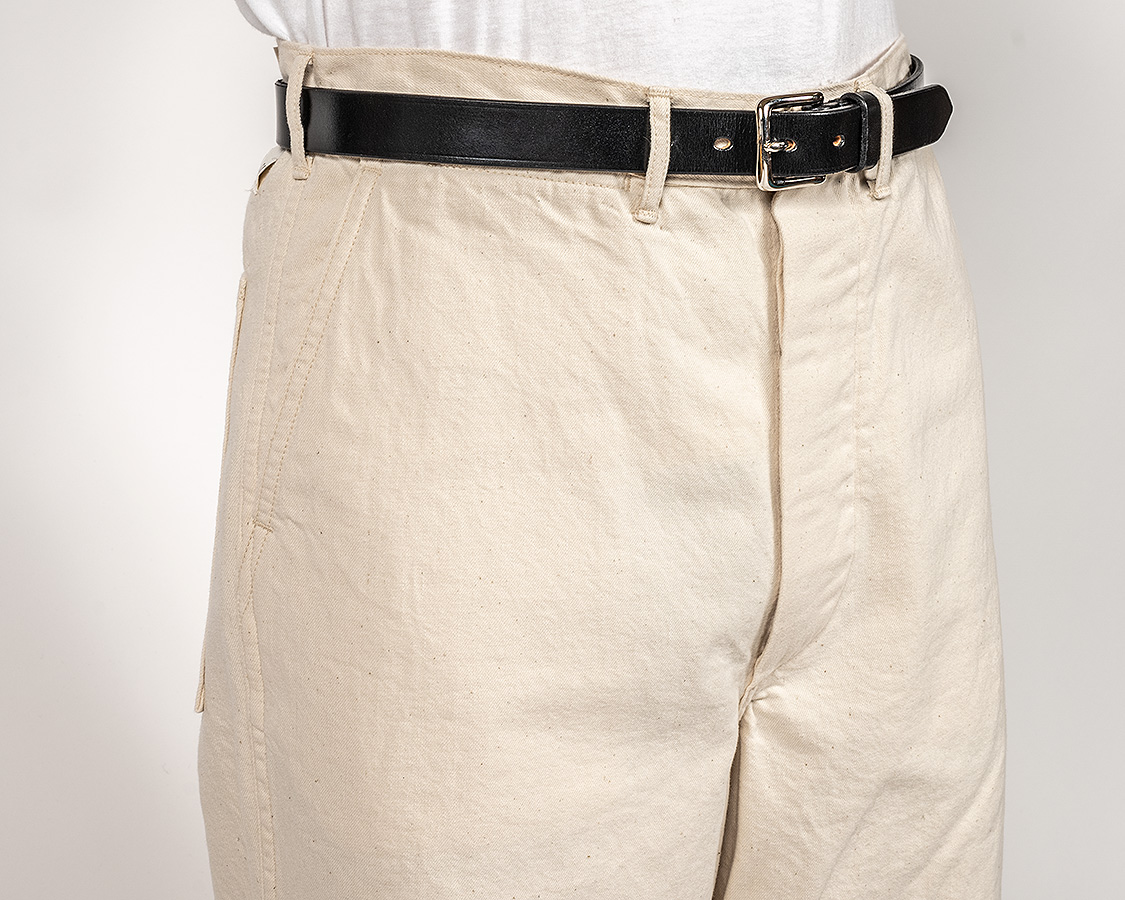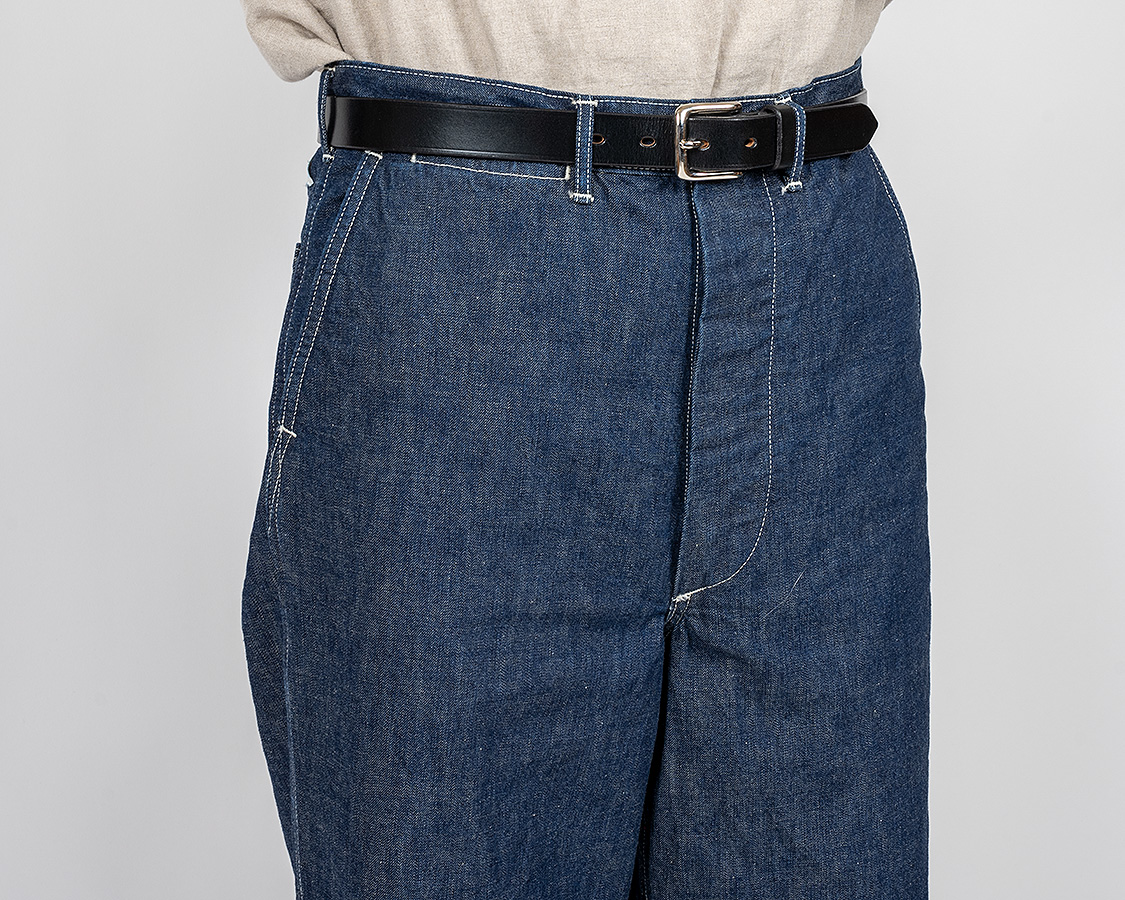 Slimよりだいぶ深いまた上。広いワタリ。ポケットは斜め切り替えでチノパンのようだけど、腰帯がある。