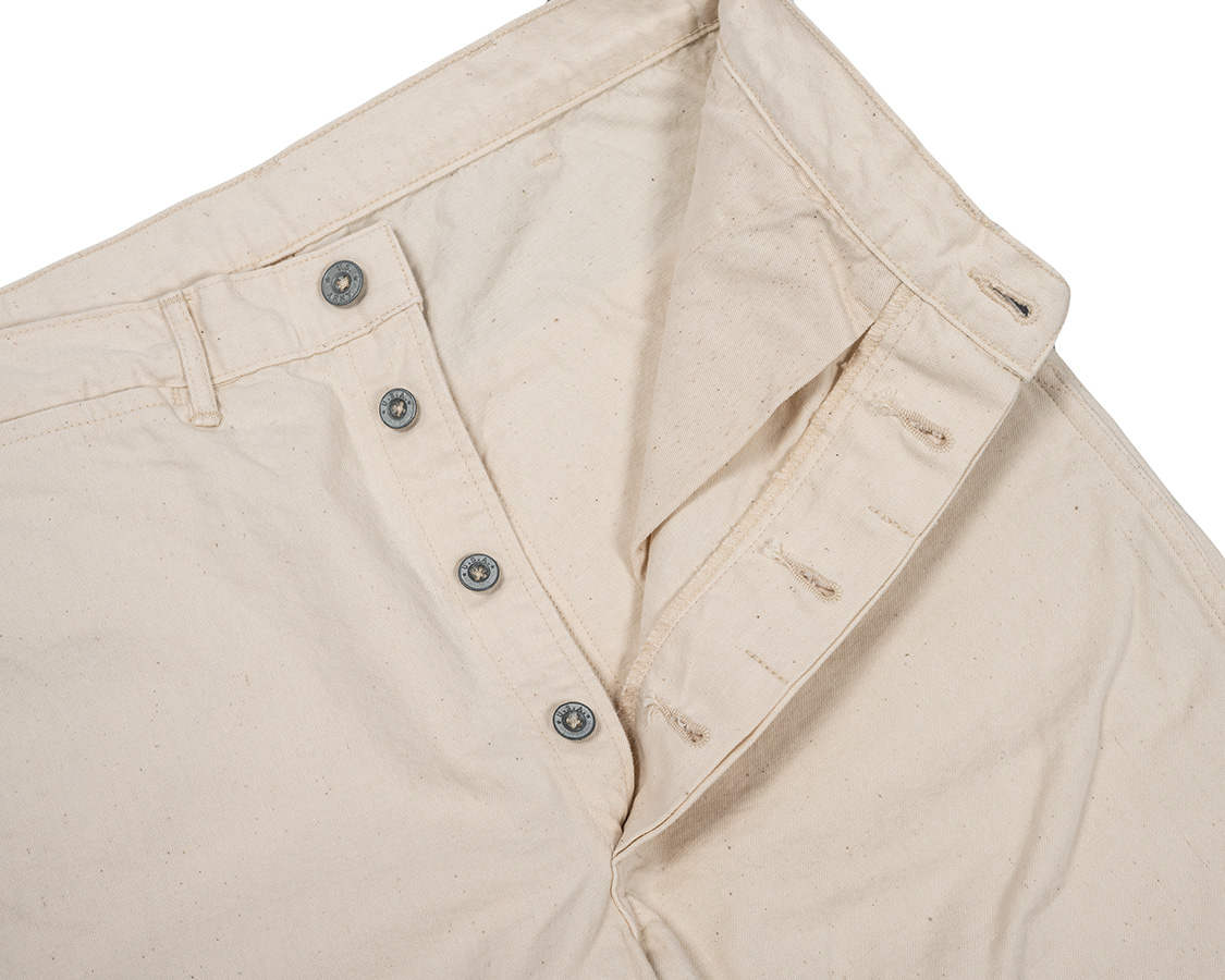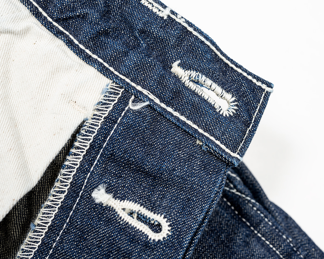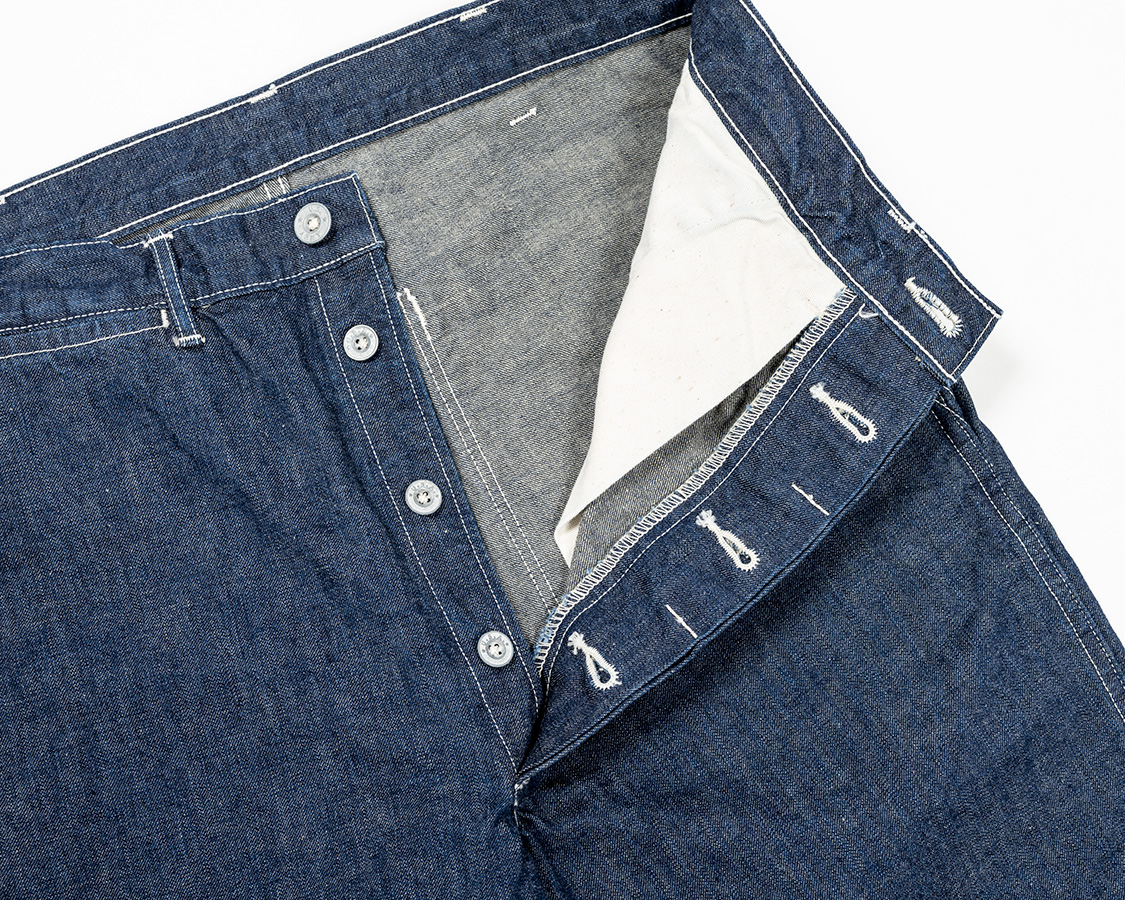 フロントはボタンフライ。ボタンがつく側は「続きモチダシ」と呼ばれたりする、身頃がそのまま続き裁ちになった仕様。