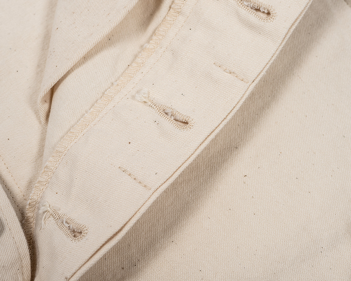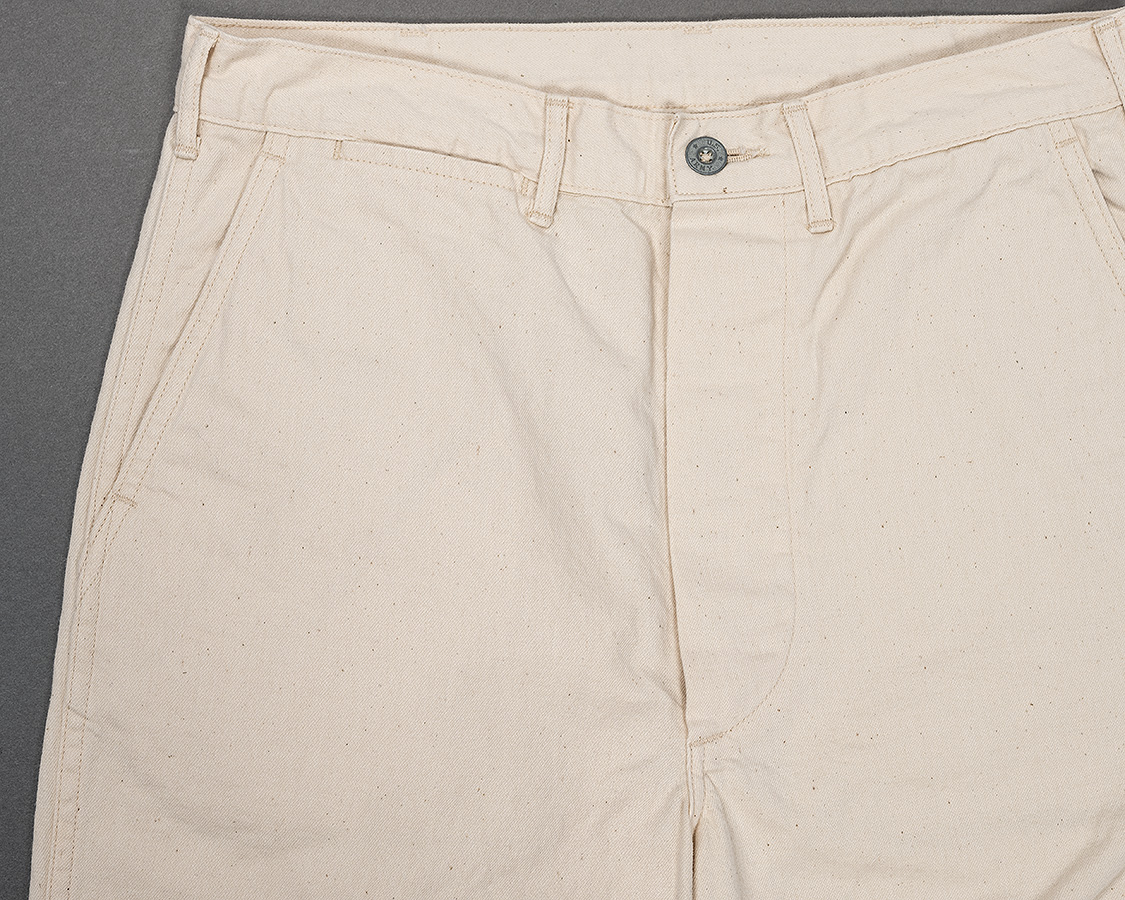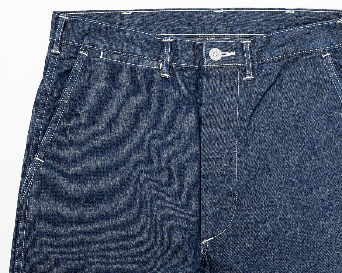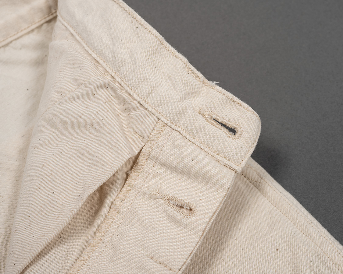 フロントはボタンフライ。ボタンがつく側は「続きモチダシ」と呼ばれたりする、身頃がそのまま続き裁ちになった仕様。