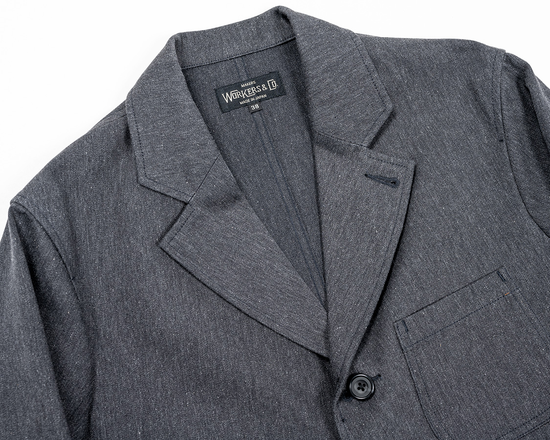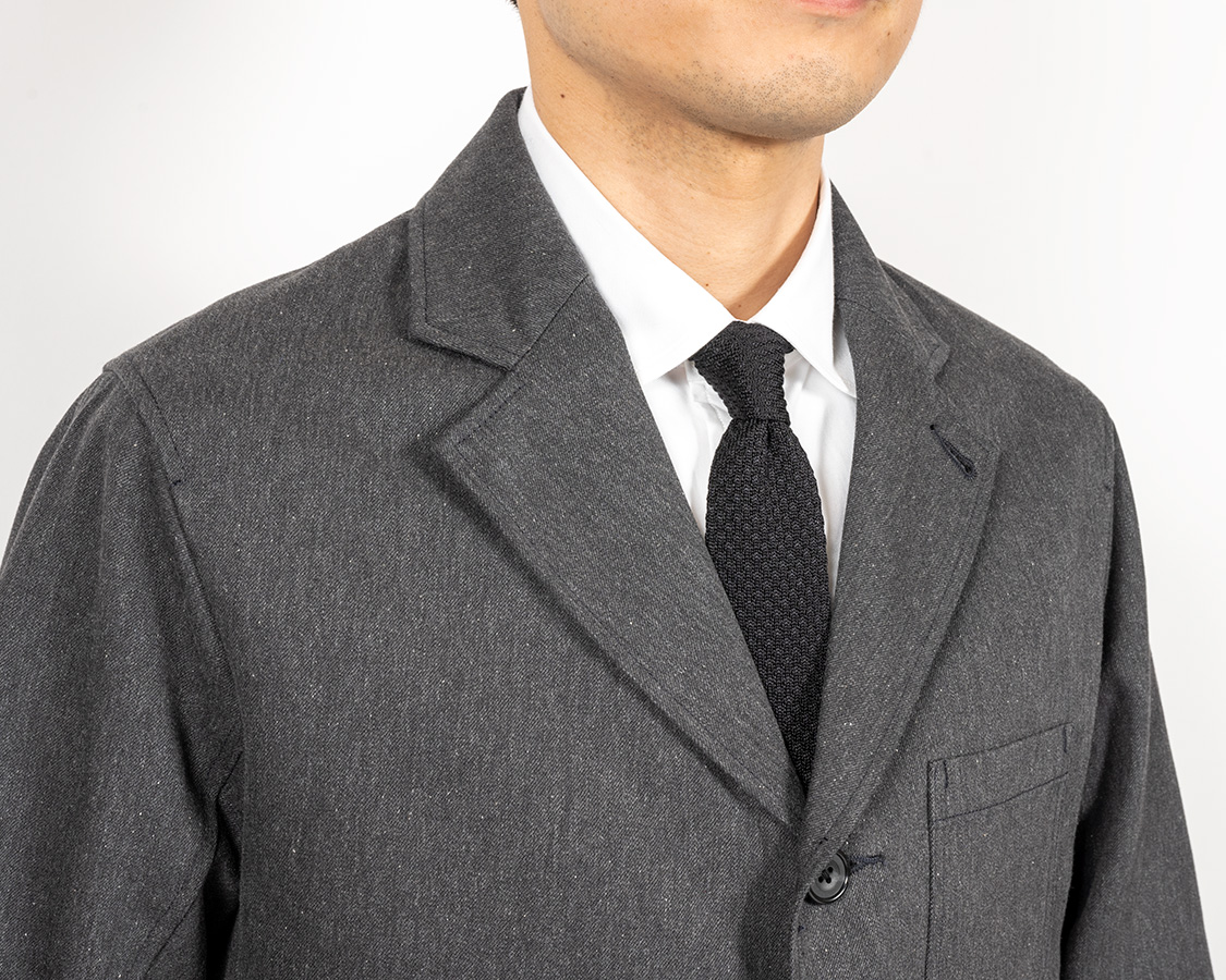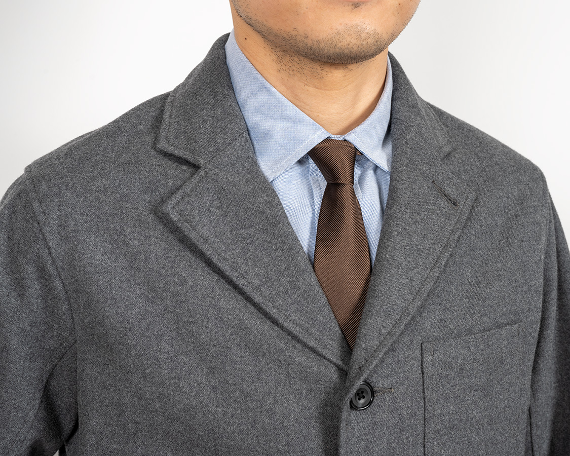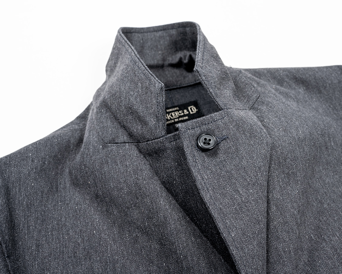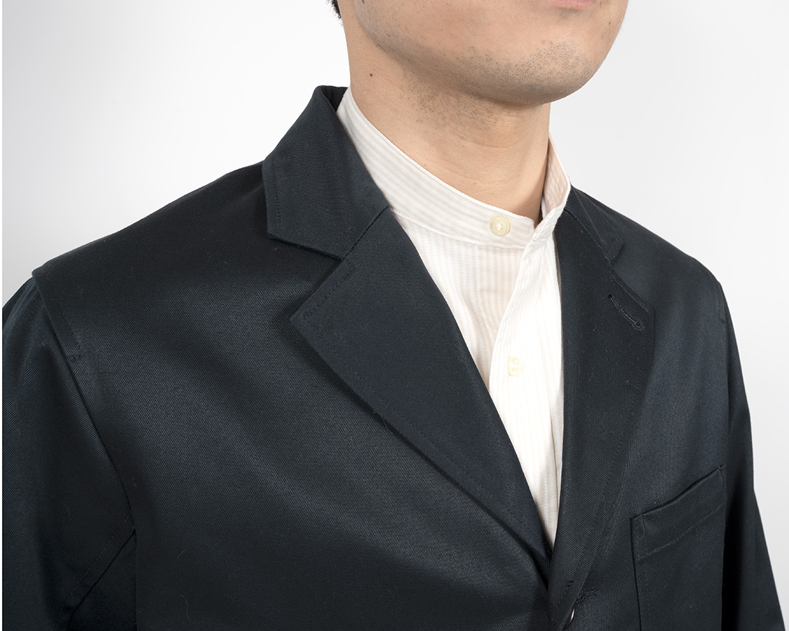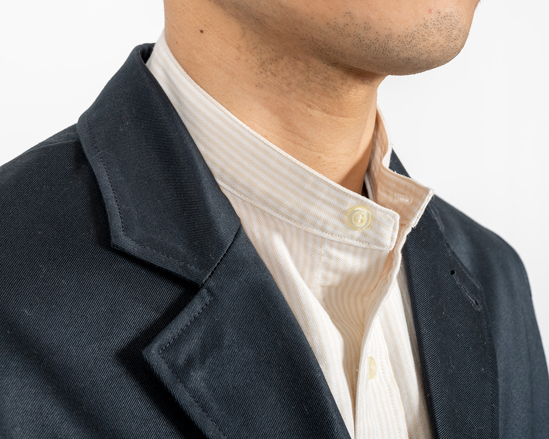 中に着たBand Collar Shirtとのバランスを見てください。Band Collarとはいえ、Modified BDの台襟を元にしているのできちっと首がジャケットに直接触れないようにカバーされています。