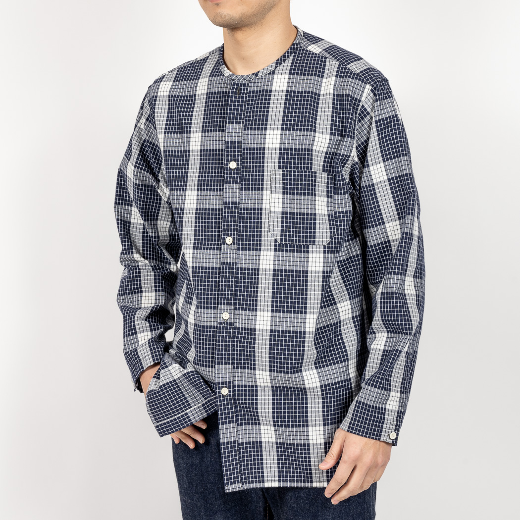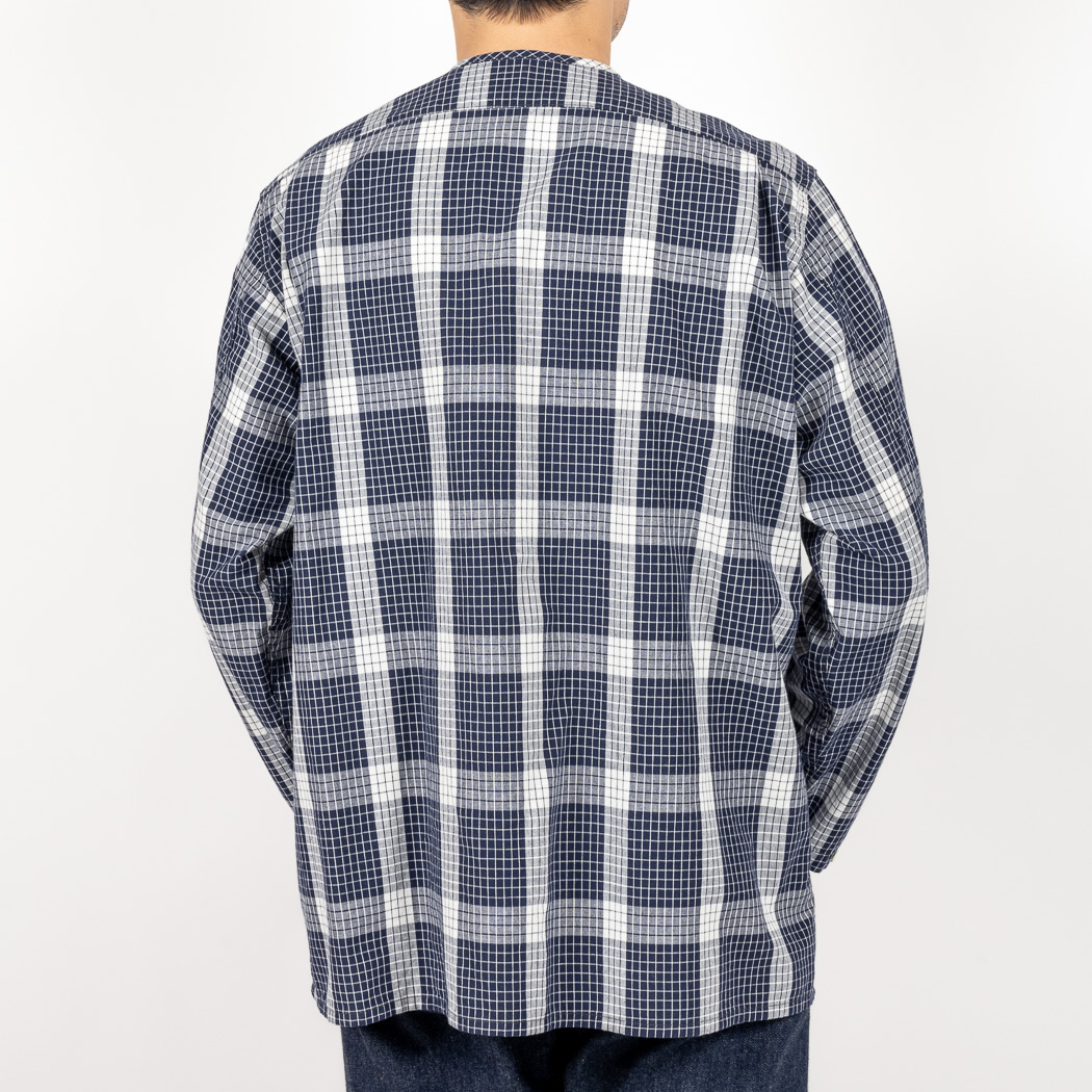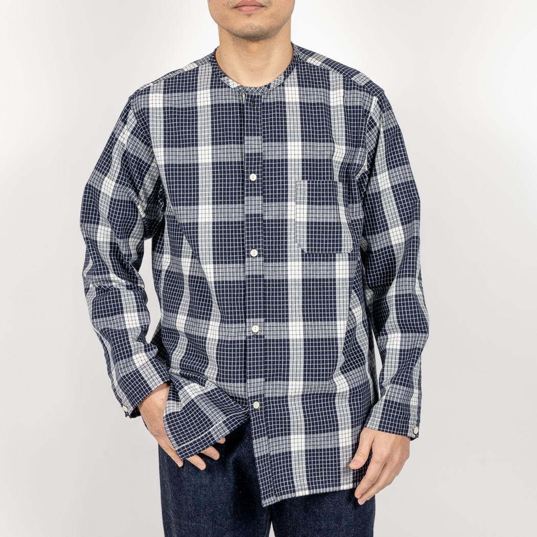素材、ネイビーチェックは5.5 オンス程、通年着られるシャツの厚み。ネイビーはインディゴのように見えますが、反応染めなので色落ちの心配はほとんど無し。