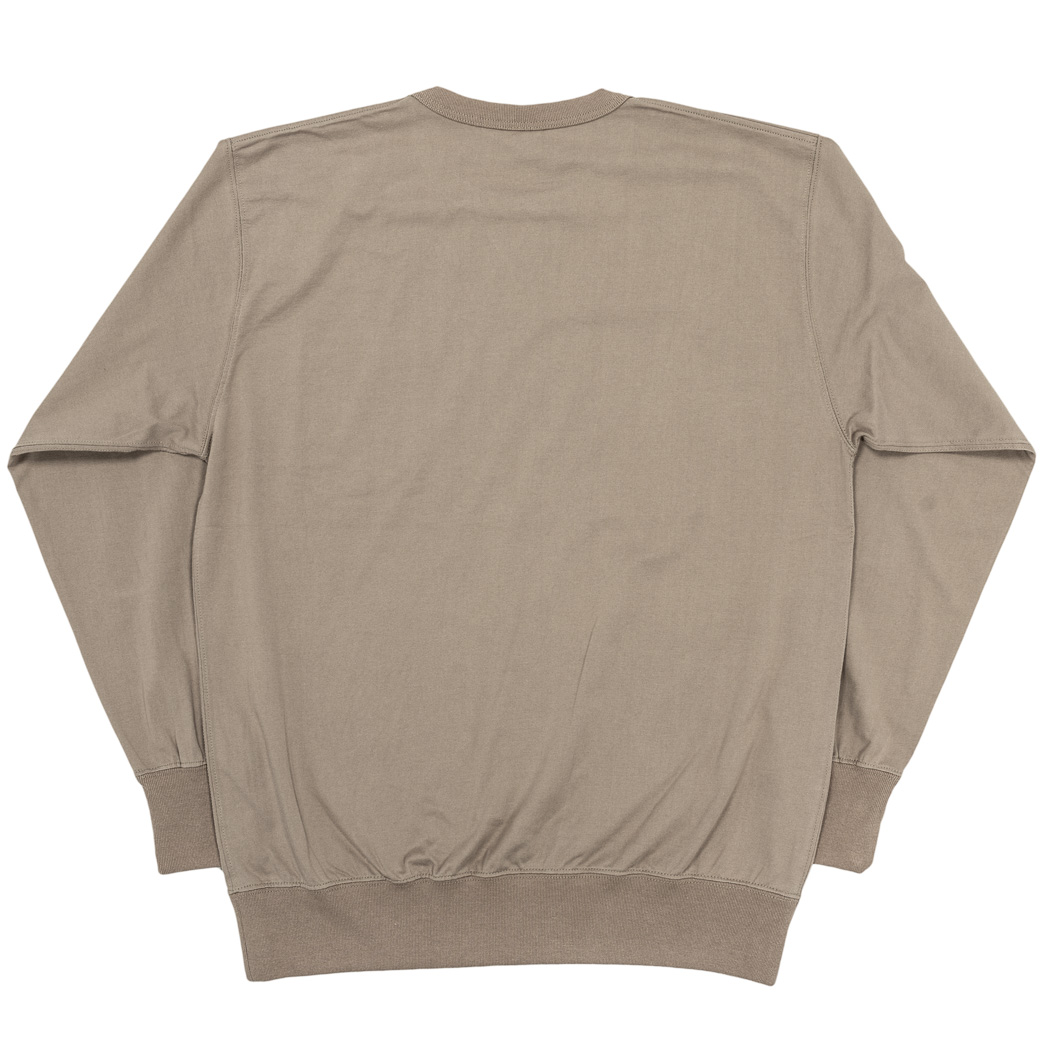3 PLY Sweat Shirt、仕様はスウェットそのもの。前 V たたきつけ、袖口・裾はリブできゅっと絞る。首回り、リブ太め バインダー始末。首回りをリブでパイピング状に縫うので厚みが出て伸びにくい始末。