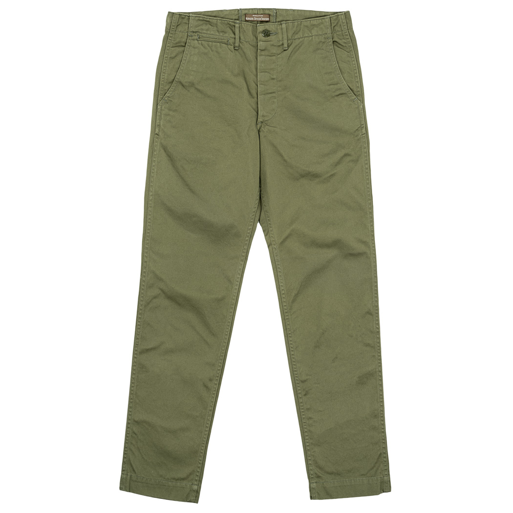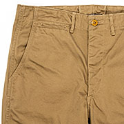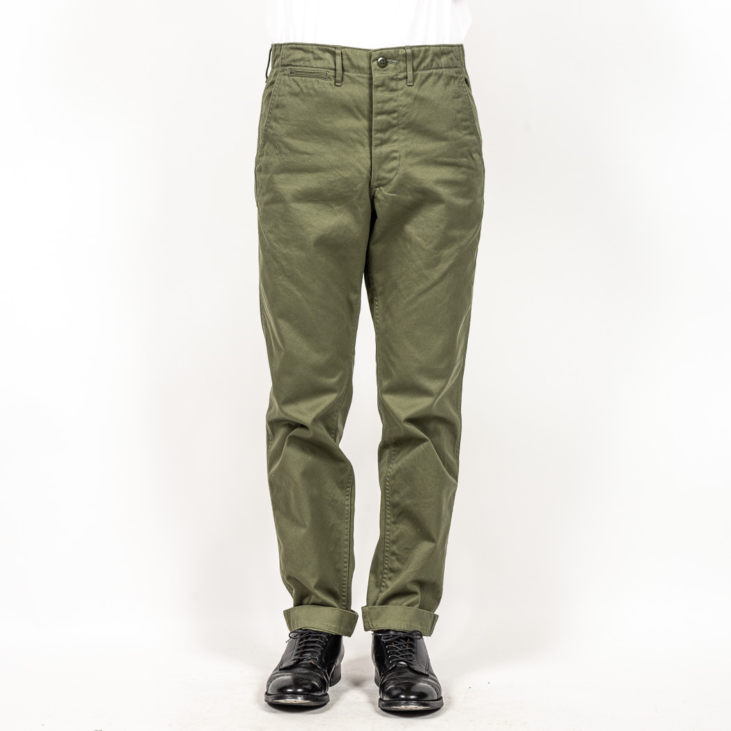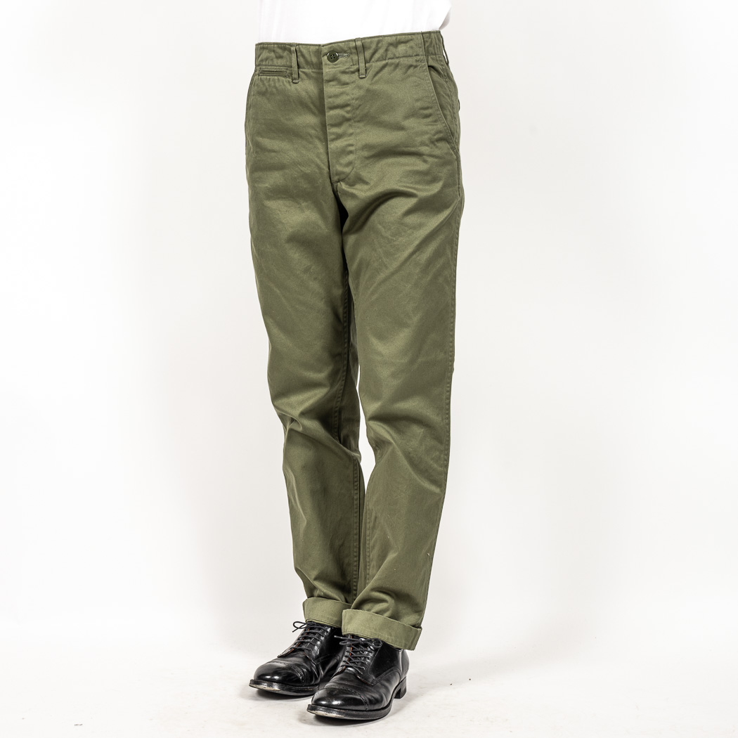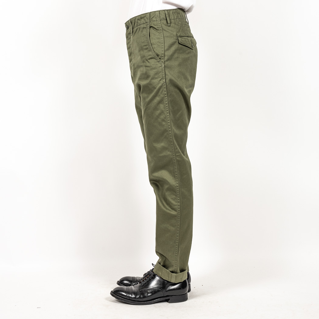 素材は10オンスクラスの高密度チノ。オリーブ、いわゆる薄目のOD色。軍パンのODは上に同系統のODを持ってこなければなんでも合います。ネイビーのジャケット、ブルーのボタンダウン、シャンブレーのワークシャツなどなど・・・