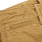フロント、斜め切り替えポケットは手を入れやすい角度、大きさに。小股にあえてチノパンらしくないステッチを入れる 仕様。以前は「チノパンといえばこの仕様」にとらわれていてやらなかったのですが、偶然見つけたビンテージで小股に ステッチありを確認。「そうか、ビンテージも色々あるのだな、だったら、とことん機能性や綺麗に縫製出来る仕様を極めてみよう」とこの小股のステッチからWORKERSらしいチノパンは始まったのです。人から見れば「そんなところ?」 という箇所も、企画する側はとても悩みます。