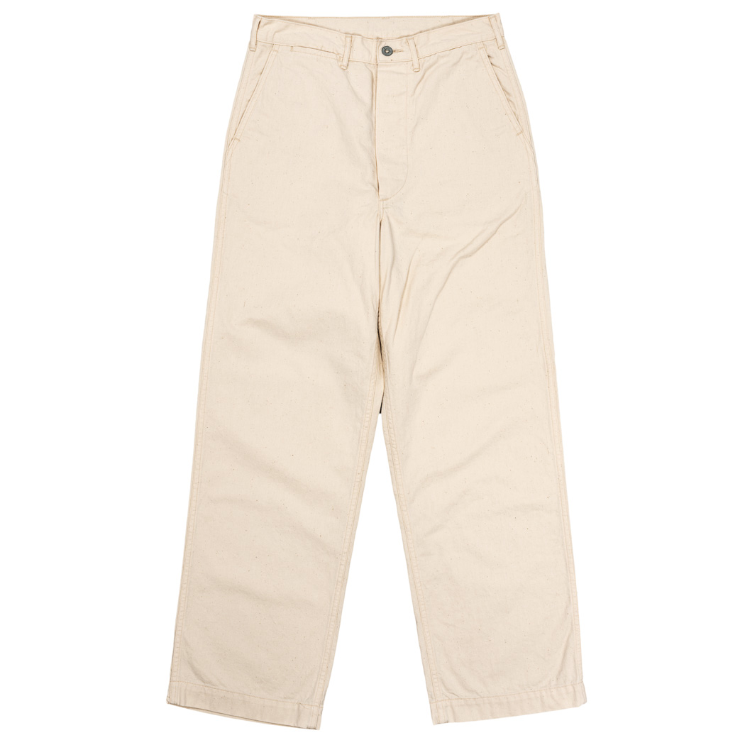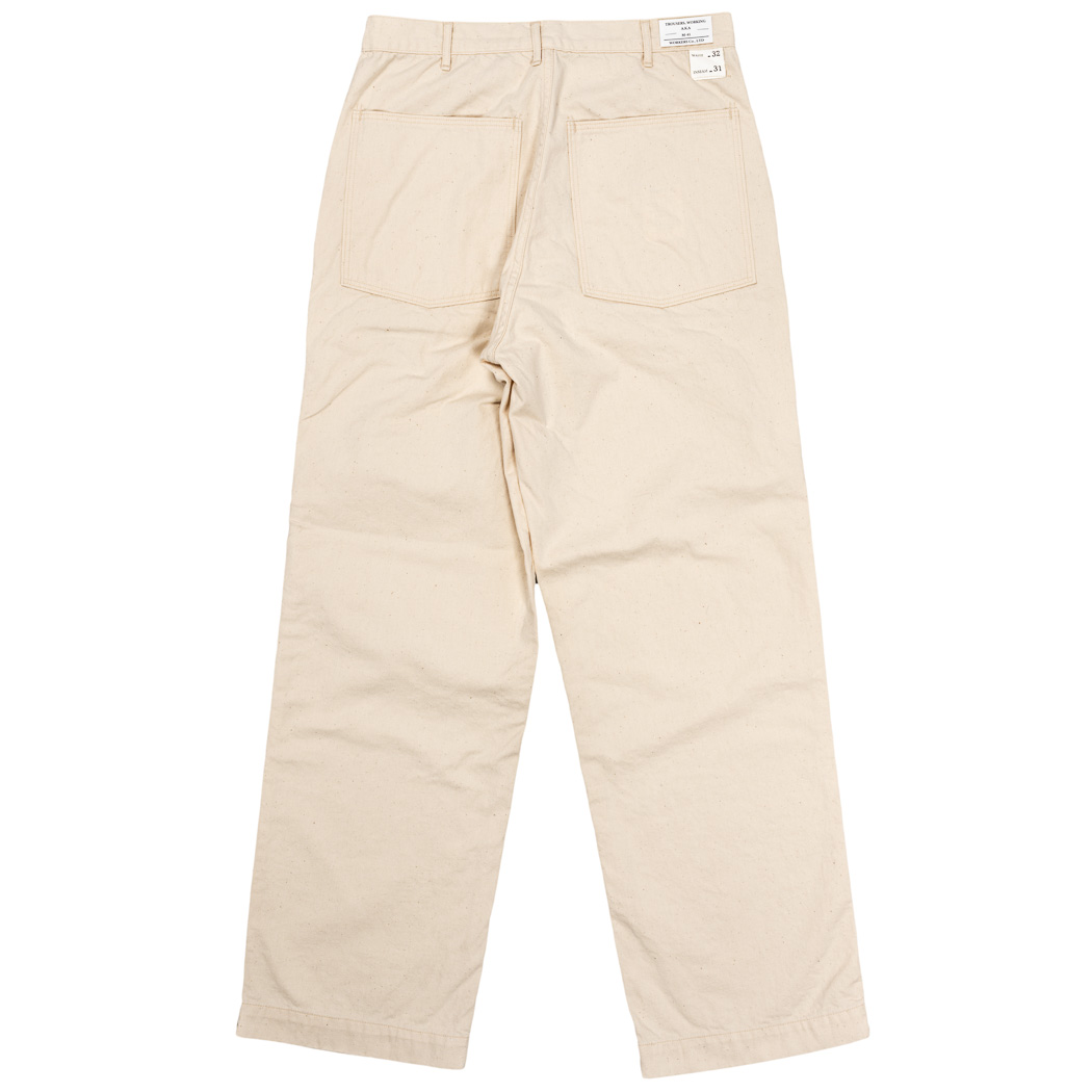 素材、 アレンジで生成りデニム。真っ白ではなく、生成り。そのため、生地表面には綿の葉カスが少し残っています。穿きこみ、汚れて、洗う。繰り返すと徐々に生成りが白っぽくなっていきます。