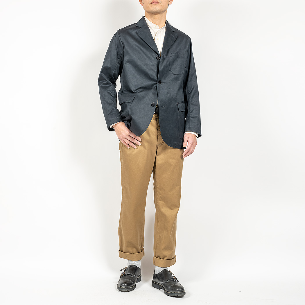 表地、ネイビーチノ、コットンサージはOfficer Trousers Slim とセットアップ。