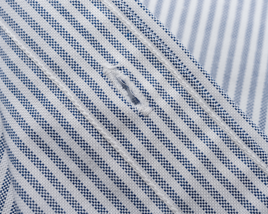 前立てのダブルステッチは裏から見るとチェーンステッチ。WORKERS専用の関西スぺシャル、前立てミシン。この目の細かさ、綿糸の50番で強度を出すために絶対必要。専用ミシンでセッティングすると、やはりきれいに、強度も出て良いのです。最初、ミシンを買うときはミシン屋さんから「WORKERSの為だけに使う」といった時は馬鹿か?と言われましたが。