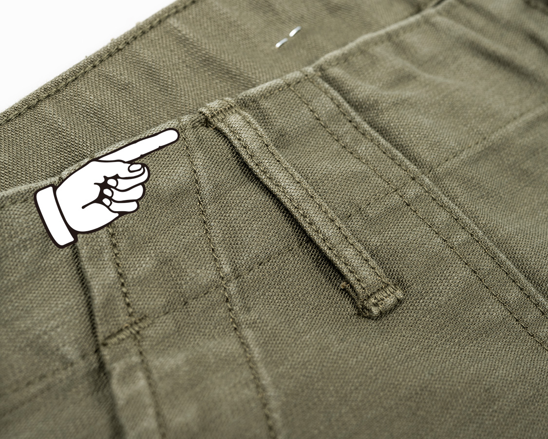 見返しを少し内側に返したポケット口、ポケット開きどまりのカンヌキ。