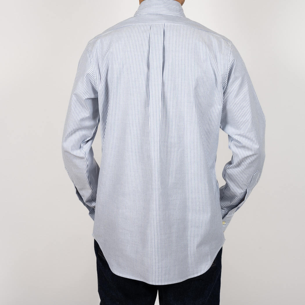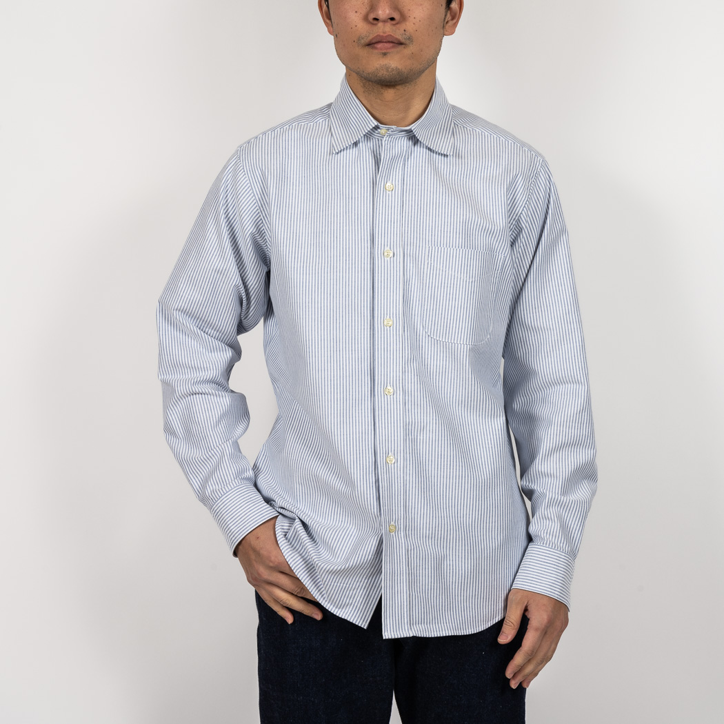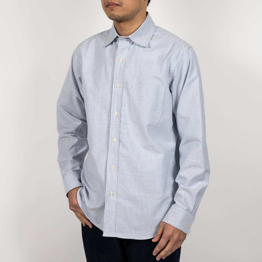 定番のスーピマオックスは少しガサっと固い。着こんでいくと柔らかくなじんでいく。オックスのシャツを襟が擦り切れるまで着た事がある方はわかると思います。あの「ぼろいんだけど着心地が良くて手放せない」までいくのがオックス。ドレスウェアに近い雰囲気で、「育つ」を実感できるのがオックスの面白いところ。重さは5.5オンス、通年着られる厚み。