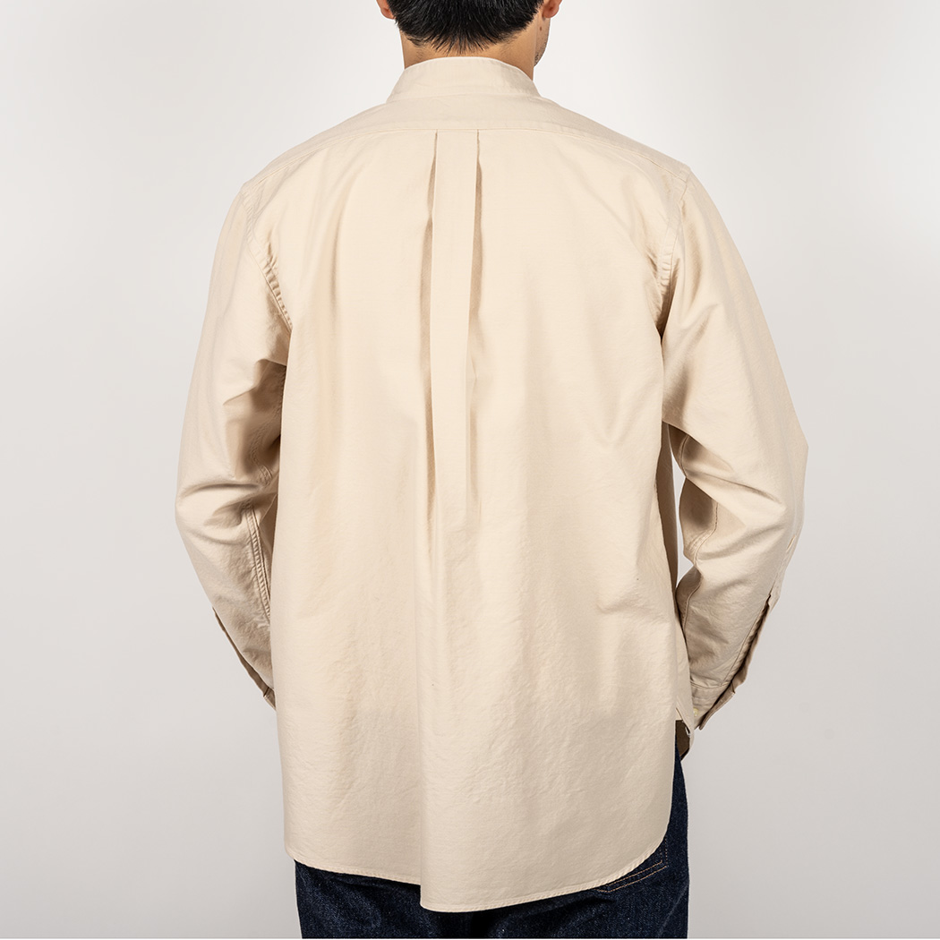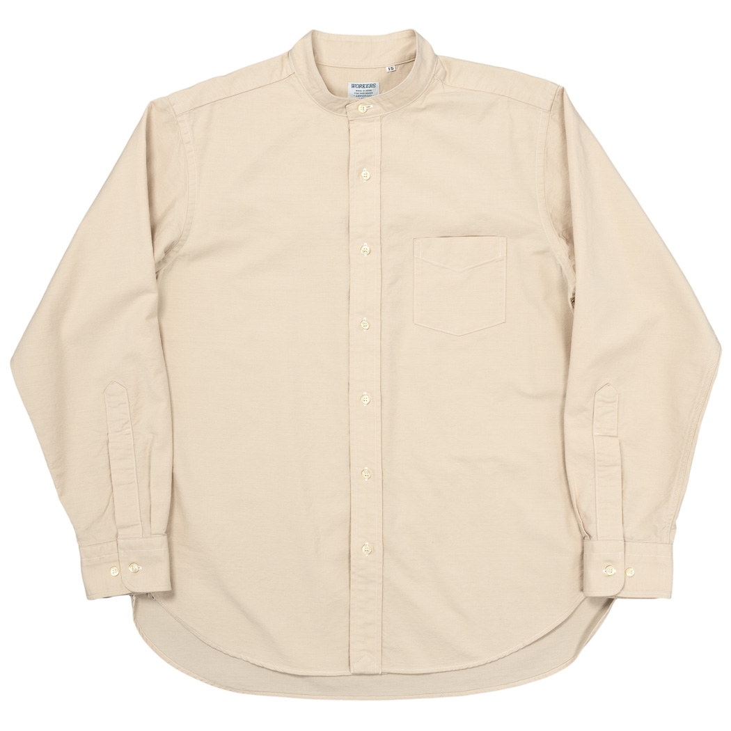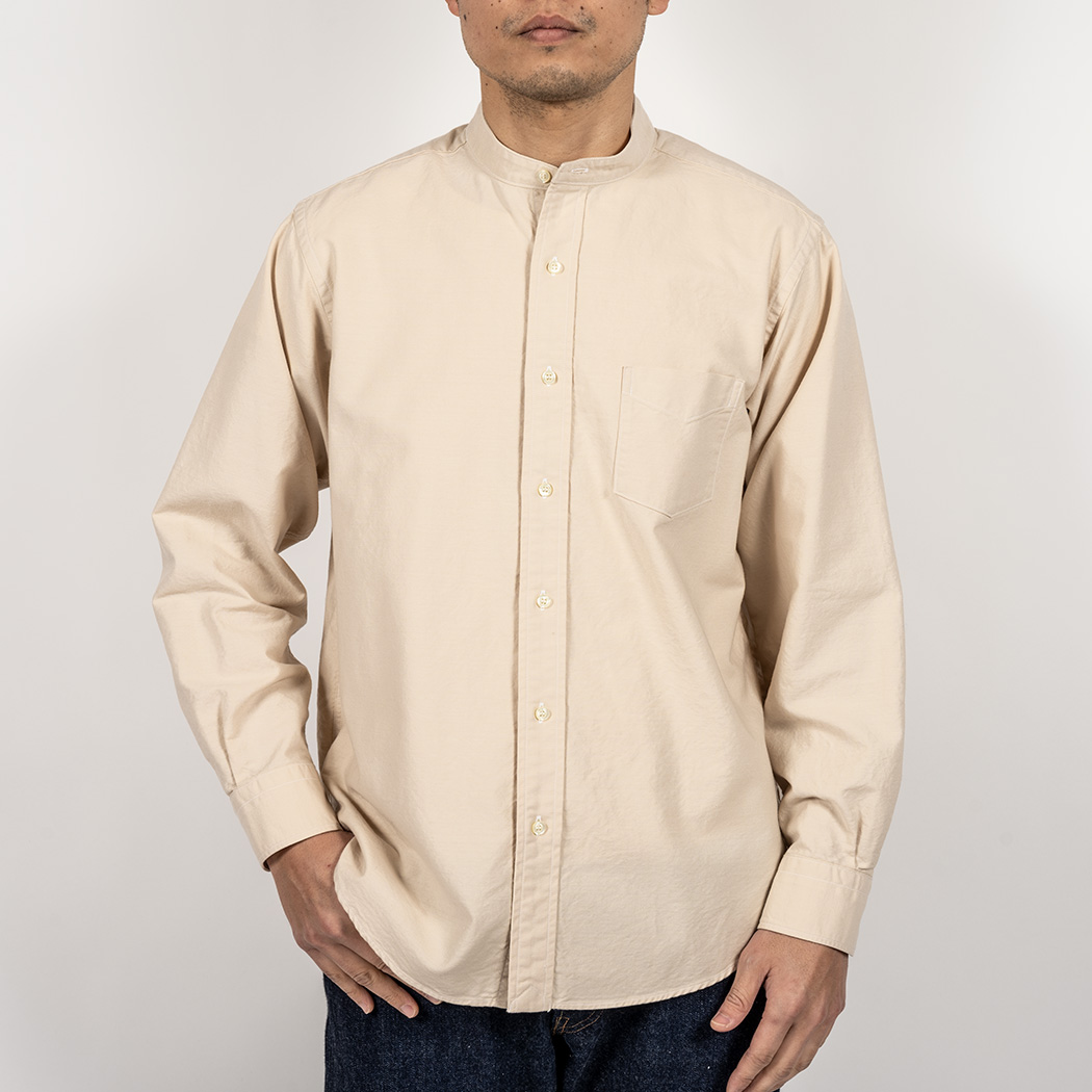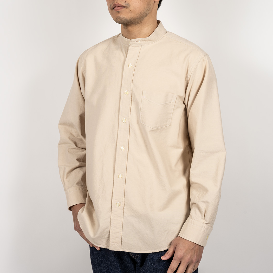WORKERS のバンドカラーシャツは今までビンテージの細い襟回り、フロントはラウンドで、丈も長く脇の切り上がりが