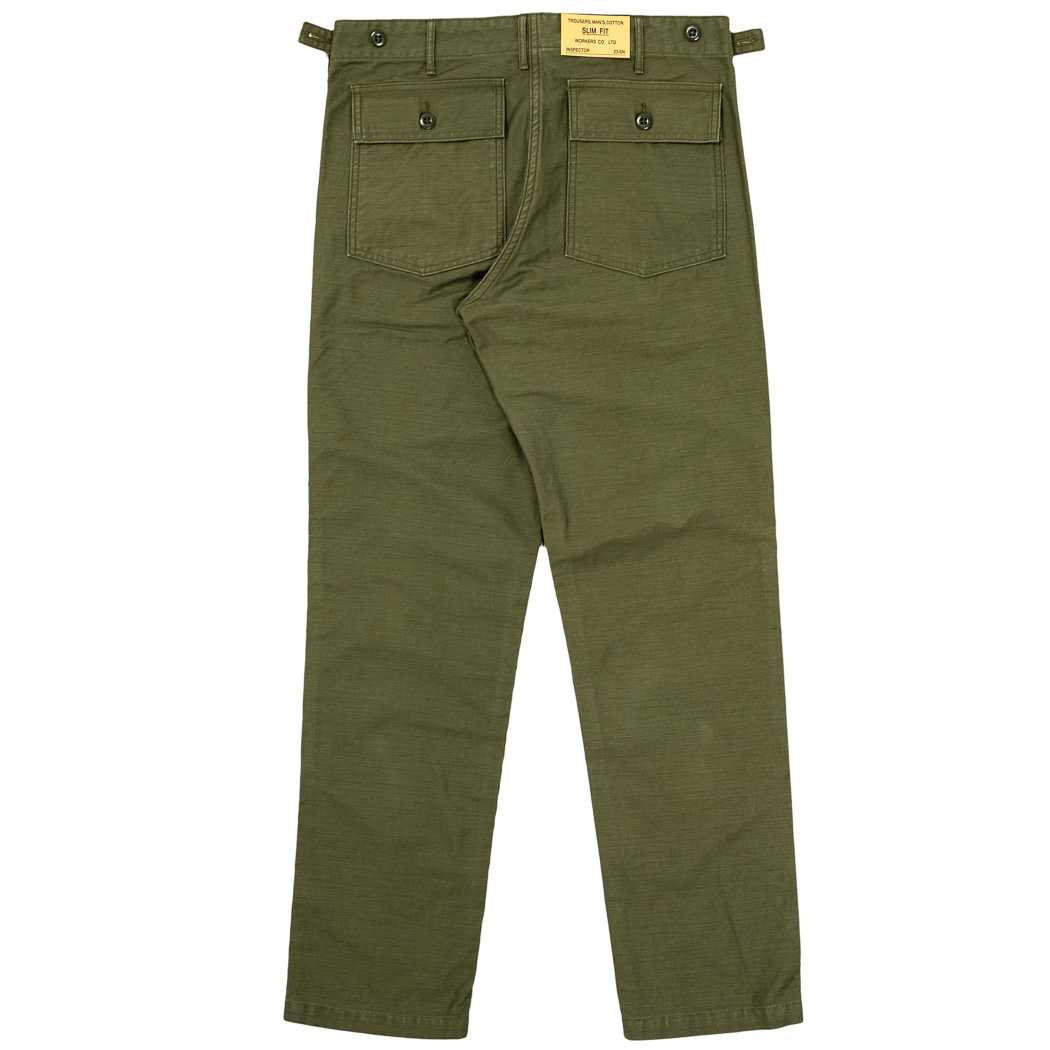 Slim Fit。仕様はTrace MIL-T-838Dをほぼそのままに。また上を浅く、フロントのボタンの個数を少なく。ワタリ・裾幅も狭く。Officer Trousers のSlim と同程度に。