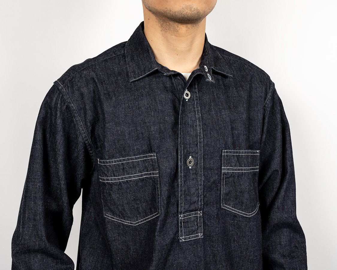少し引きで撮影するとプルオーバー前立てがわかります。デニムは白系ステッチ糸が映えるのでより派手。