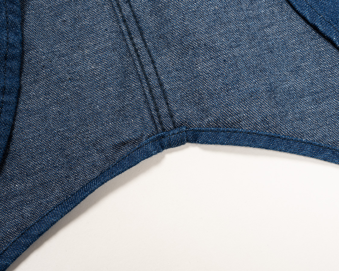 脇の巻縫い(ダブルステッチ)部分はかなり固くなるのですが、さすが、綺麗に縫ってくれています。この部分だけ、ラッパ(金具)をはずして縫い、説明だけ聞けば「できるわ」と思うでしょう。これが、そう簡単に出来ないのです。自分でサンプル縫ってた頃も、この裾巻きは難しくて、中々綺麗に縫えませんでした。縫い外れてしまったり、逆に深すぎたり。