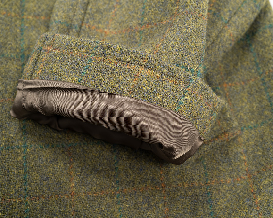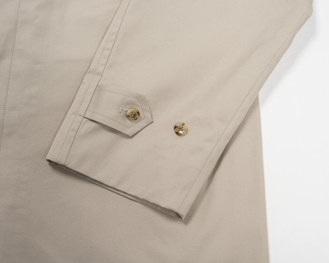 袖裏、ベンベルグ工場が火事で手に入らないので今期はポリエステルツイル。帯電はほぼ無いので、ぱちぱちしたりしません。また、洗った時の寸法変化もベンベルグより小さい。ベンベルグは縮みます。多少縮んでも良いようにゆとりはとっていますが。