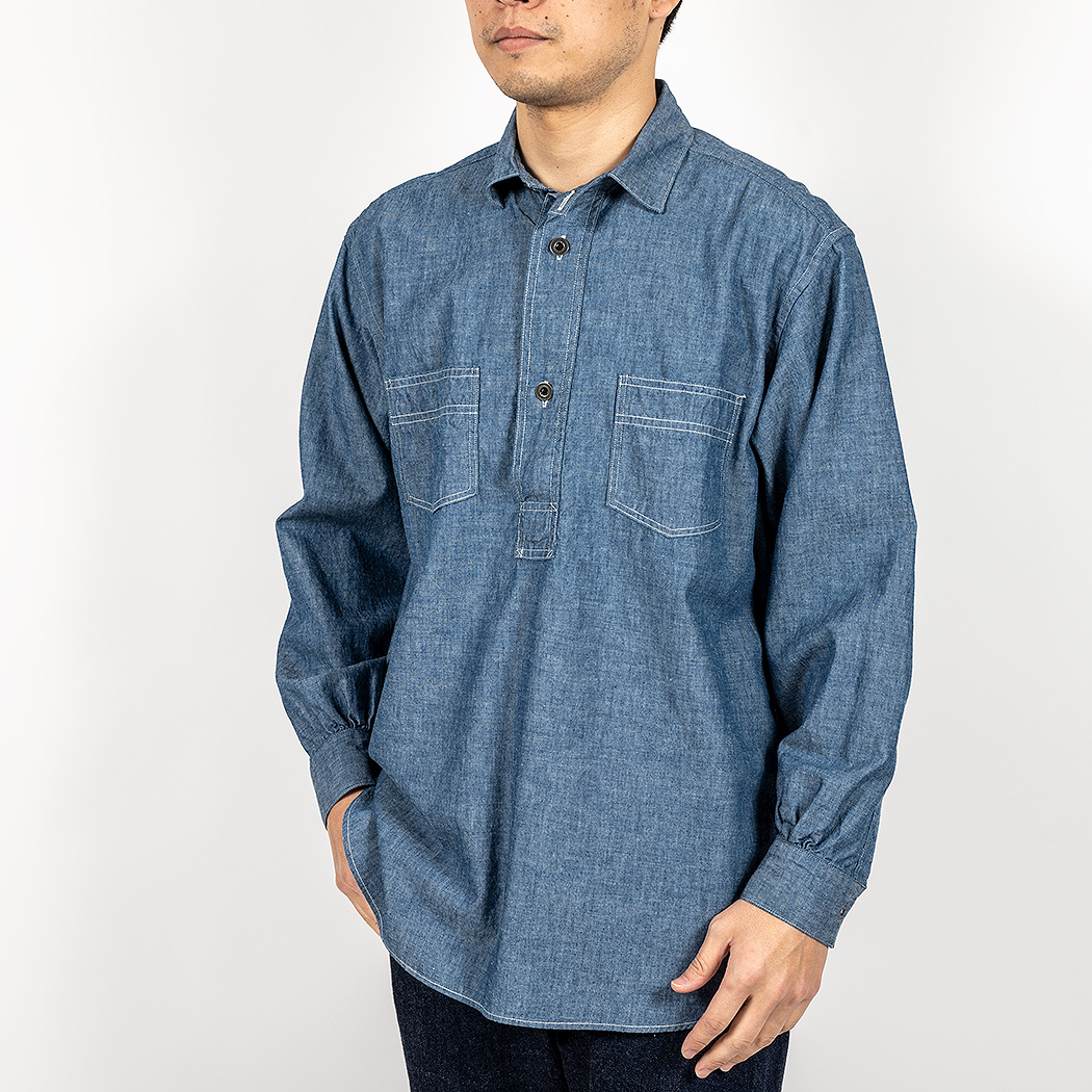 シャンブレー、5.5 オンス。通年着られる重さ・厚み。春から初夏は袖をまくって。真夏は1枚で。秋冬はインナーに。