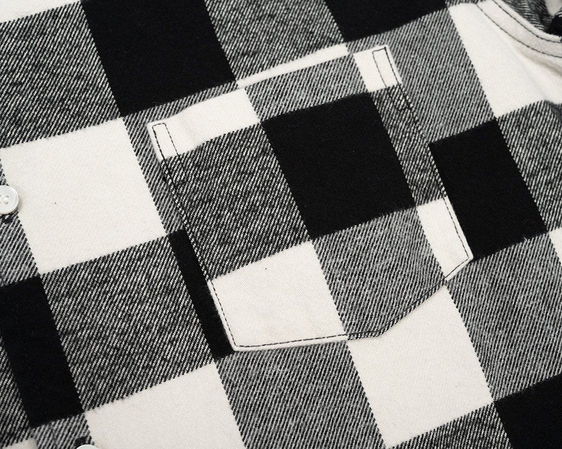 対して、ホワイト・グレーのチェックは思いっきりひっかいて起毛。かつ、打ち込み(タテヨコの糸本数)も多いのでガチガチ系のネル。着こんで腰が抜けていく。