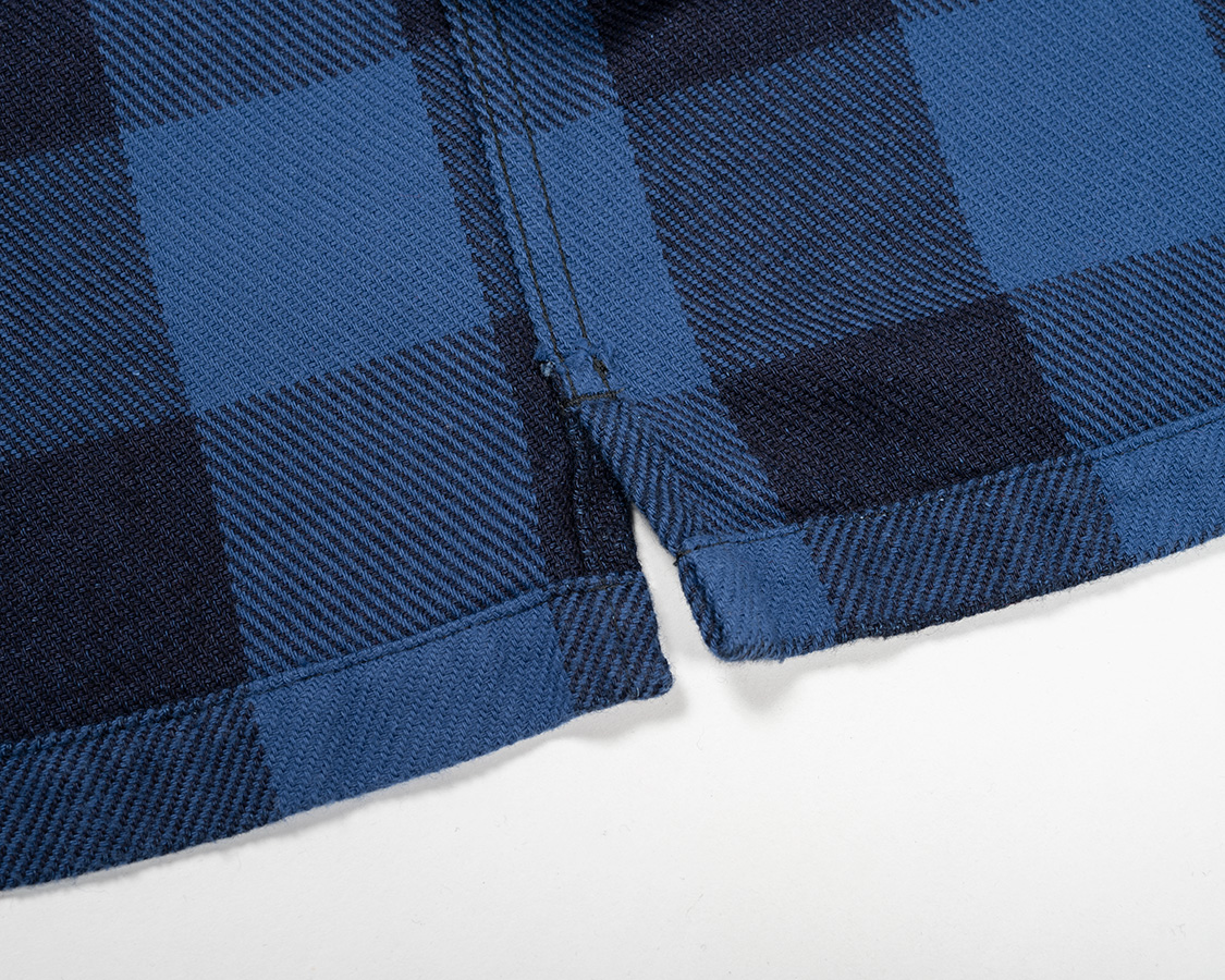 脇は巻縫い、お互いを噛みあうように折ってチェーンステッチで縫う。開きの位置は一部断ち切りがあります。