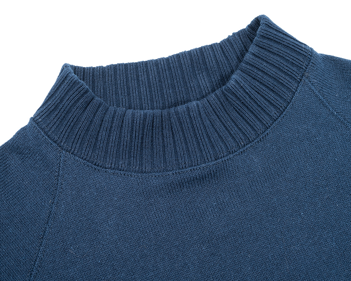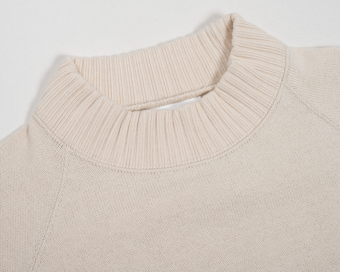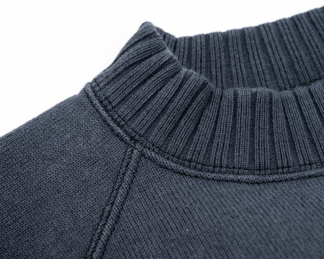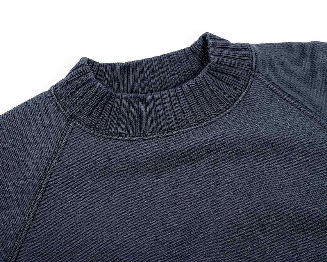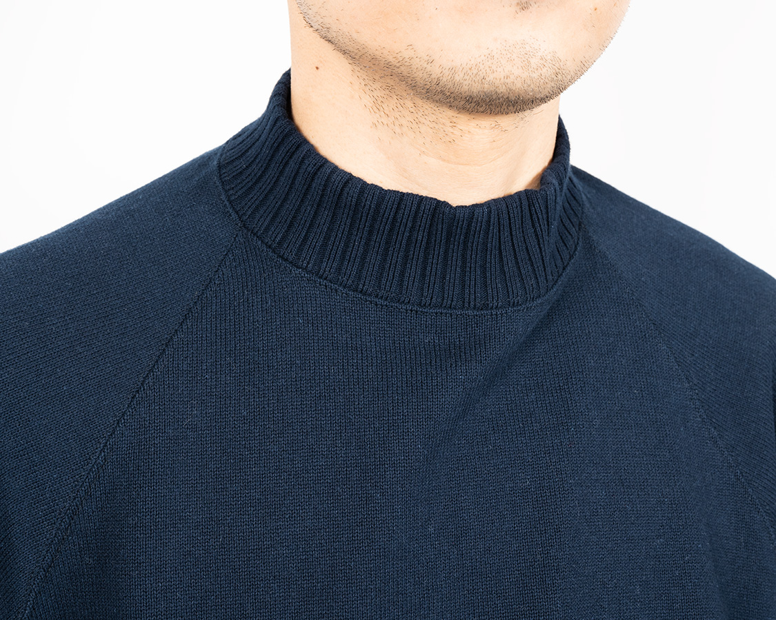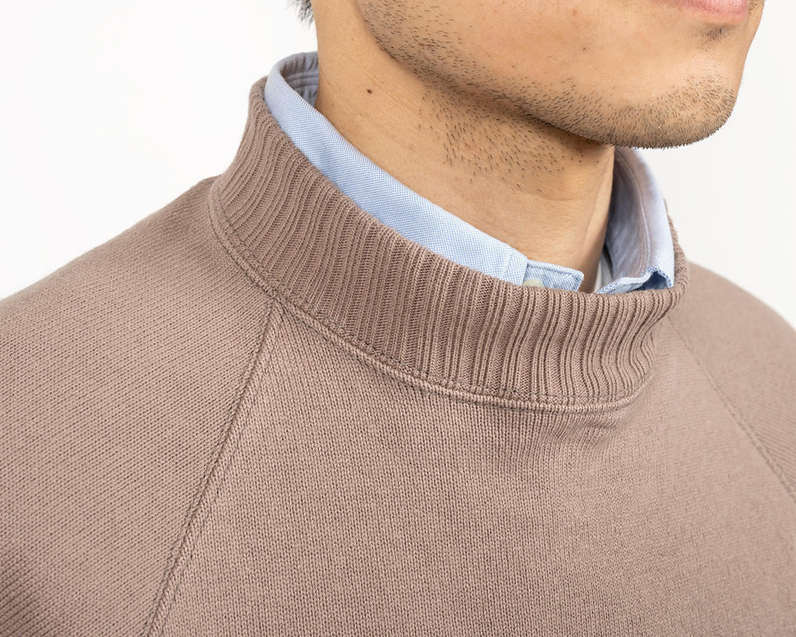 Raglan Cotton Sweaterは中にシャツも着られるよう、首元はちょっとゆとりがあります。