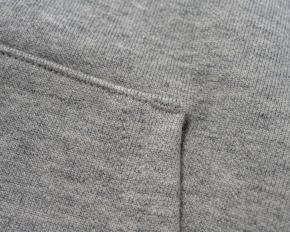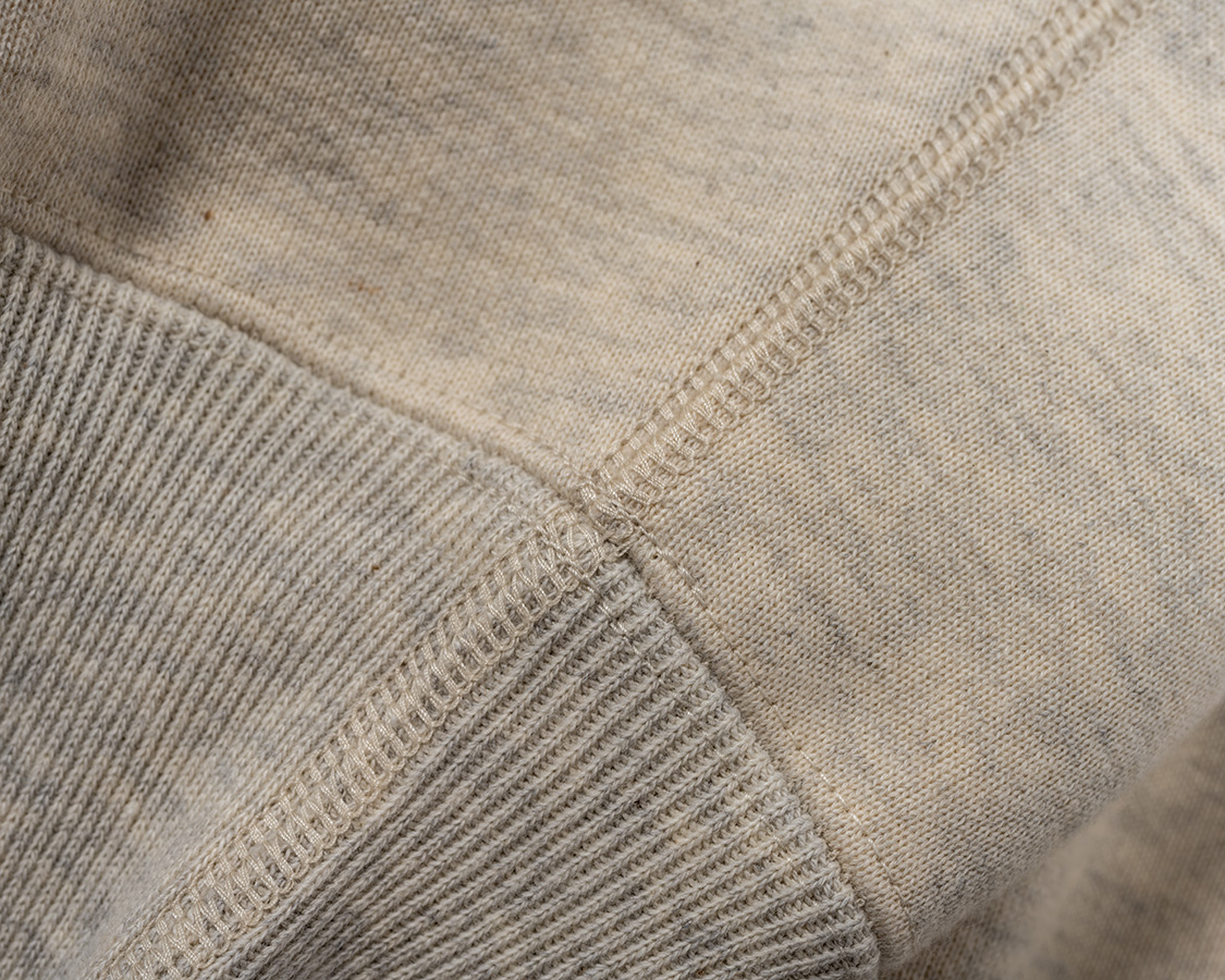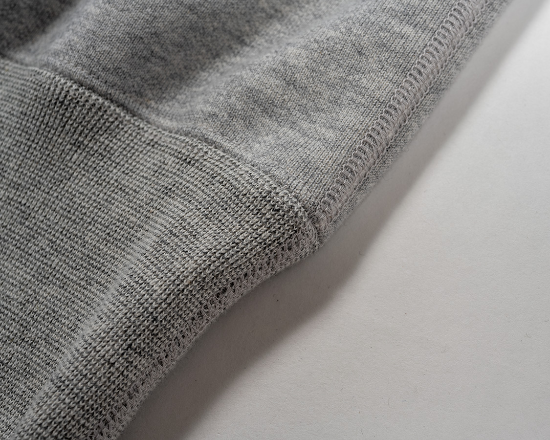 身頃、リブ、それぞれの継ぎ合わせはフラットシーマー。身頃・リブの継ぎはオーバーロックでついでから、マタギ・裏振り。表にはダブルステッチしか見えませんが、裏はロック目+扁平縫いと、二度縫いされています。